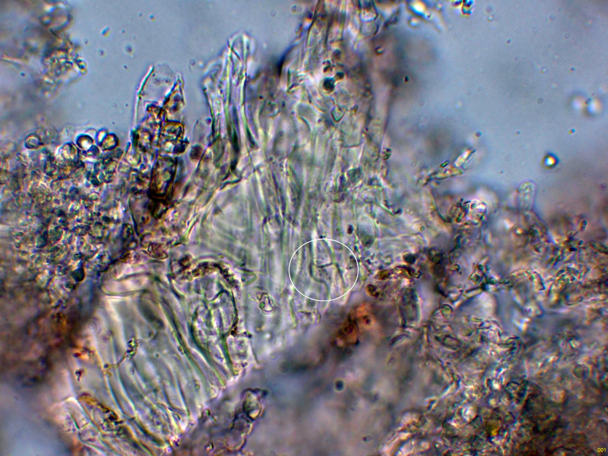 Las hifas subhimeniales, con fíbulas de difícil observación: