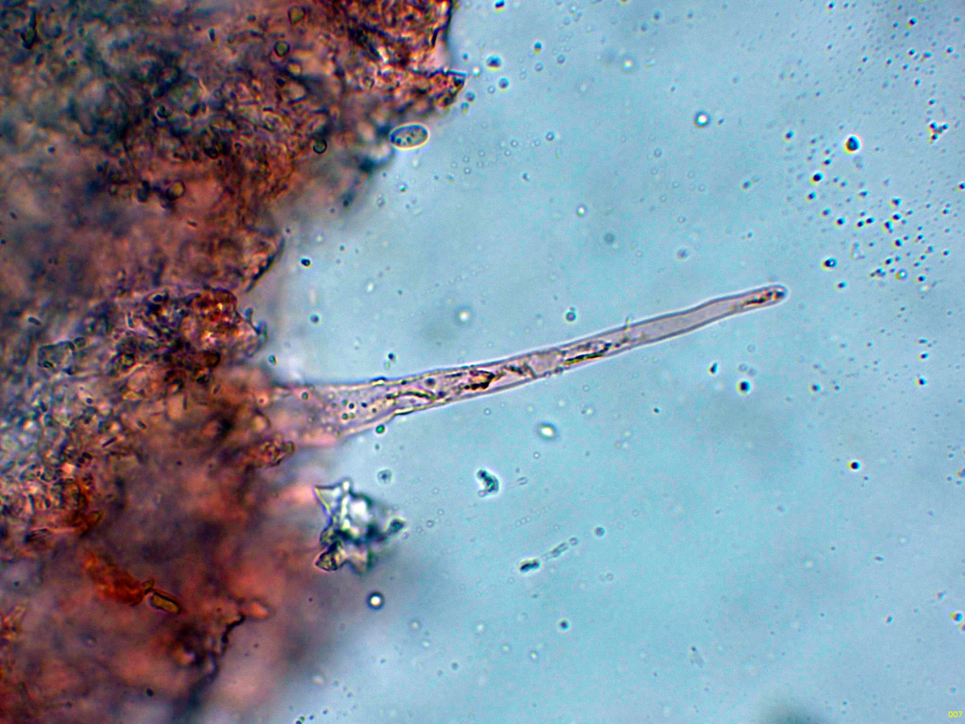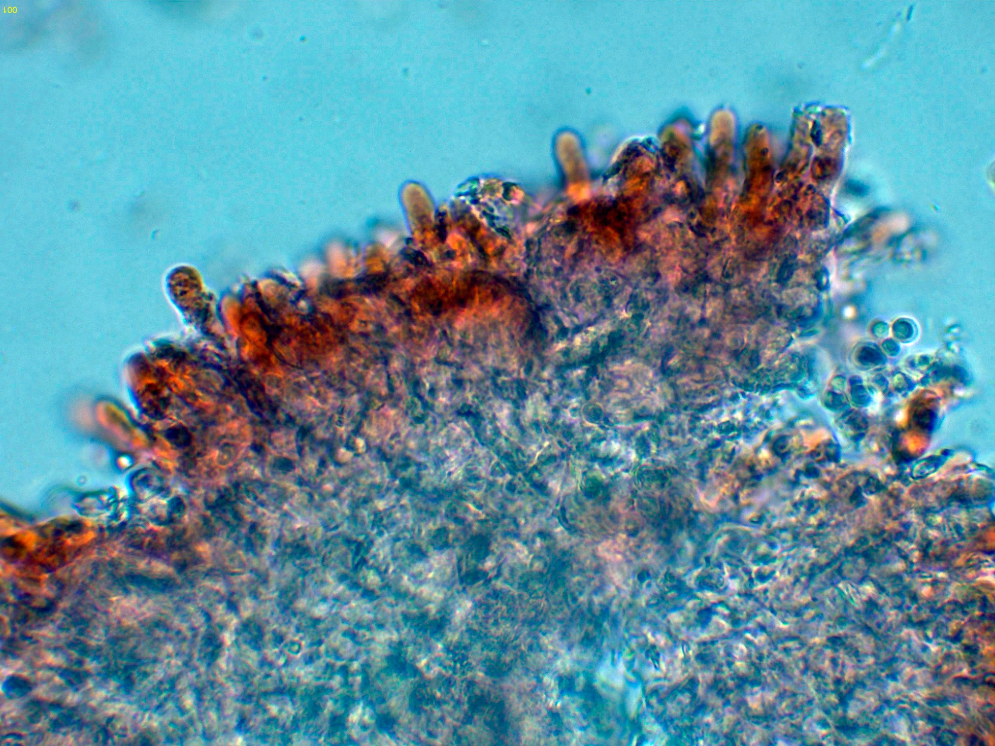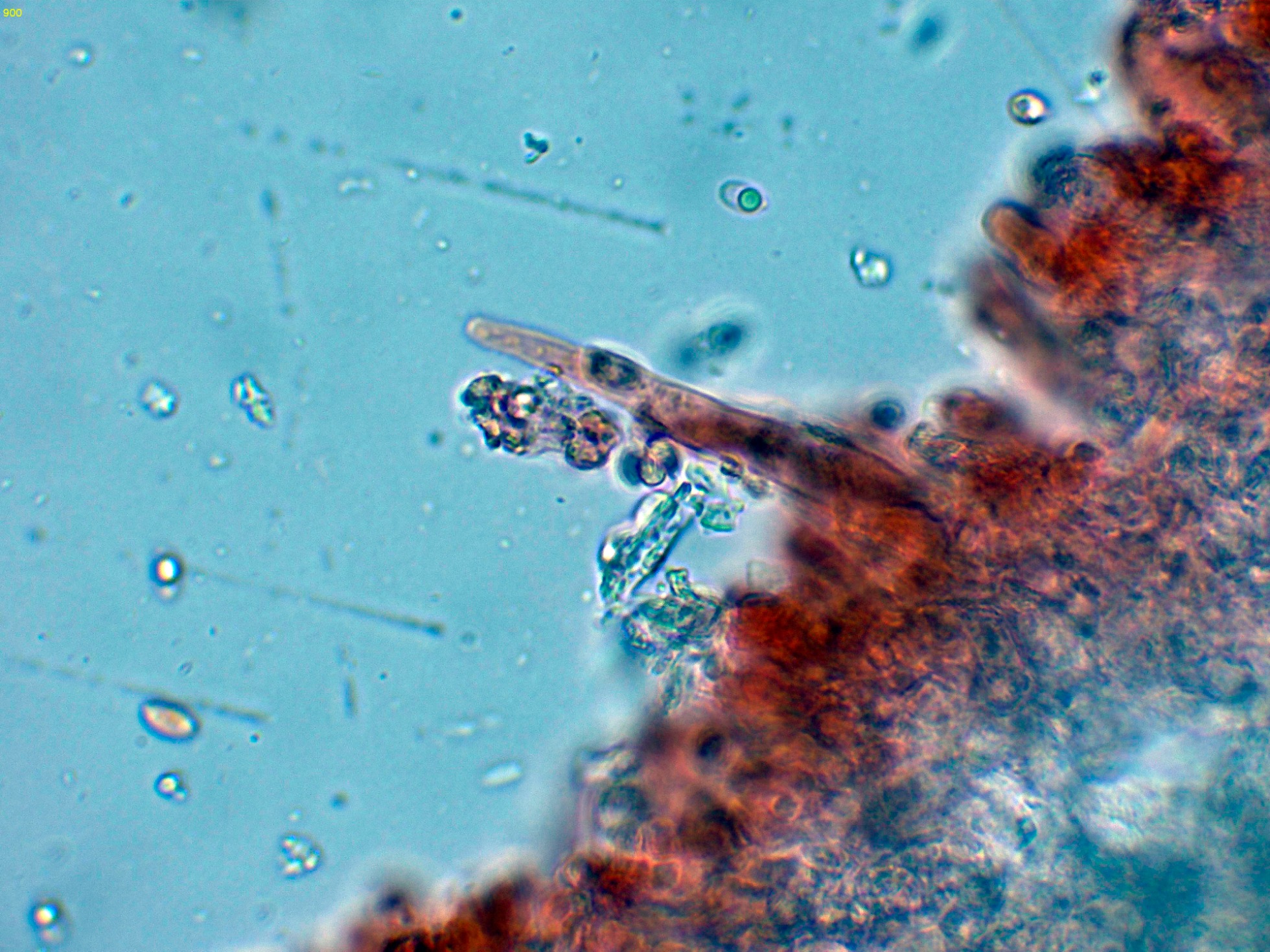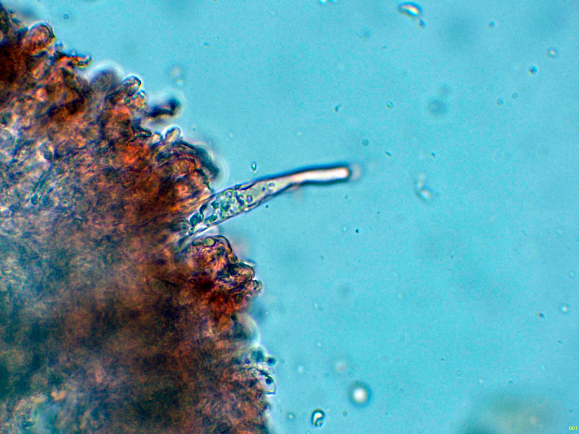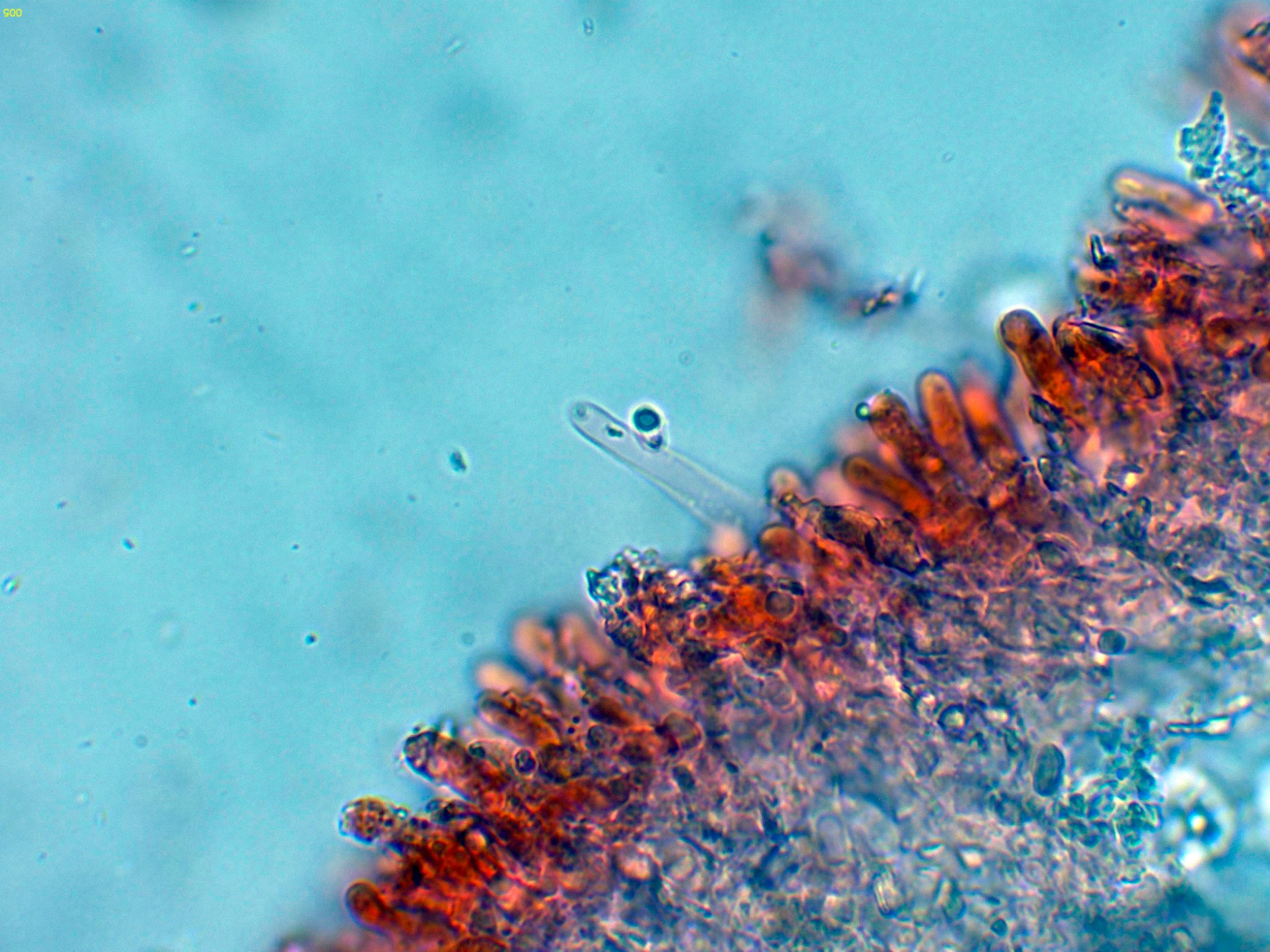 Cistidios dispersos, hialinos, cilíndricos, ensanchados en la base y terminando con formas redondeadas, con unas medidas de (43.5) 47 - 74.4 (92.5) × (6.4) 7.3 - 11.6 (16.4) µm.: