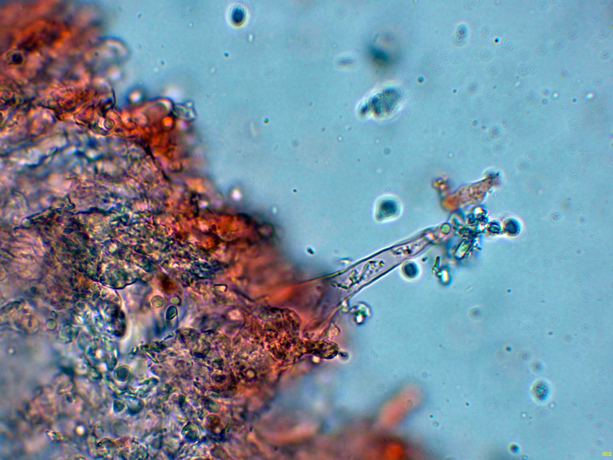Las hifas subiculares en solución de Rojo Congo diluido, con hifas minuciosamente incrustadas: