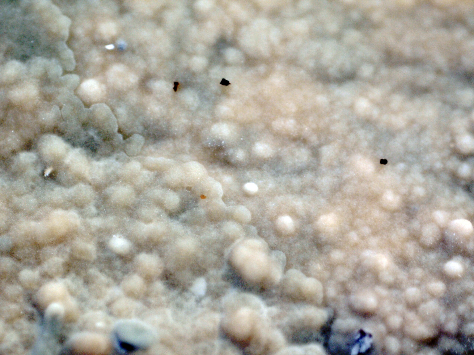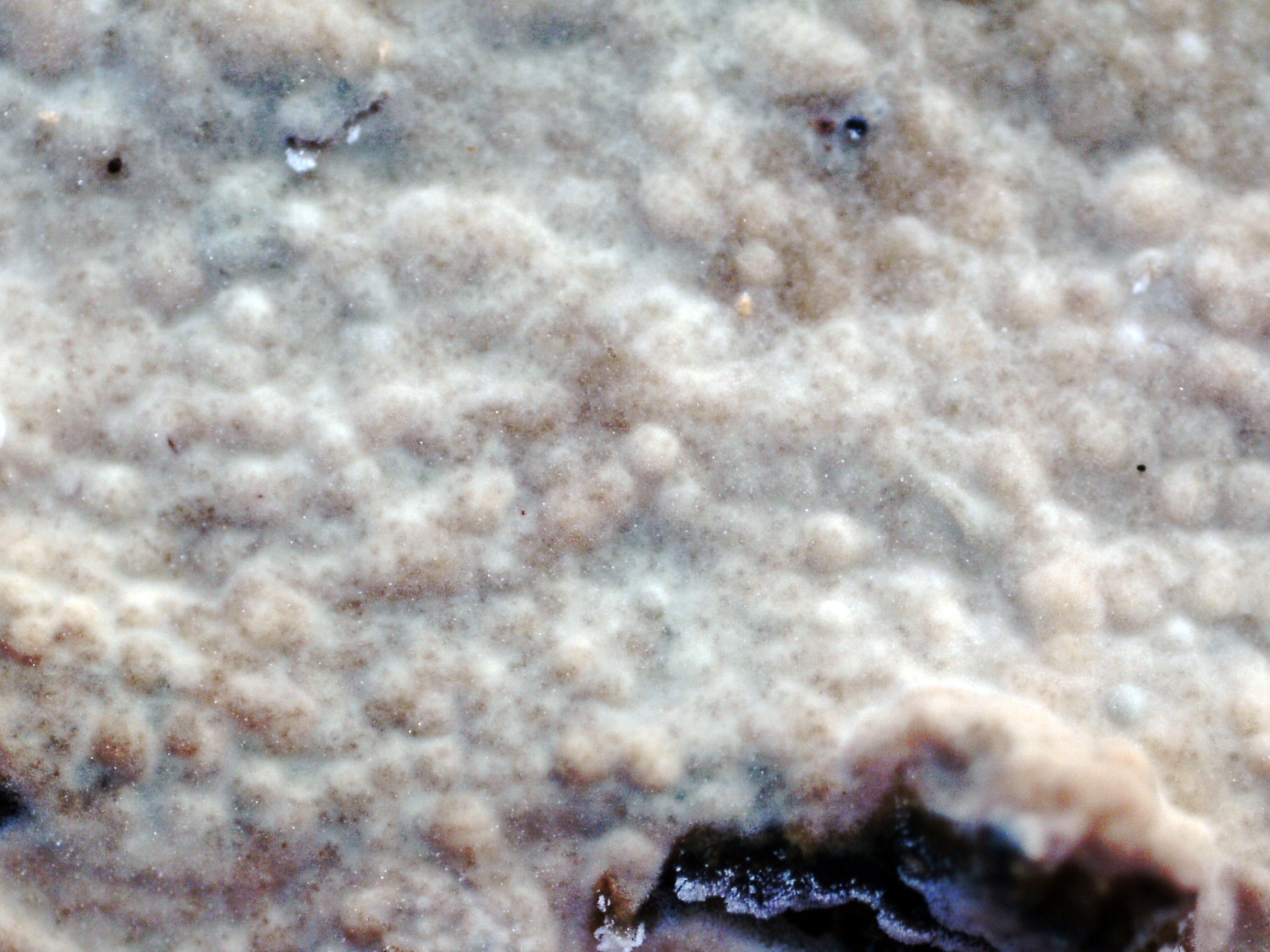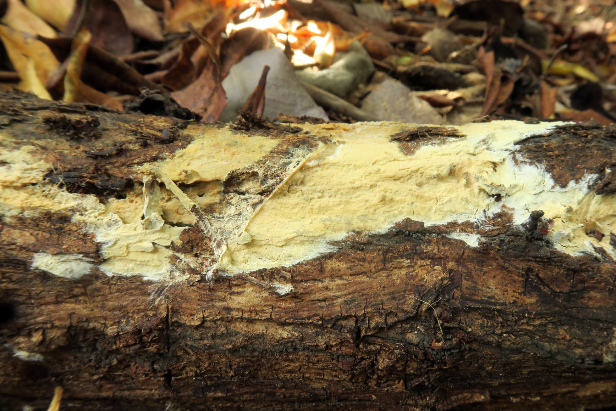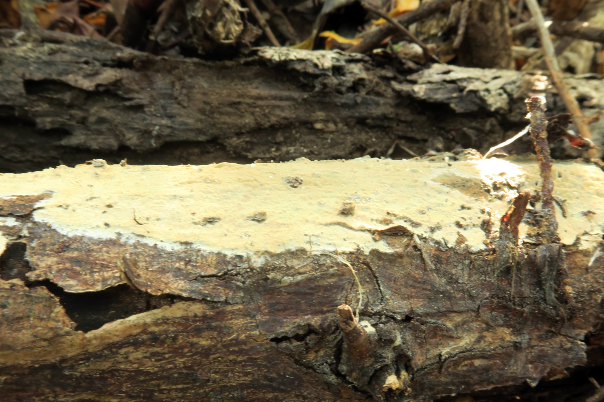Un Corticial de color crema con el borde de crecimiento blanquecino, brotando de manera masiva sobre la superficie de un tronco tumbado de planifolio indeterminado, en la parte que está en contacto con el suelo.