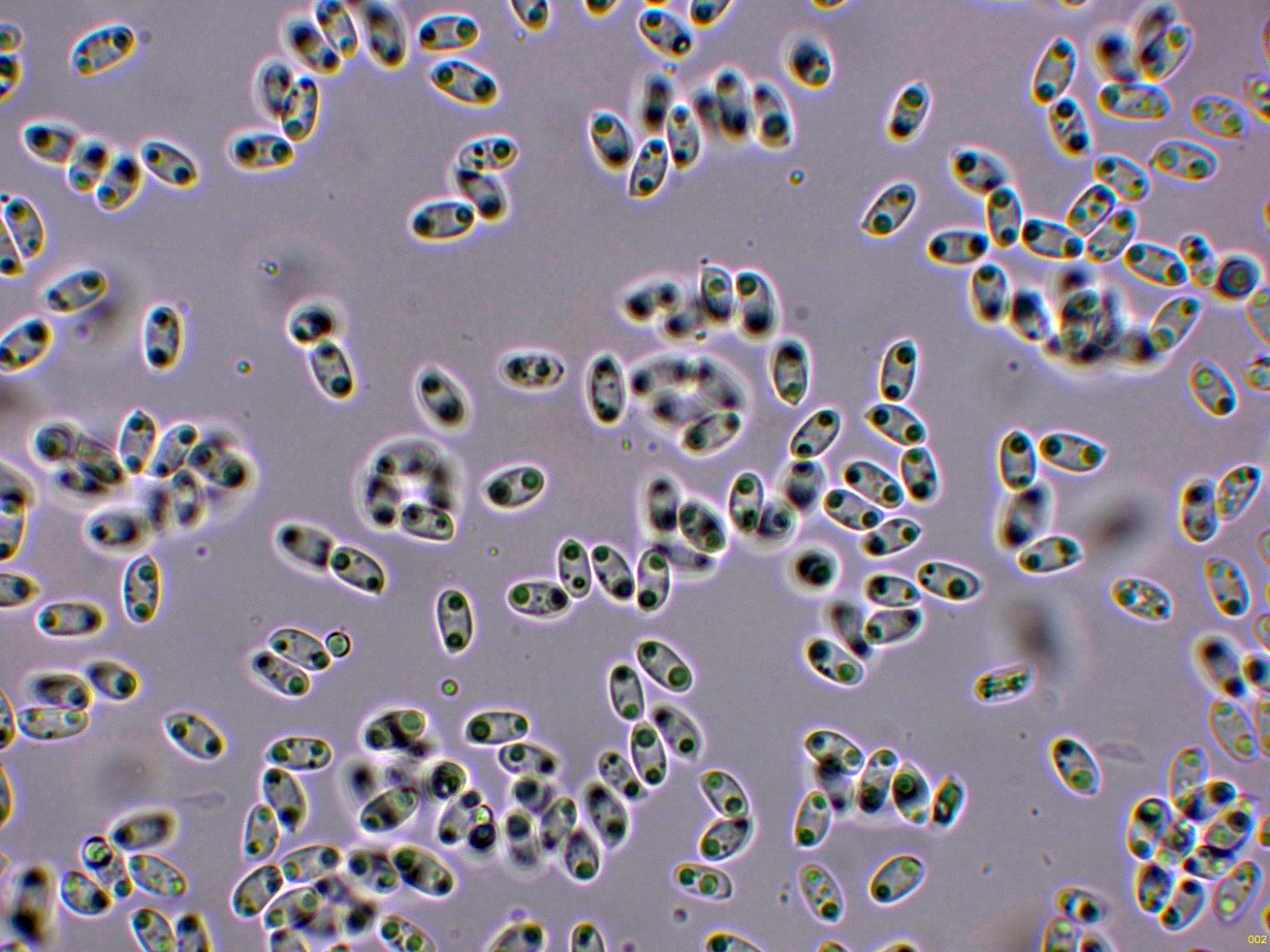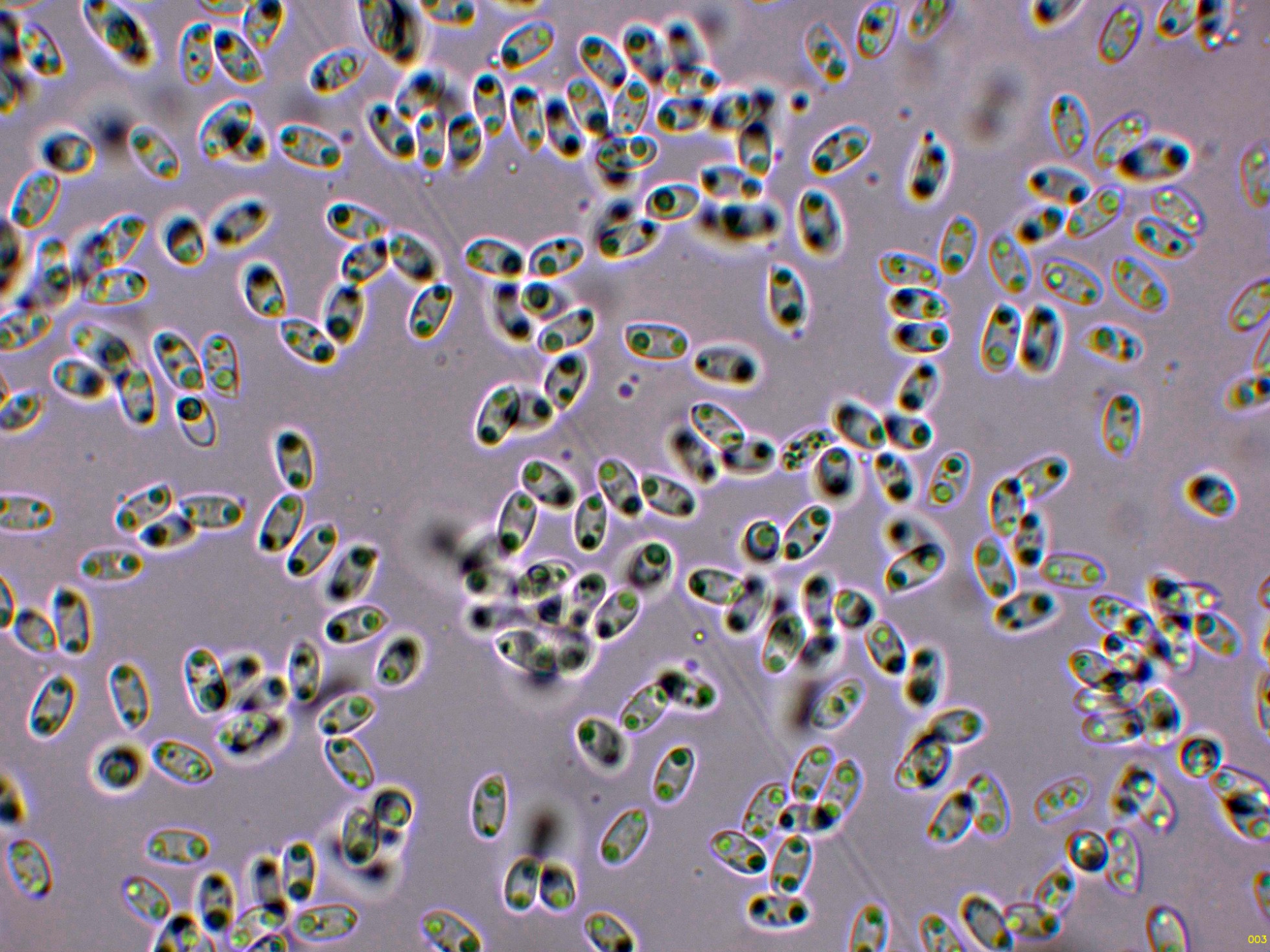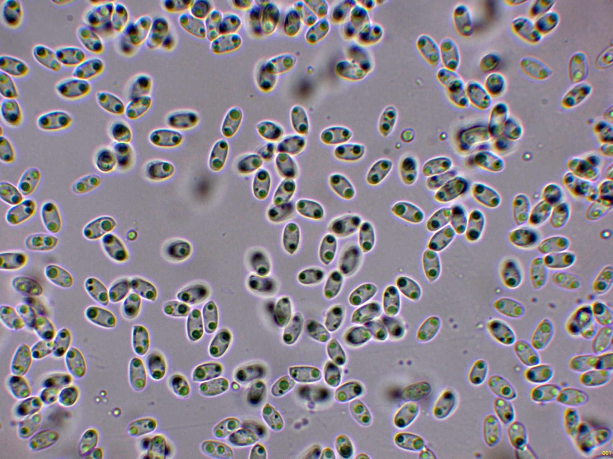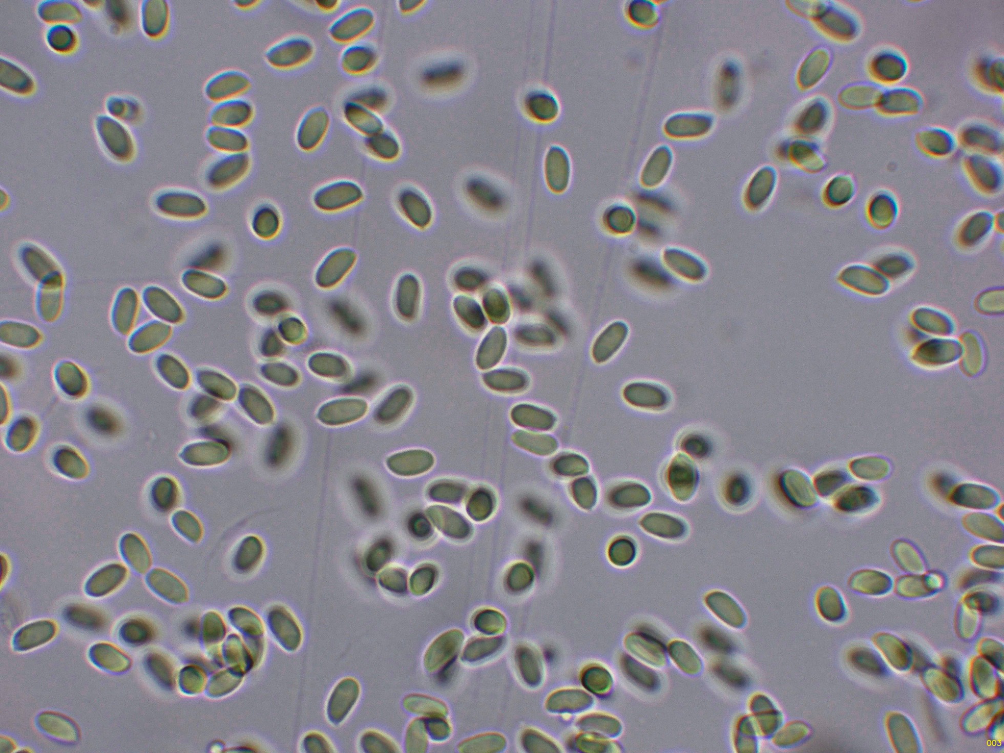 Las esporas en agua, estas esporas hialinas, elipsoidales, con una discreta apícula lateral y mayoritariamente con dos gruesas gotas lípidas en su interior: