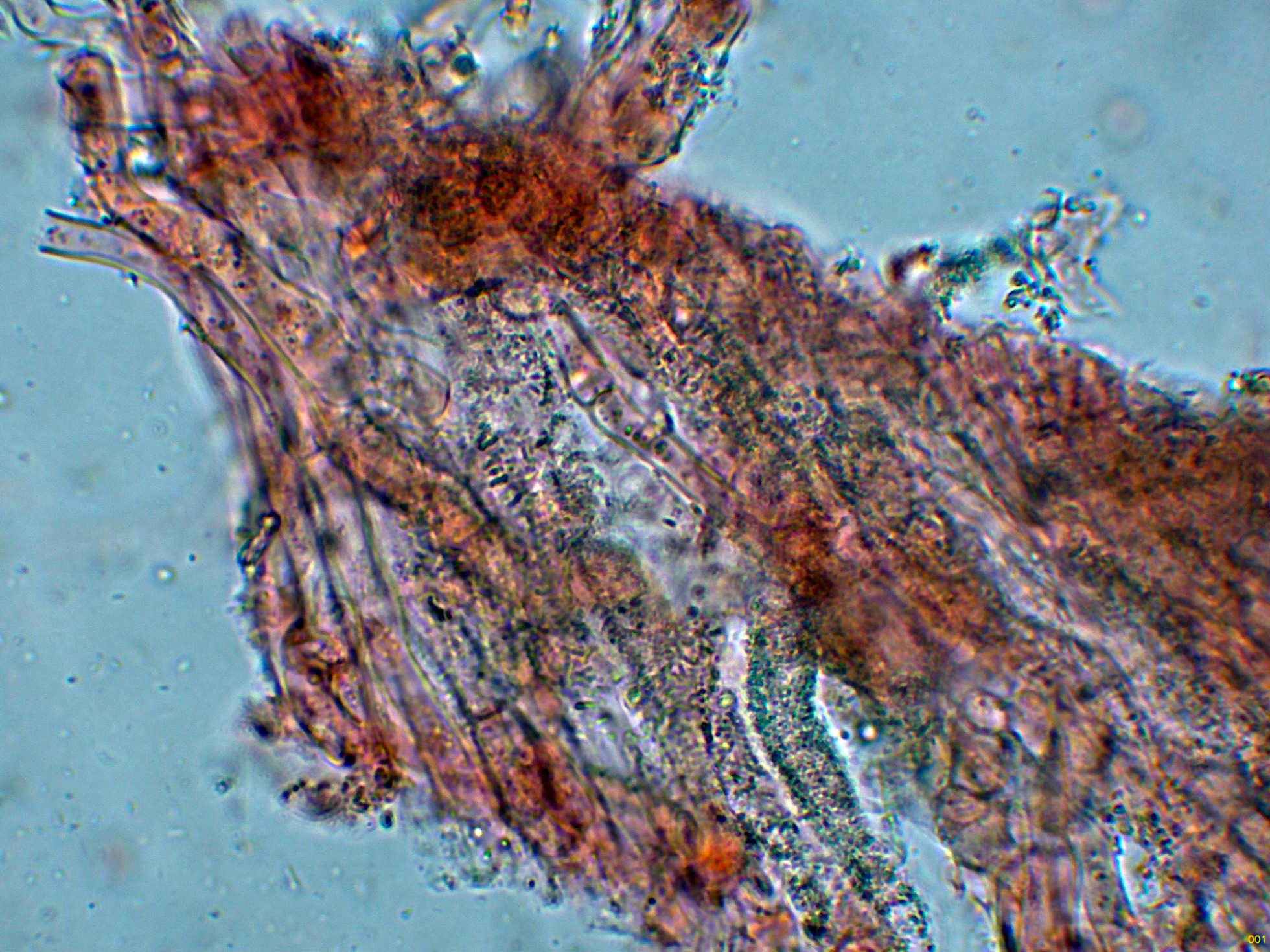 Superficie del basidioma que vira a marrón rojizo oscuro al instante al aplicar KOH al 10%.