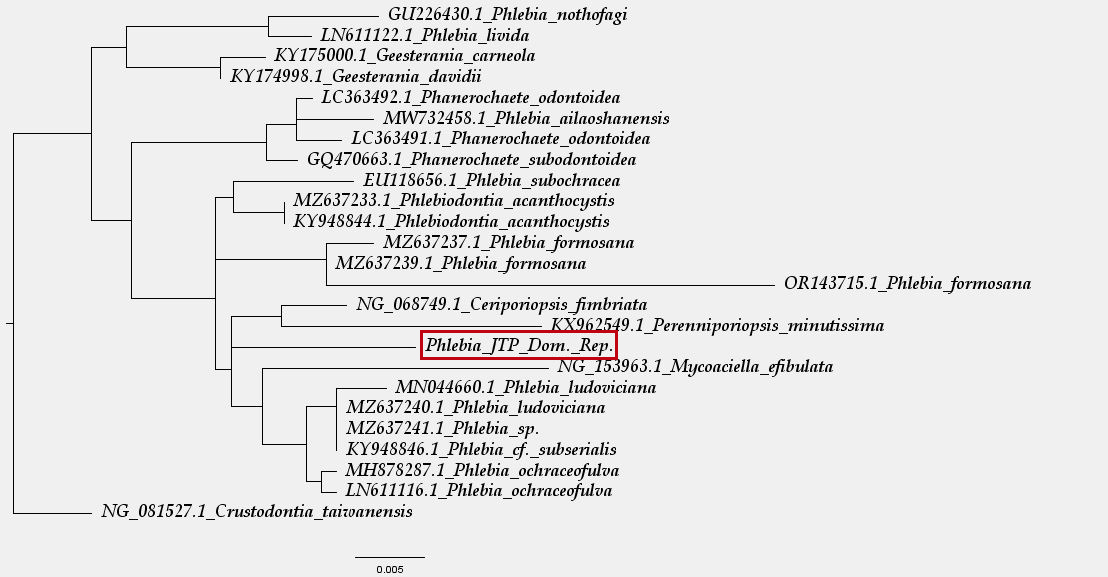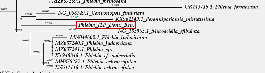 Aquí mi especie ya se encuentra en una rama separada del complejo de Phlebia, y en un punto cercano a nivel molecular a géneros como Ceriporiopsis y Perenniporiopsis, que no se parecerían en nada a nivel microscópico y por supuesto tampoco macroscópico a mi propuesta.