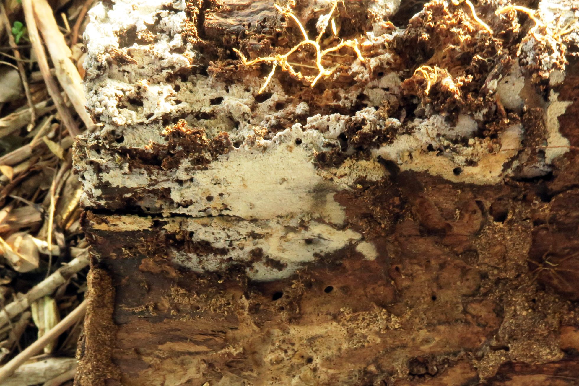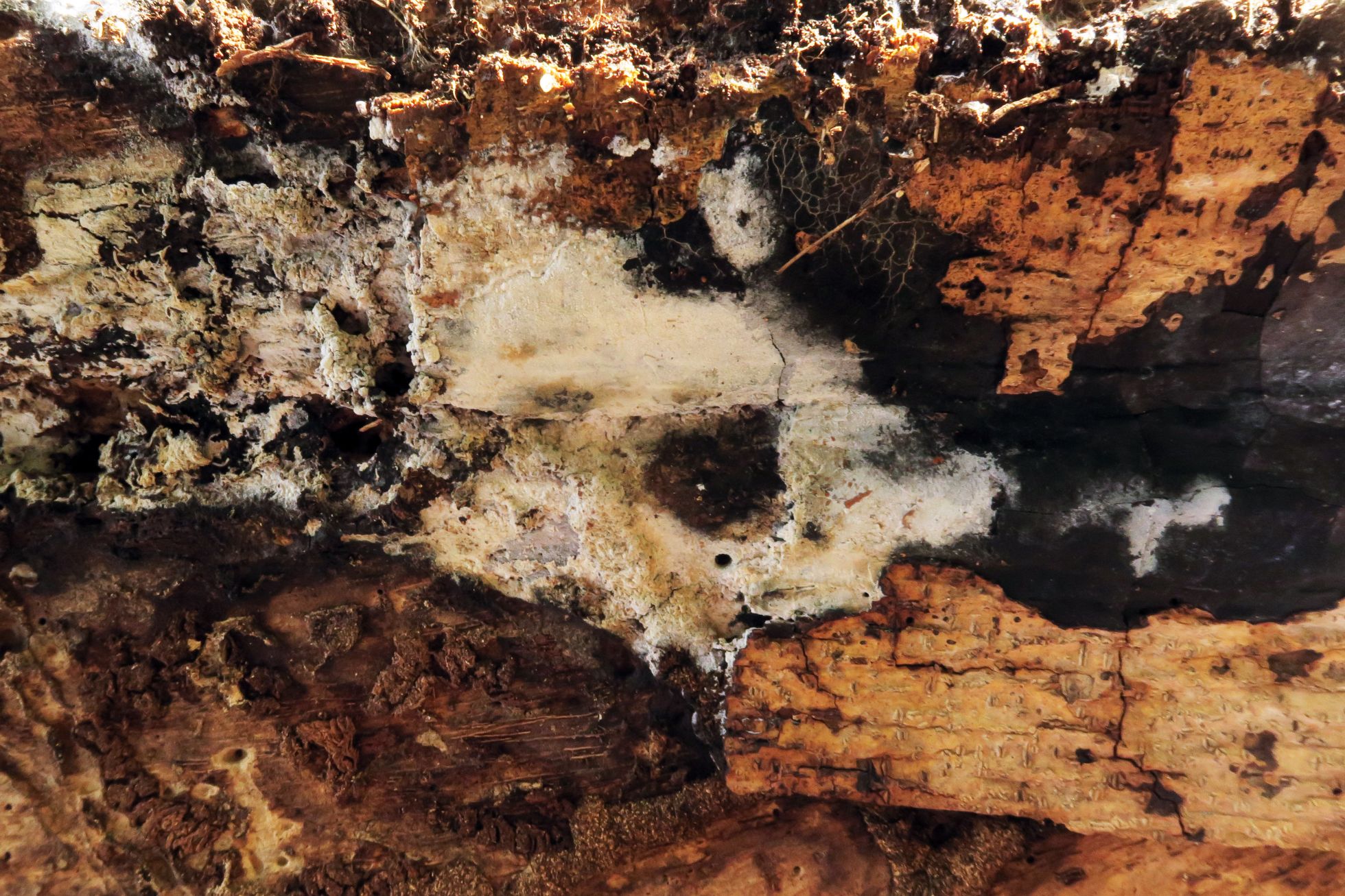 Los basidiomas brotando directamente sobre la parte interior de una corteza de un tronco tumbado del suelo: