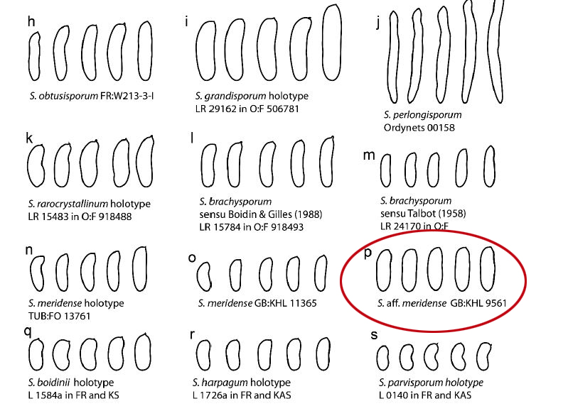 En la imágen podemos observar a la izquierda las esporas del holotipo del Subulicystidium meridense y encima de esta y en la parte central de la imágen, las esporas del Subulicystidium brachysporum con una longitud que varía en función del autor consultado, pero muy acorde con las medidas de las esporas del presente estudio, aunque con una anchura sensiblemente por debajo del Subulicystidium aff. meridense, en el mismo documento se citan unas medidas esporales para el Subulicystidium brachysporum de 7.5–10 × 2–2.5 μm.
