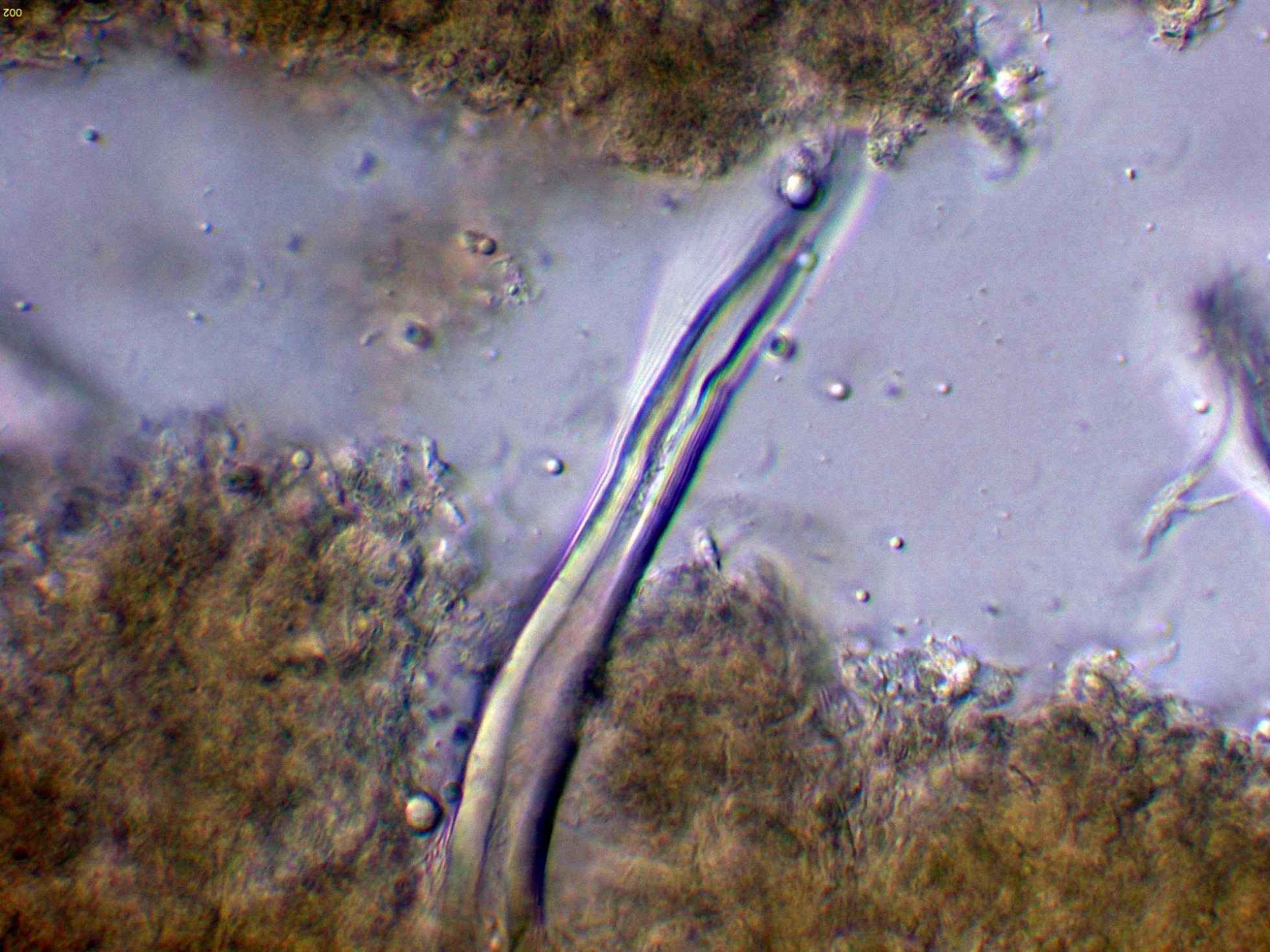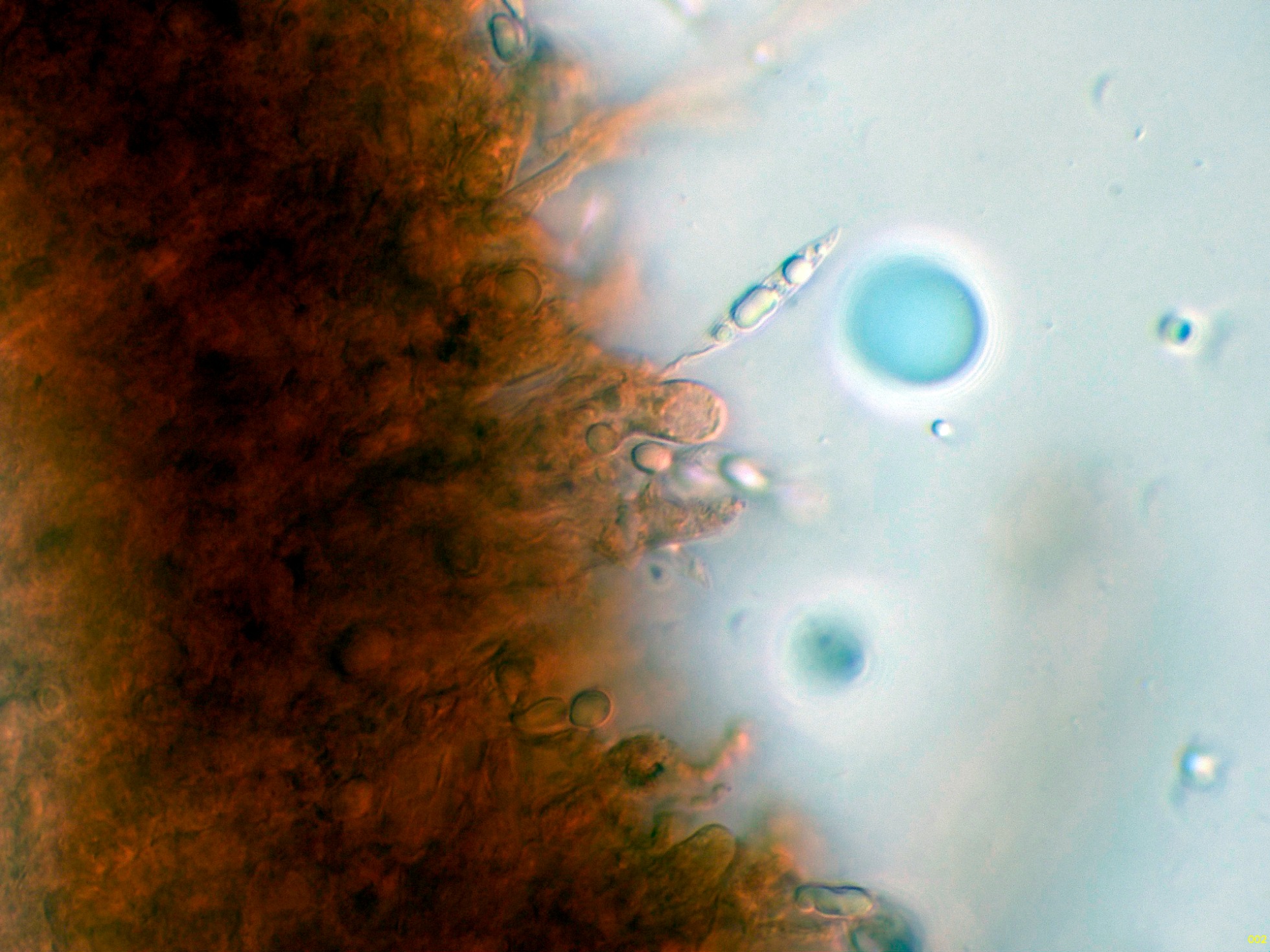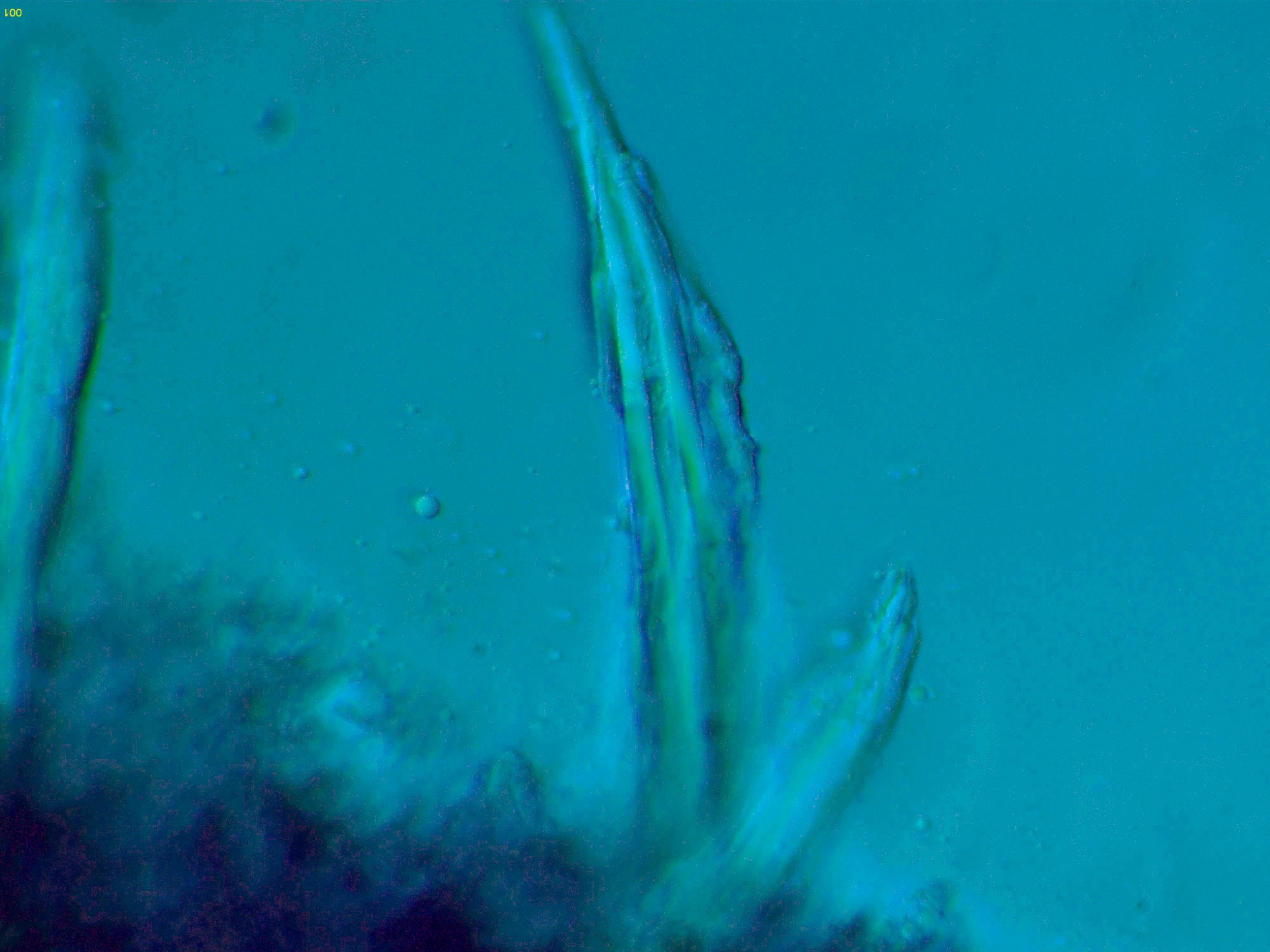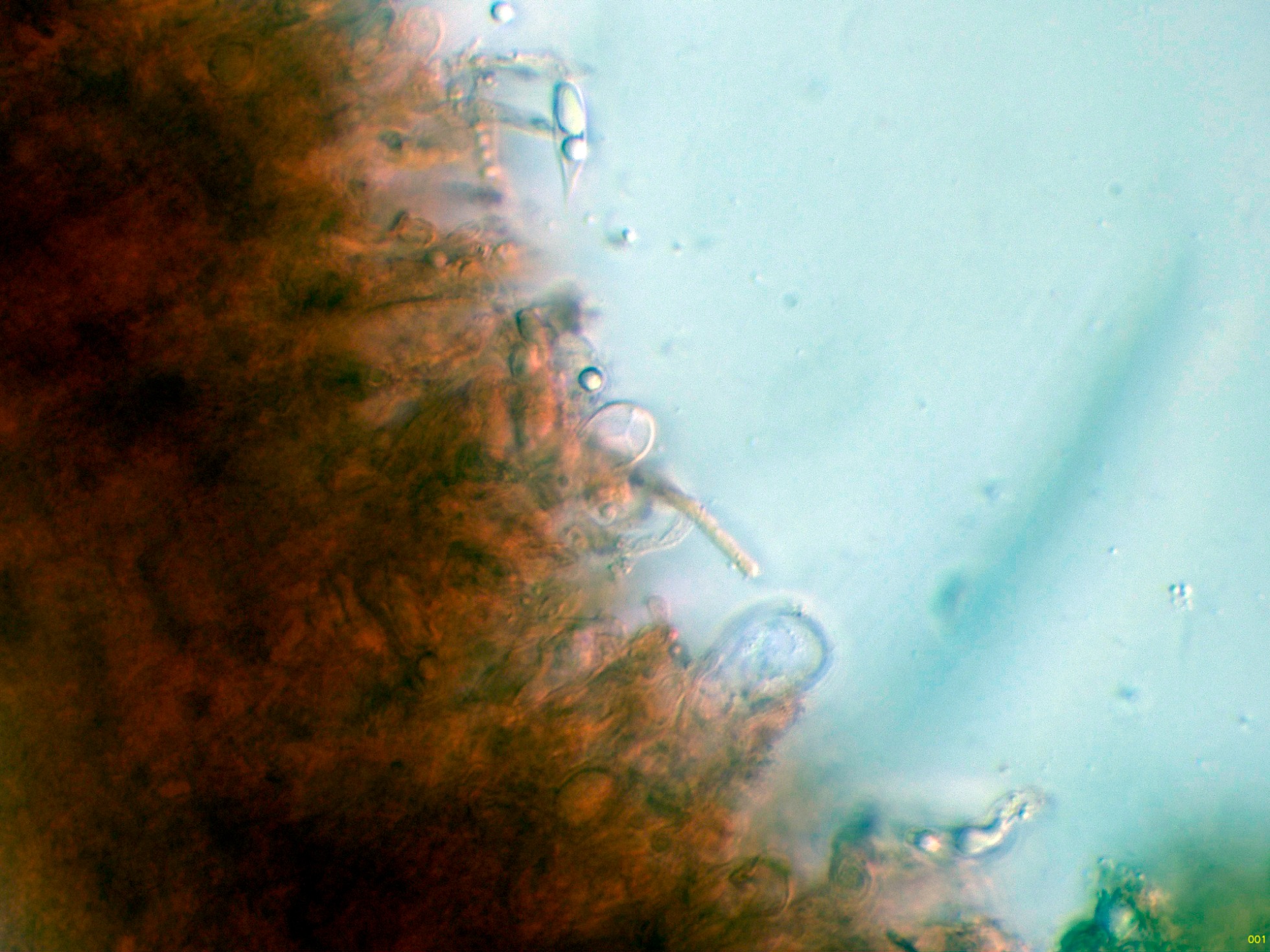 En la bibliografía de la especie se cita una materia amorfa formada por hifas dendroideas estrechas en la superficie de los cistidios, estas hifas solo me parece apreciarlas en la base del cistidio de la primera imágen en solución de Rojo Congo, para poder observar mejor esta sustancia decidí probar utilizando el Azul de Lactofenol, y ejerciendo poca presión sobre el cubre, dejo un par de imágenes con el resultado: