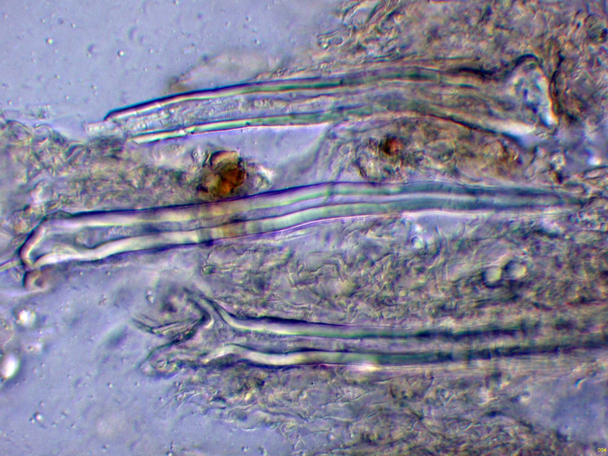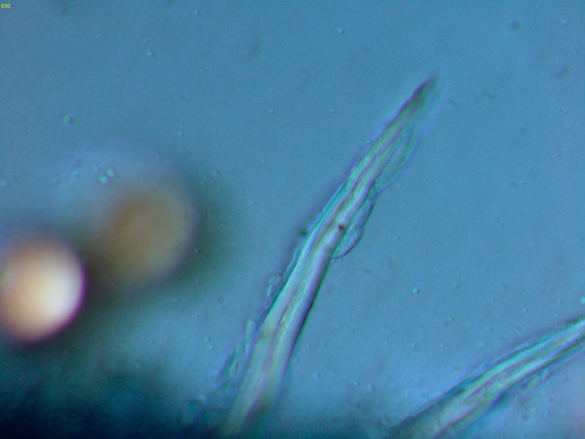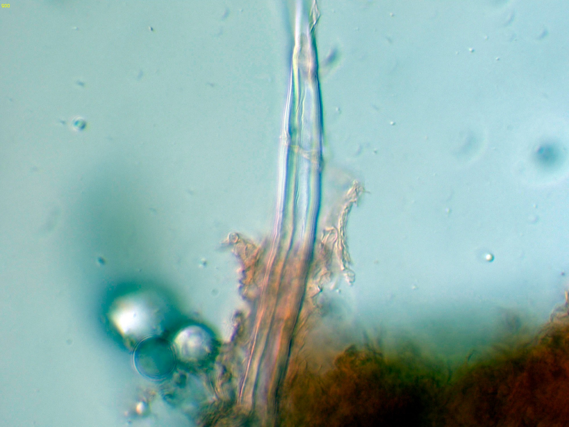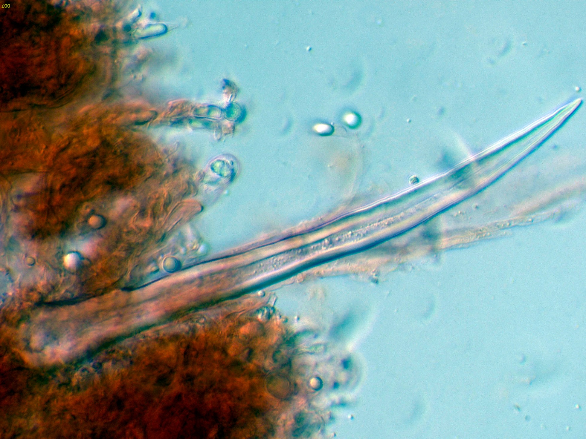En la bibliografía de la especie se cita una materia amorfa formada por hifas dendroideas estrechas en la superficie de los cistidios, estas hifas solo me parece apreciarlas en la base del cistidio de la primera imágen en solución de Rojo Congo, para poder observar mejor esta sustancia decidí probar utilizando el Azul de Lactofenol, y ejerciendo poca presión sobre el cubre, dejo un par de imágenes con el resultado: