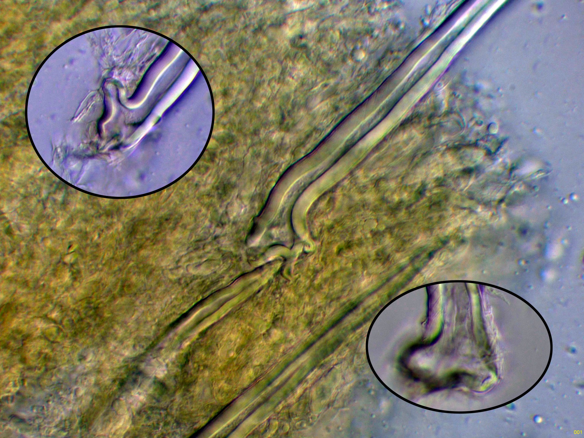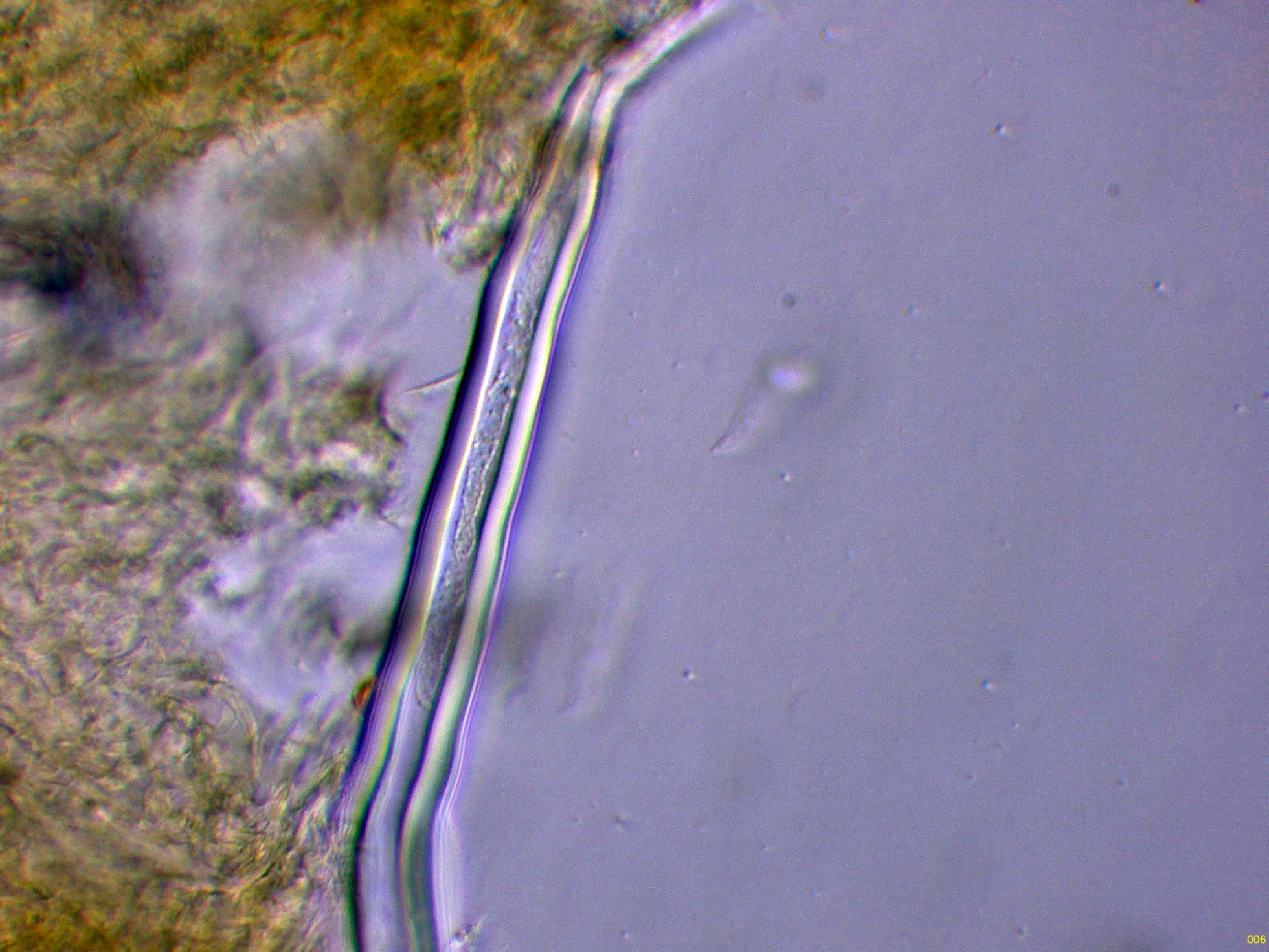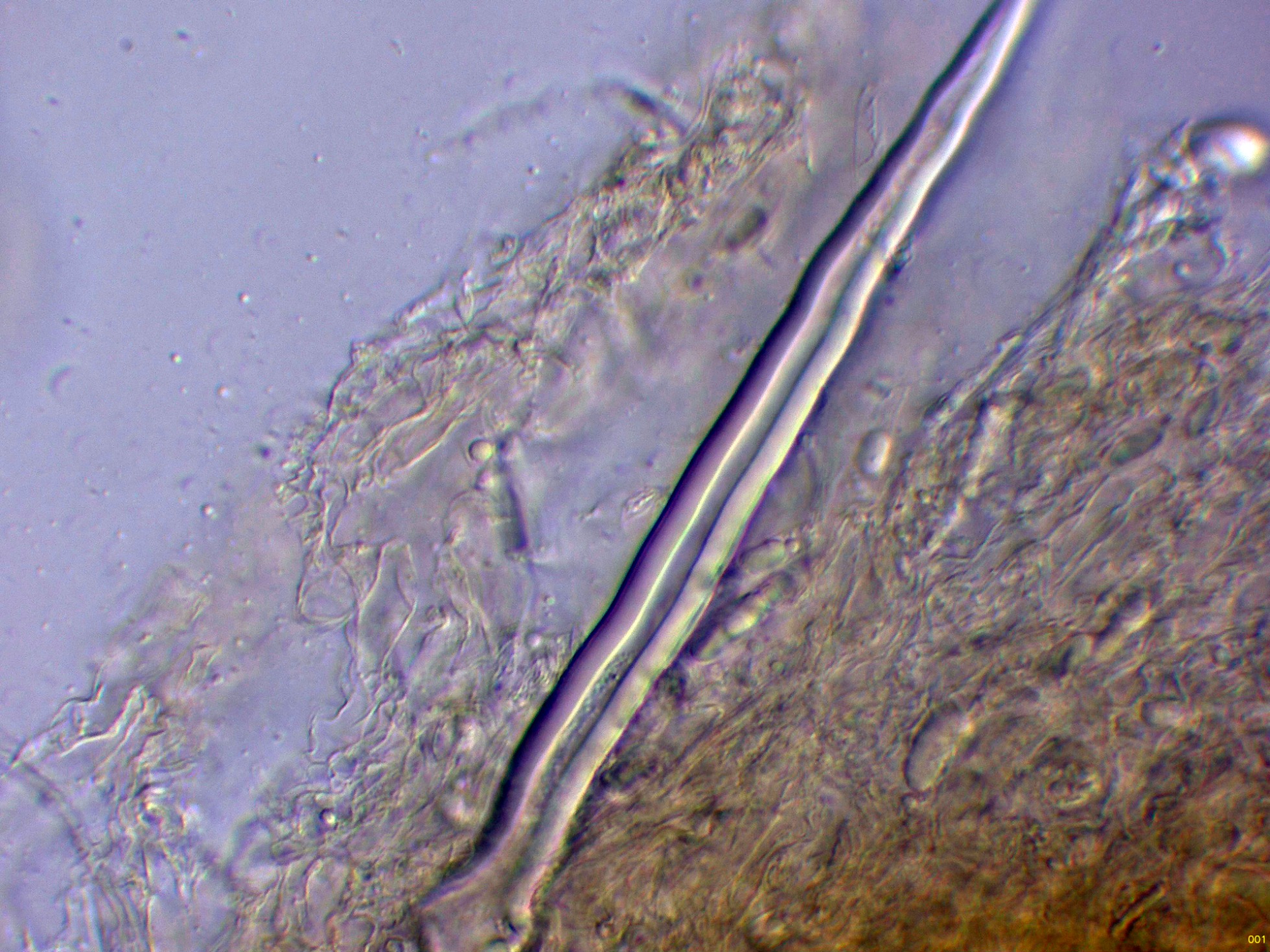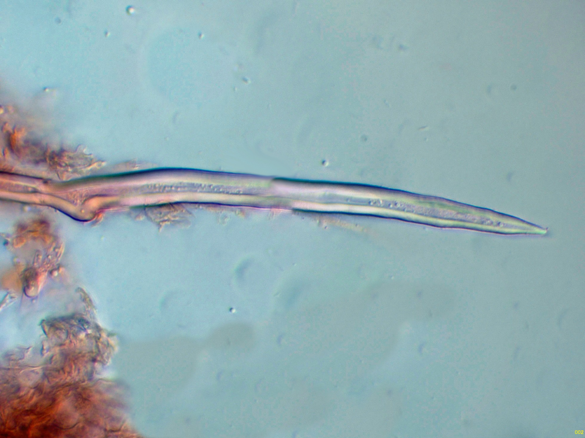 En la bibliografía de la especie se cita una materia amorfa formada por hifas dendroideas estrechas en la superficie de los cistidios, estas hifas solo me parece apreciarlas en la base del cistidio de la primera imágen en solución de Rojo Congo, para poder observar mejor esta sustancia decidí probar utilizando el Azul de Lactofenol, y ejerciendo poca presión sobre el cubre, dejo un par de imágenes con el resultado: