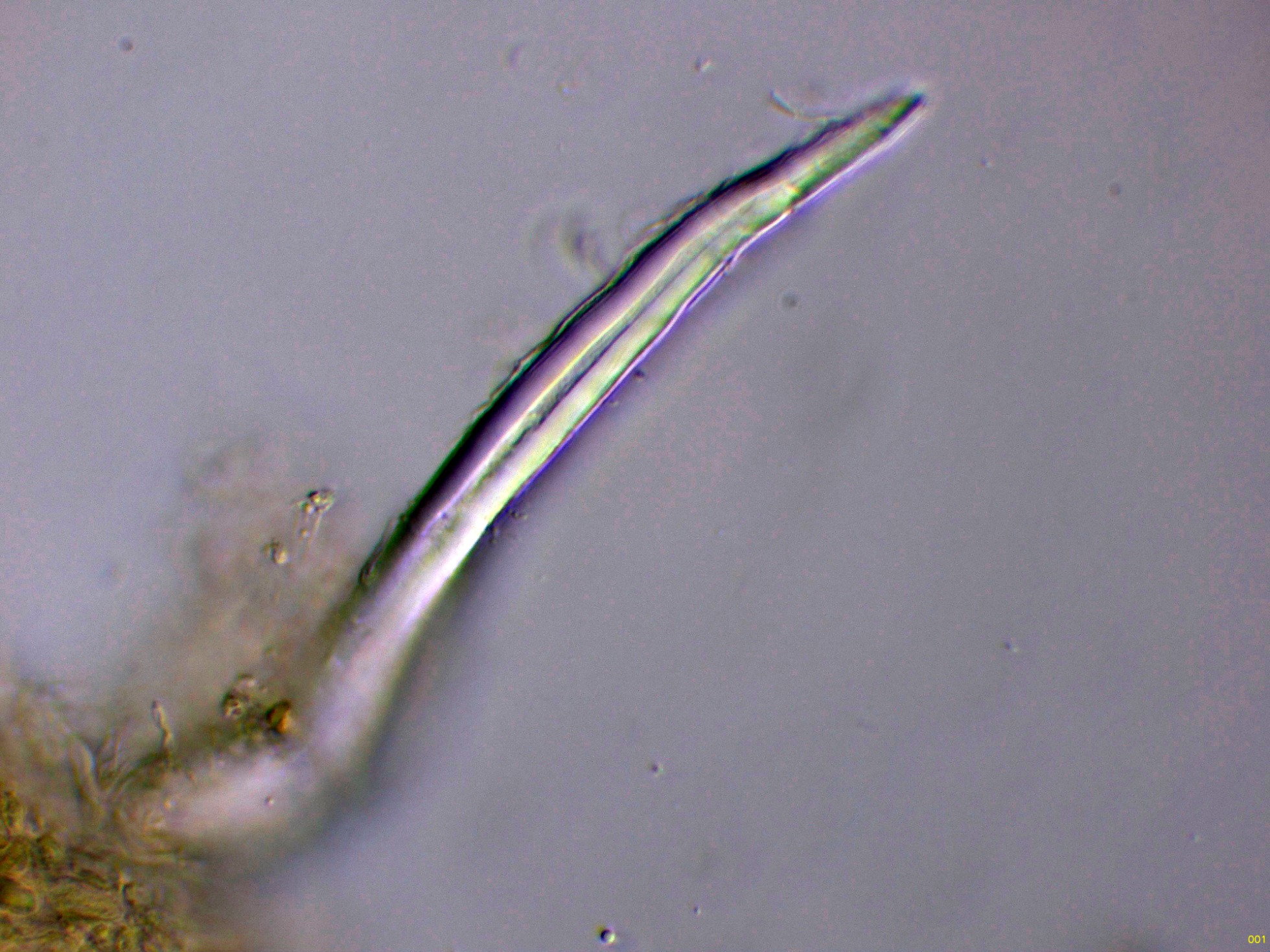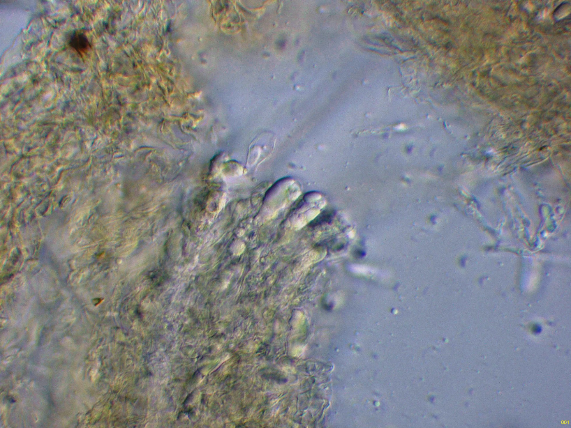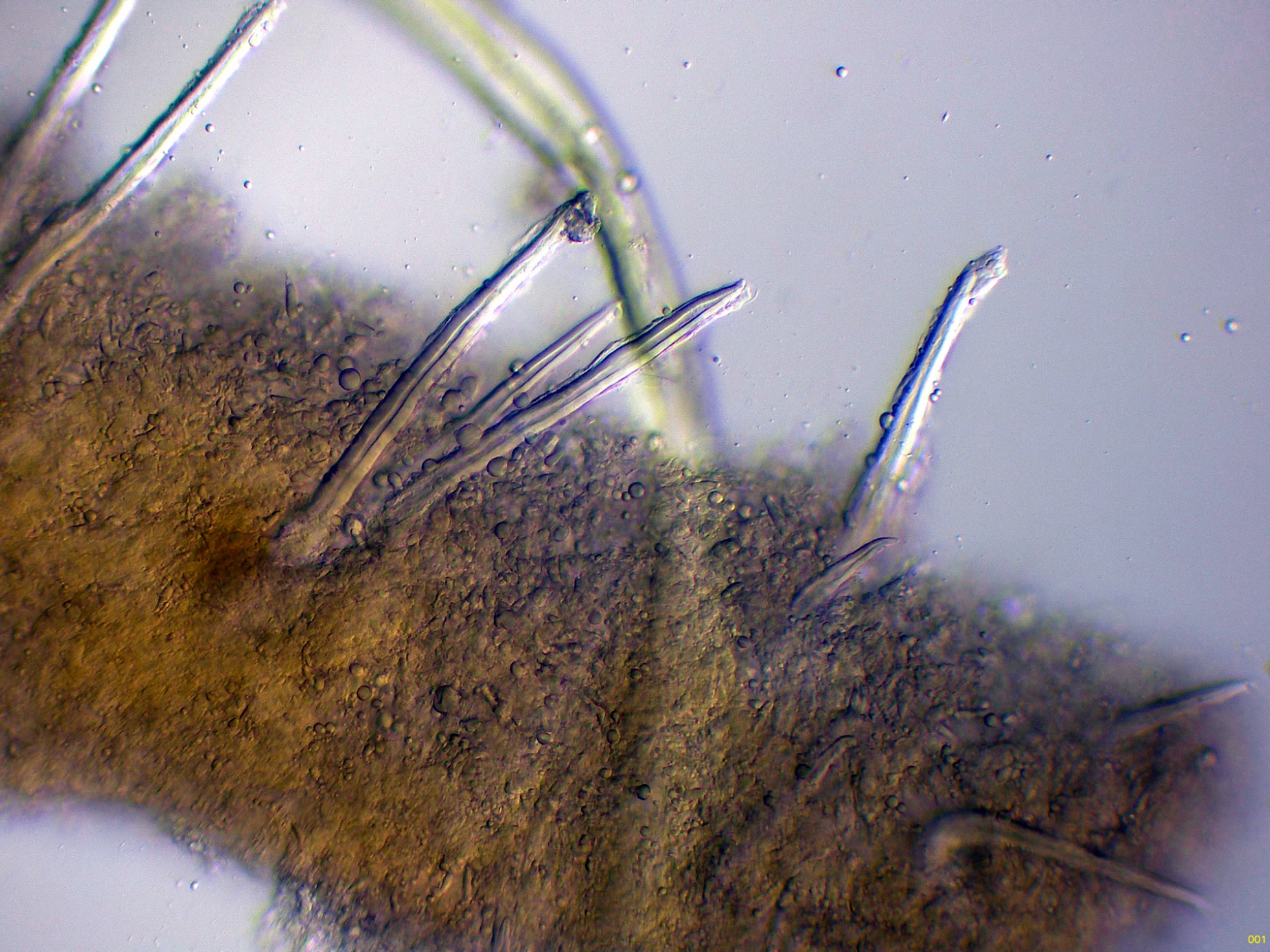 Aquí si que parece observarse esta sustancia amorfa en la superficie de los cistidios