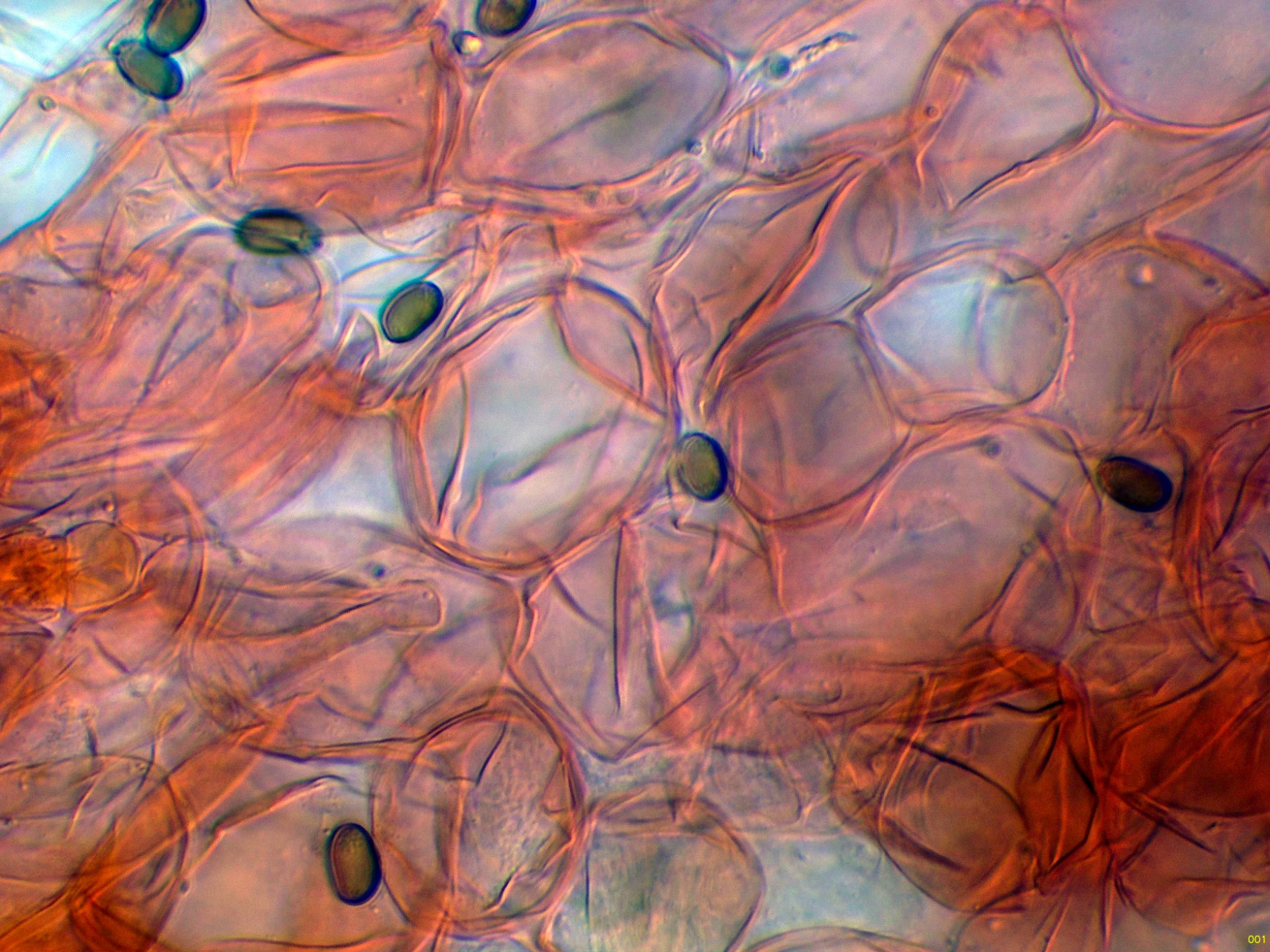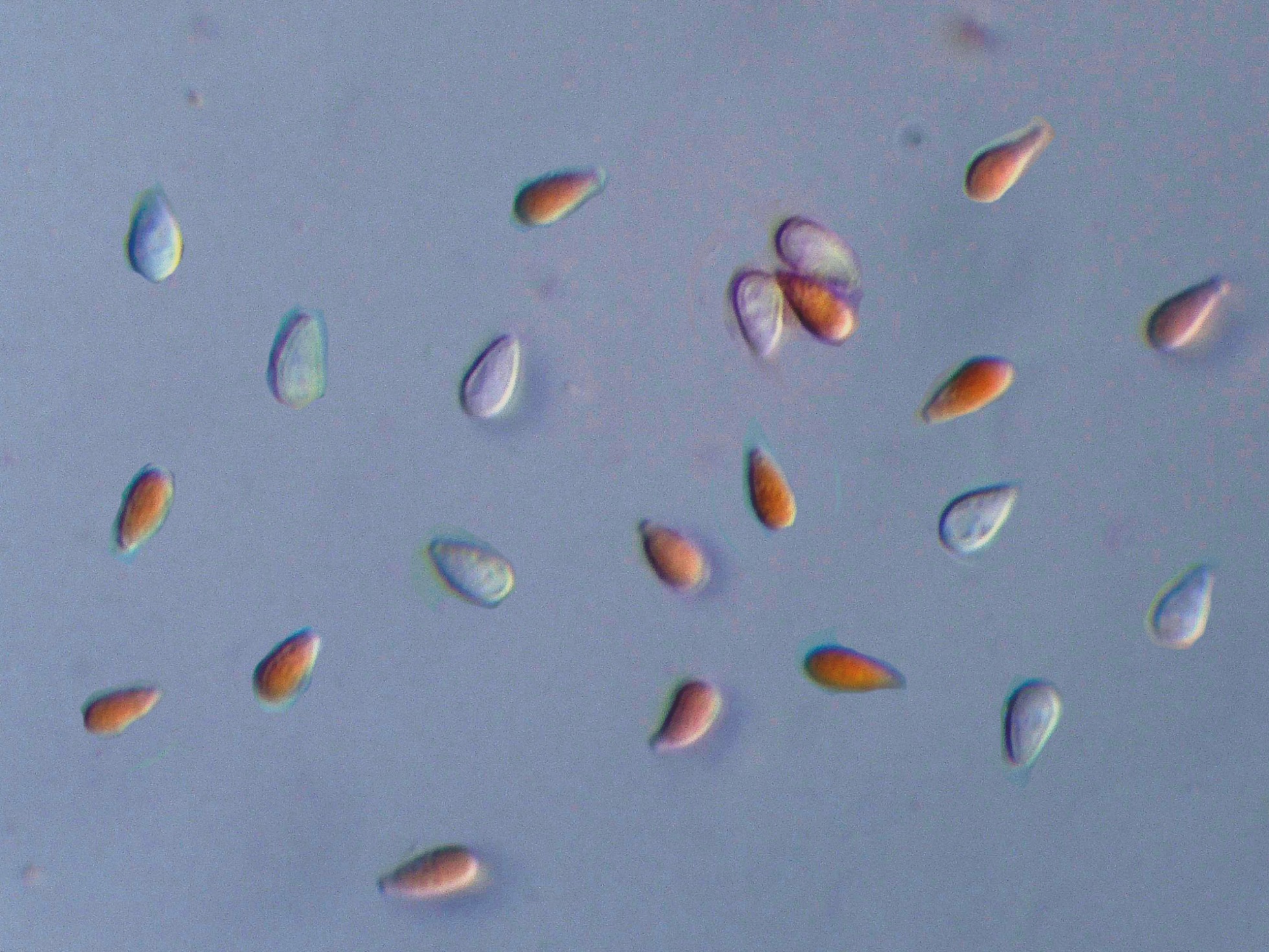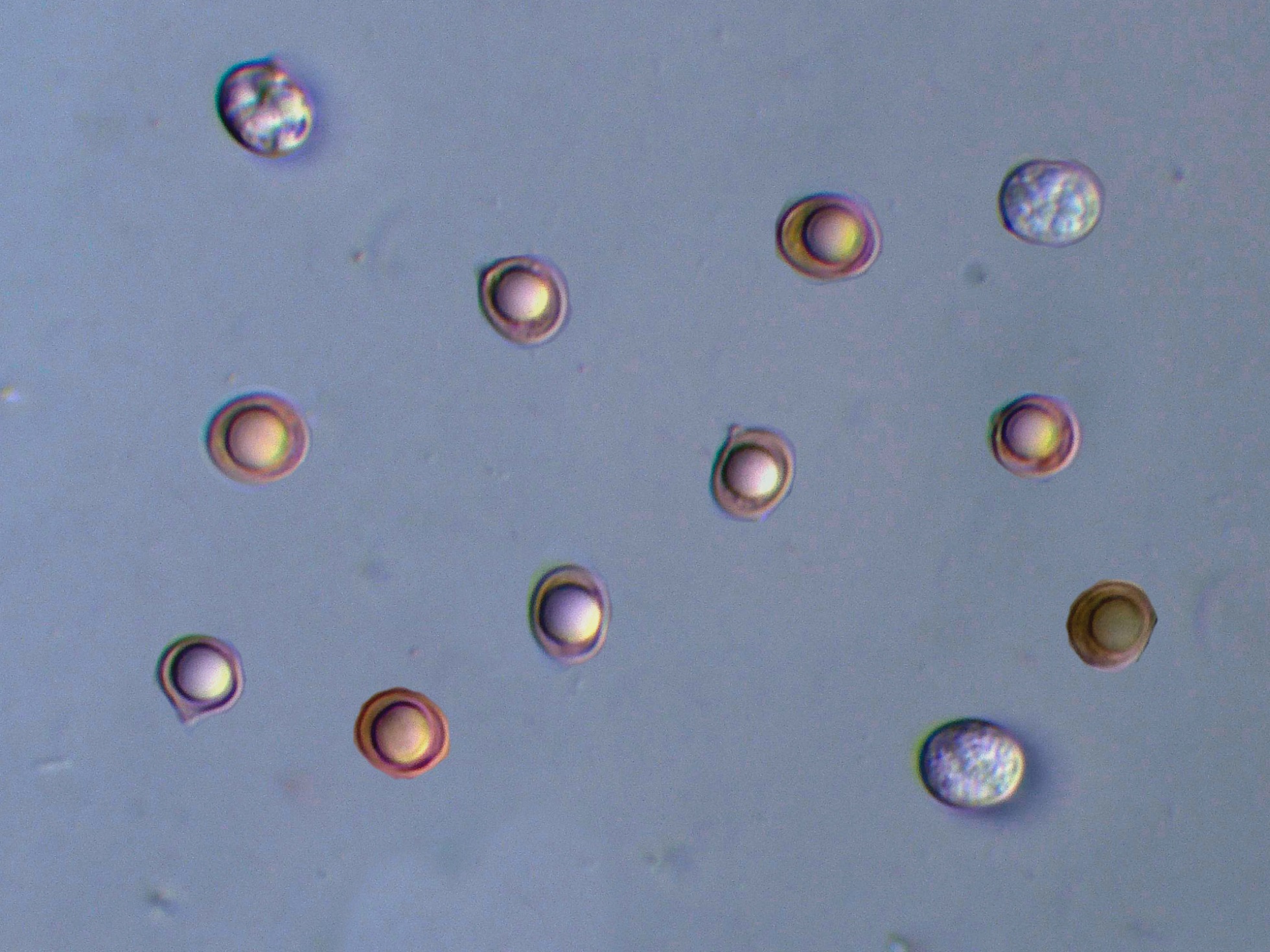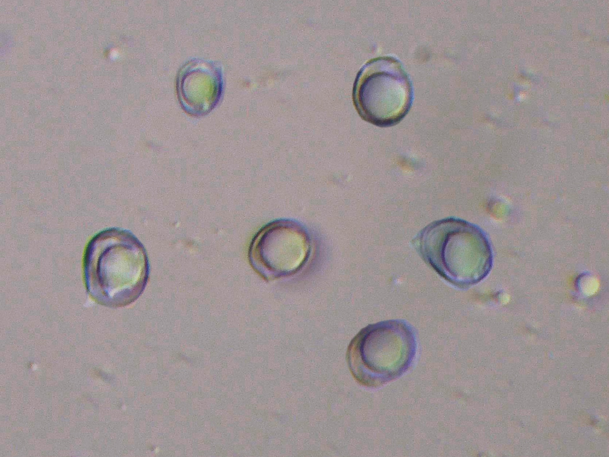 Y una ampliación de unas pocas esporas en Reactivo de Melzer, con reacción amiloide: