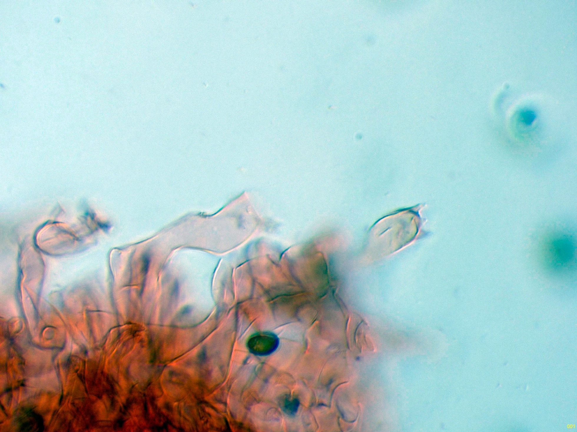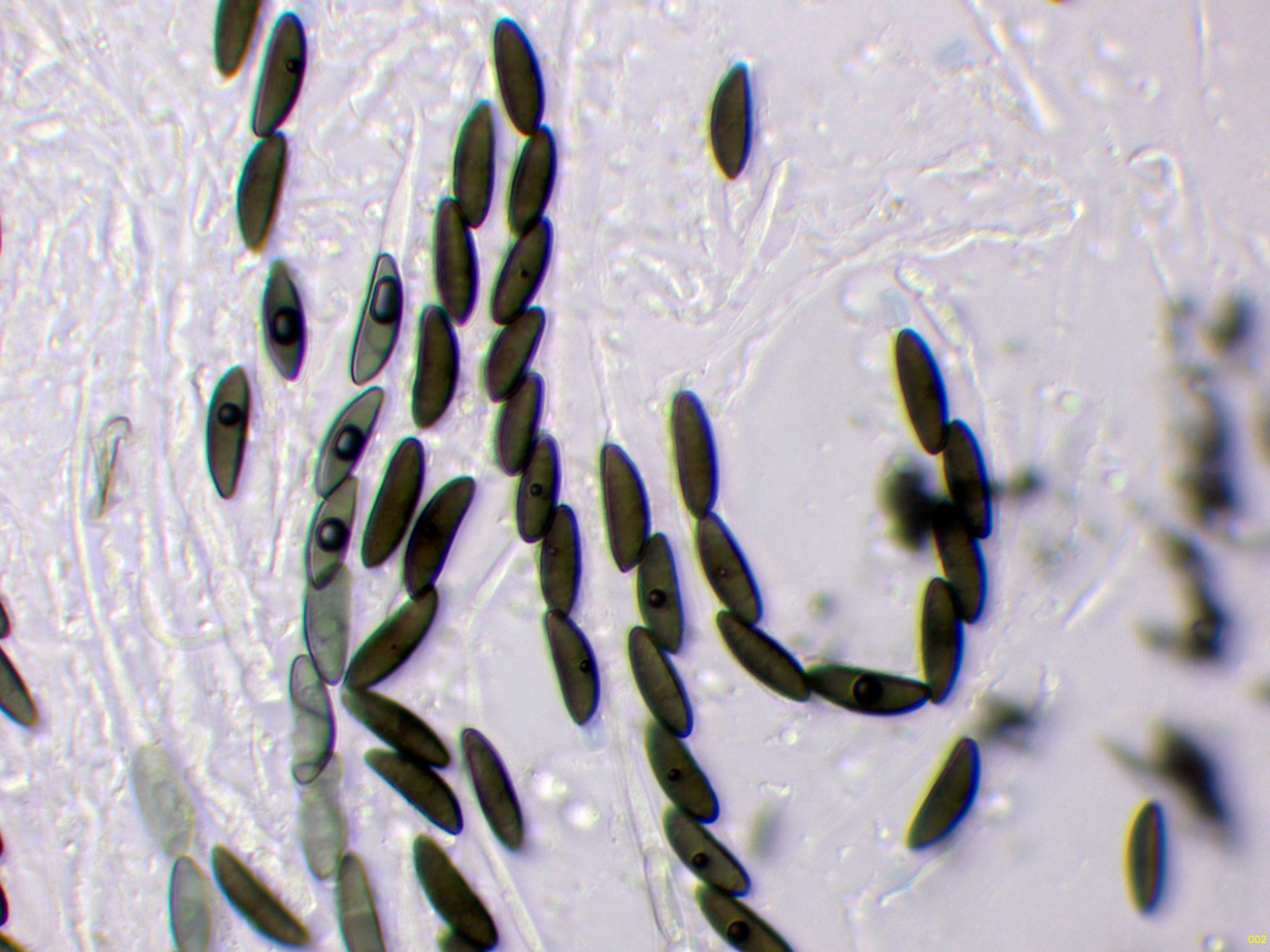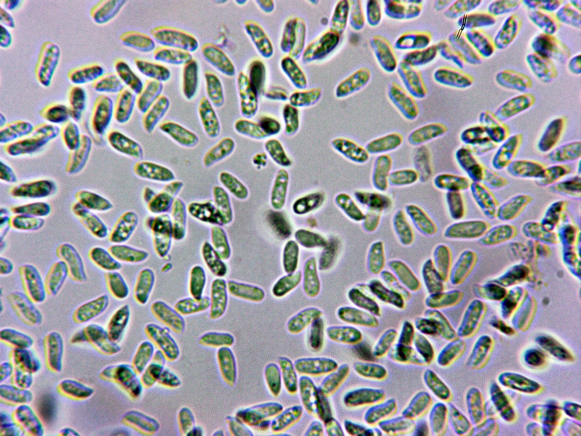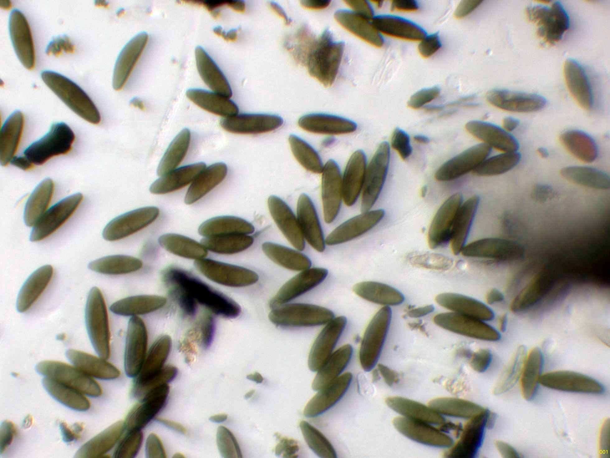 Y una ampliación de unas pocas esporas en Reactivo de Melzer, con reacción amiloide: