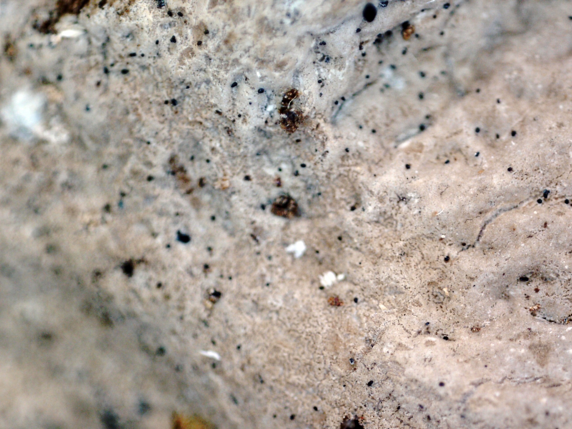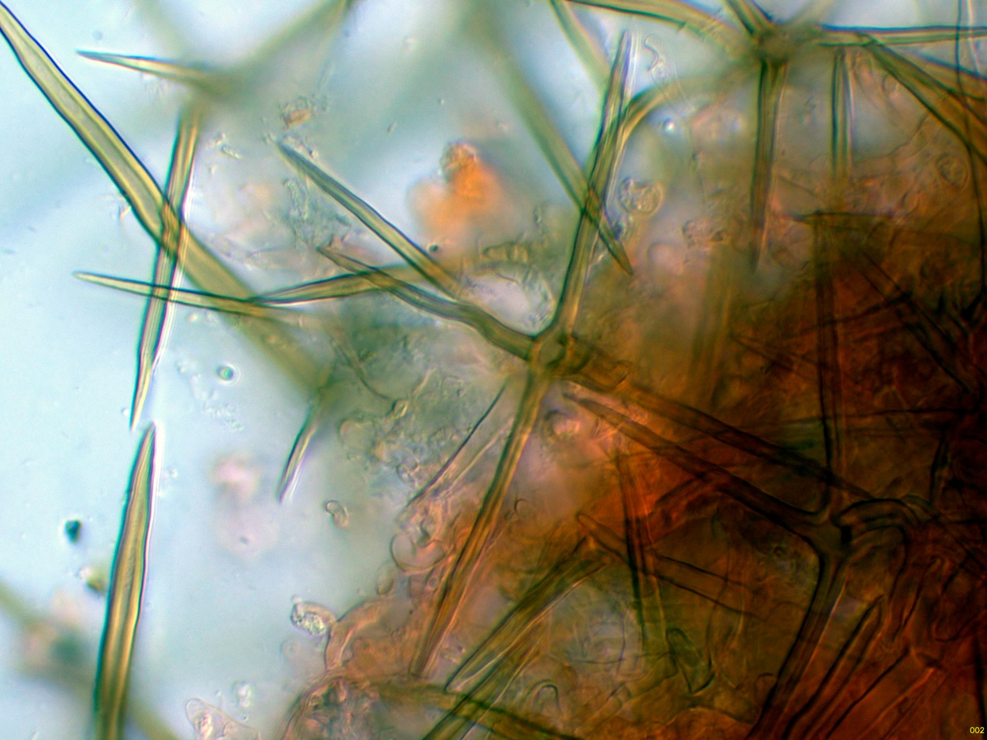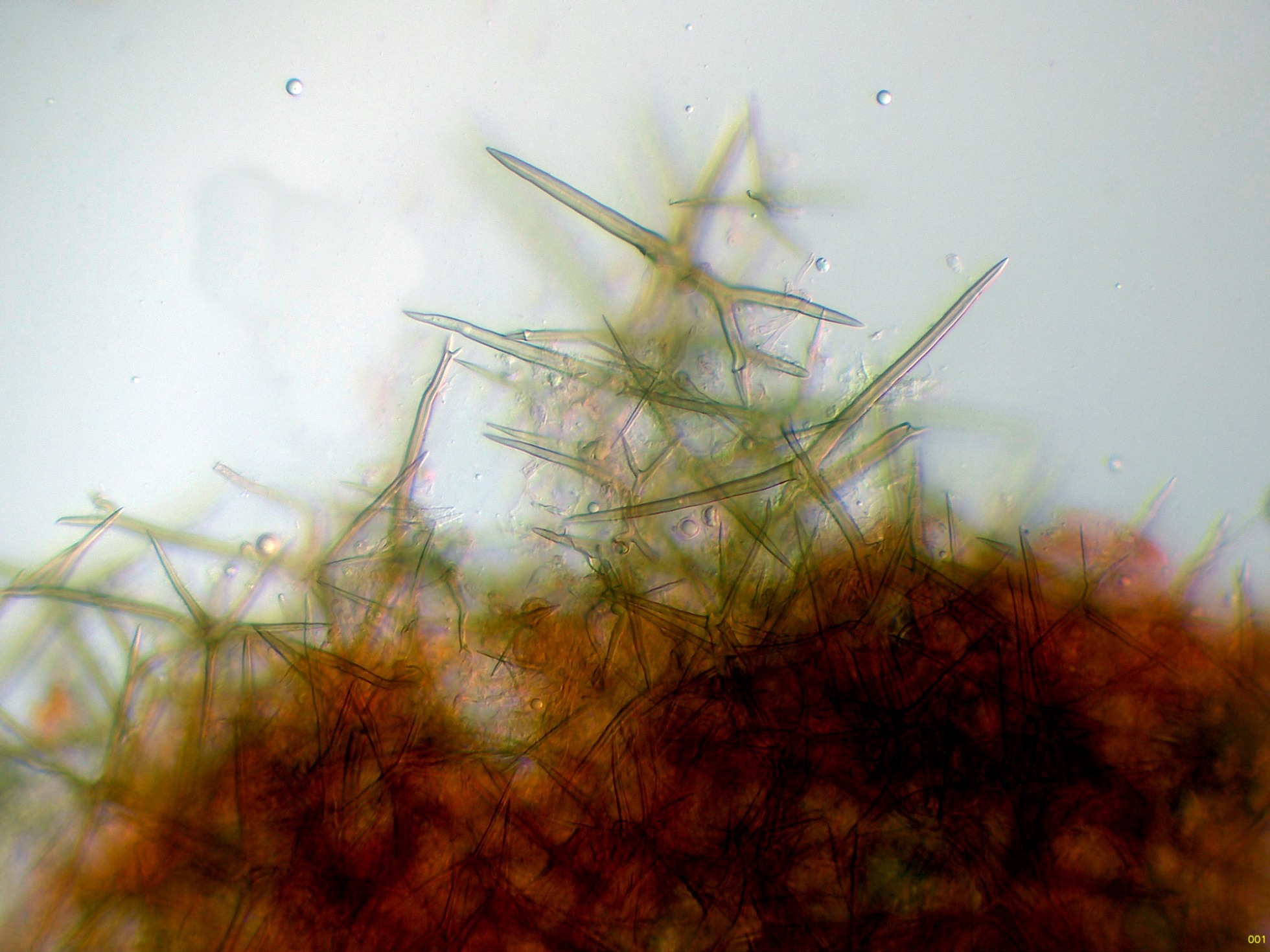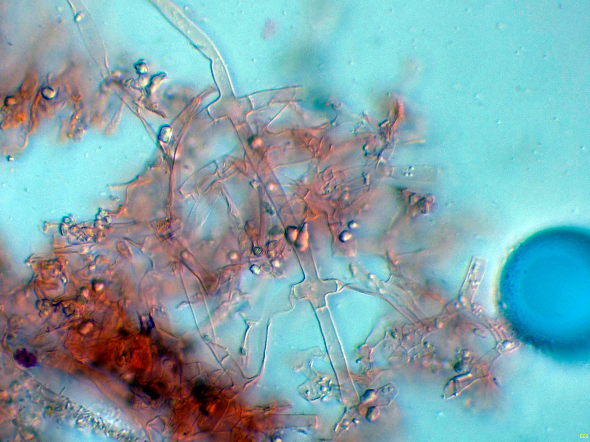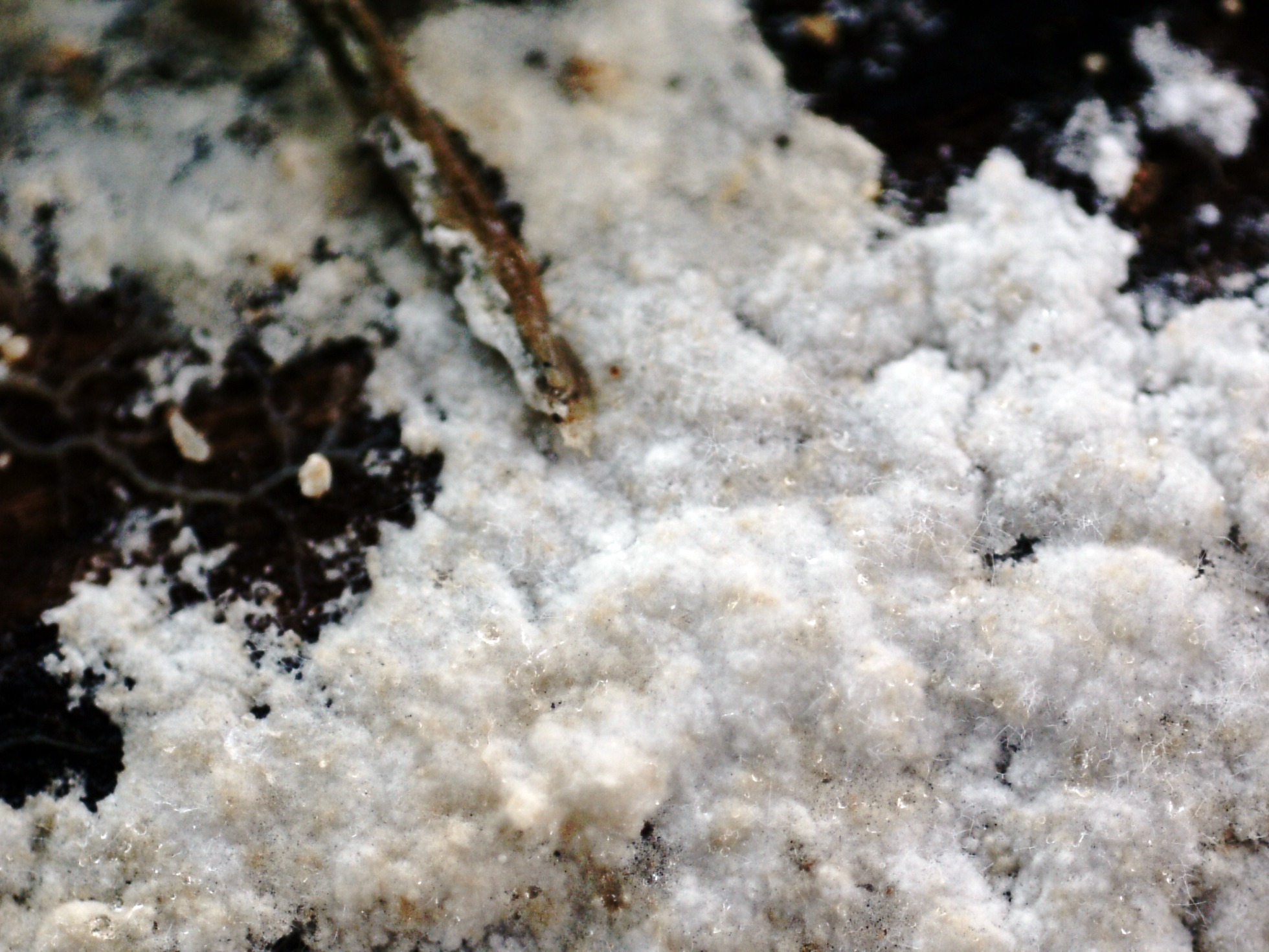 Una de las características que definen a la Athelia epiphylla son las abundantes cristalizaciones presentes en las hifas subiculares que tienden a desprenderse: