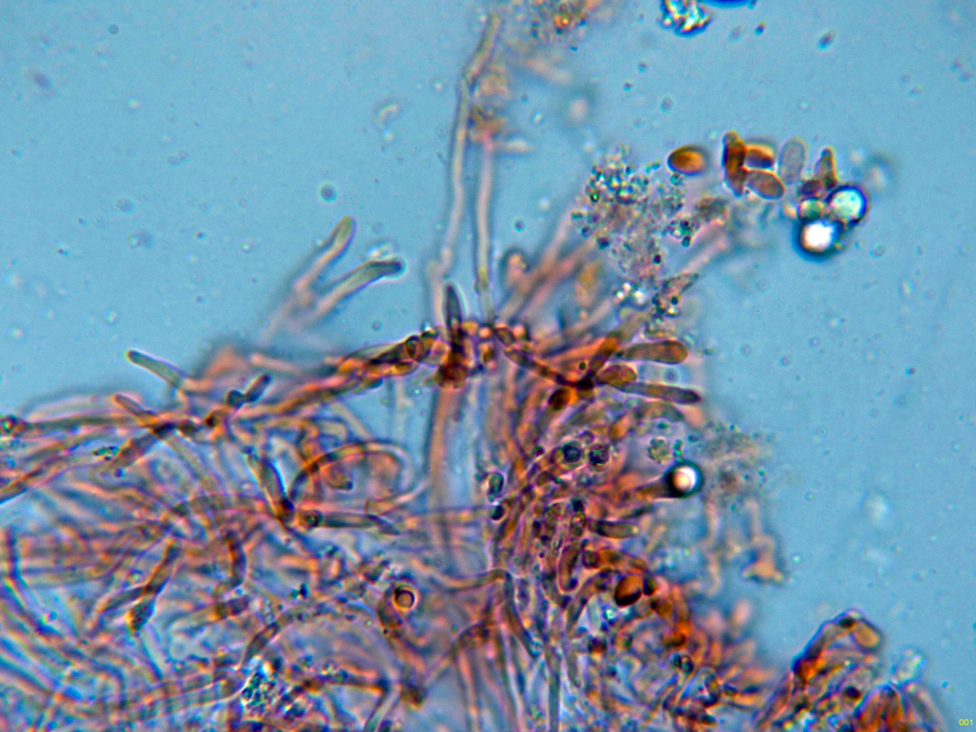 Abundantes hifas completamente cubiertas de incrustaciones a modo de cristalizaciones, característica bastante común dentro del género Skeletocutis.
