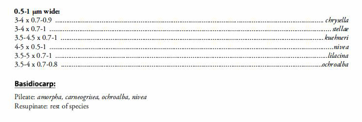 Siguiendo las Claves de Ryvarden, con esporas de menos de 1 micra de ancho tenemos solo unas pocas, dejo una captura de pantalla del trabajo de Ryvarden: