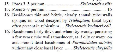 Ya más recientemente me encuentro con el documento de 2018 con el título de "Two new temperate polypore species of Skeletocutis (Polyporales, Basidiomycota)", en le que se describe un nuevo taxón con unas medidas esporales muy parecidas, la Skeletocutis exilis, de hábitat un poco más cosmopolita, en el mismo documento me encuentro con unas Claves que con esporas de menos de 1 micra de ancho y con 3 a 5 poros por mm., me conducen a la Skeletocutis exilis propuesta, añado un pantallazo extraído de las Claves: