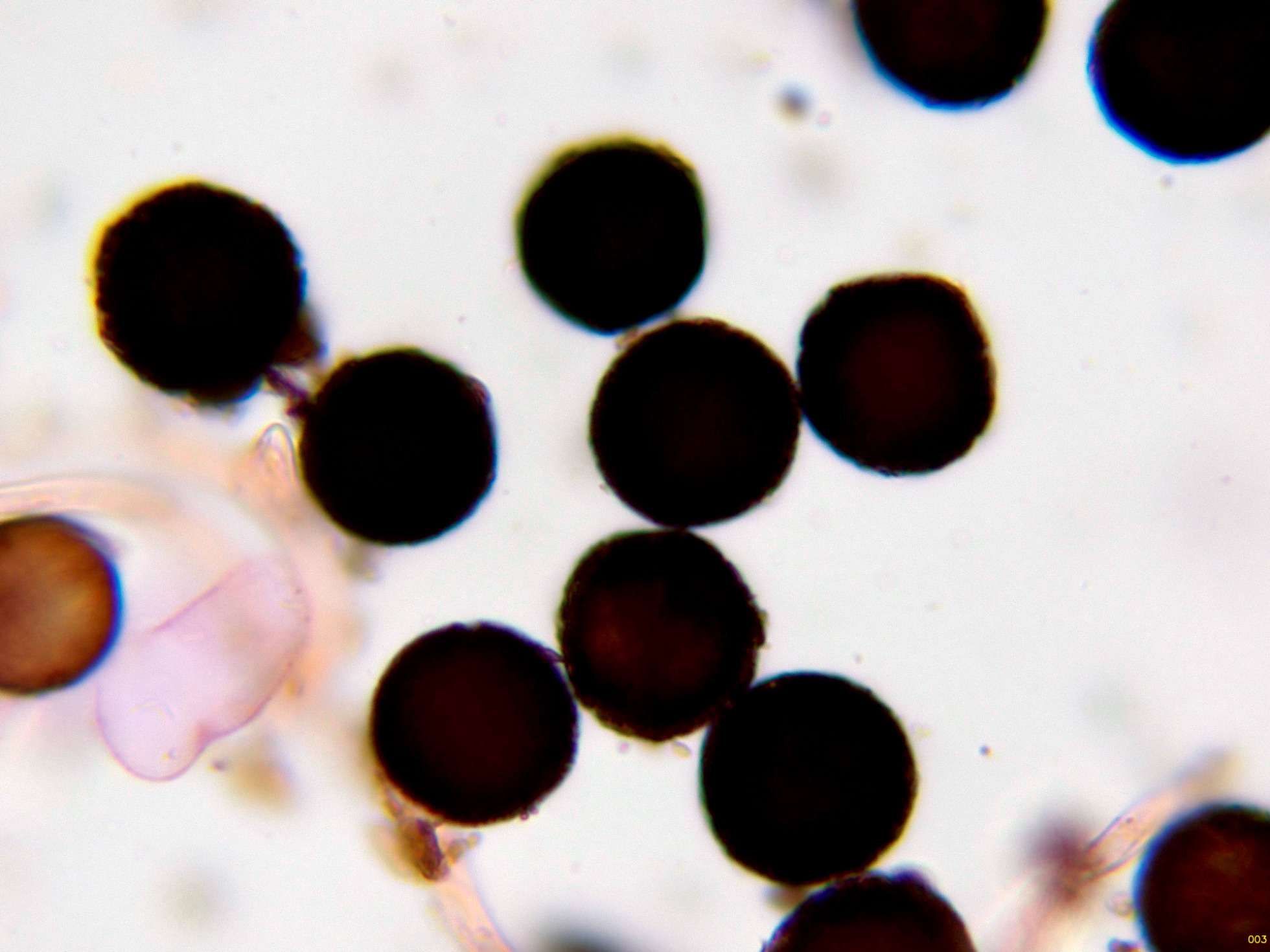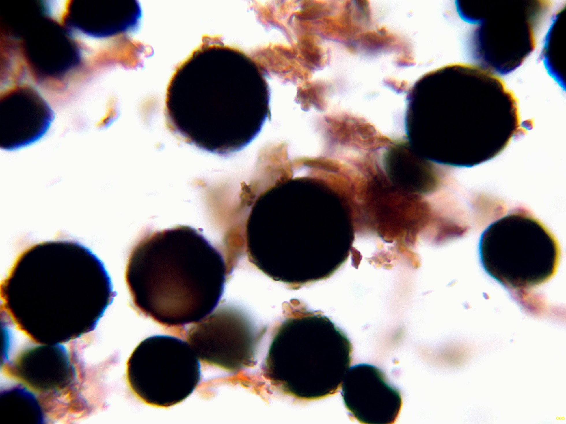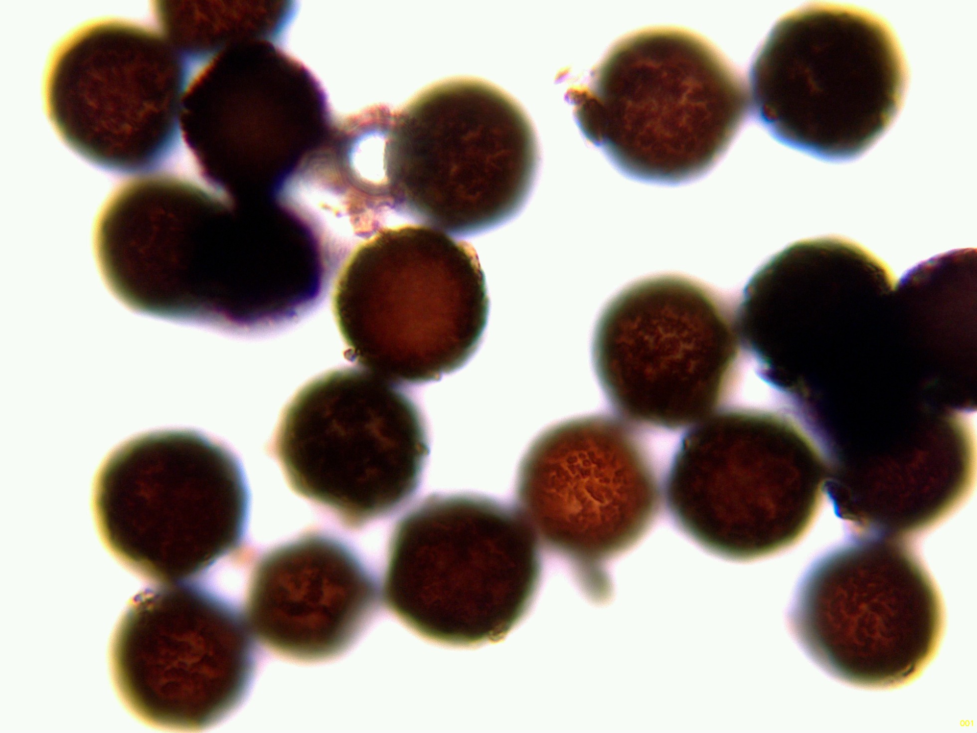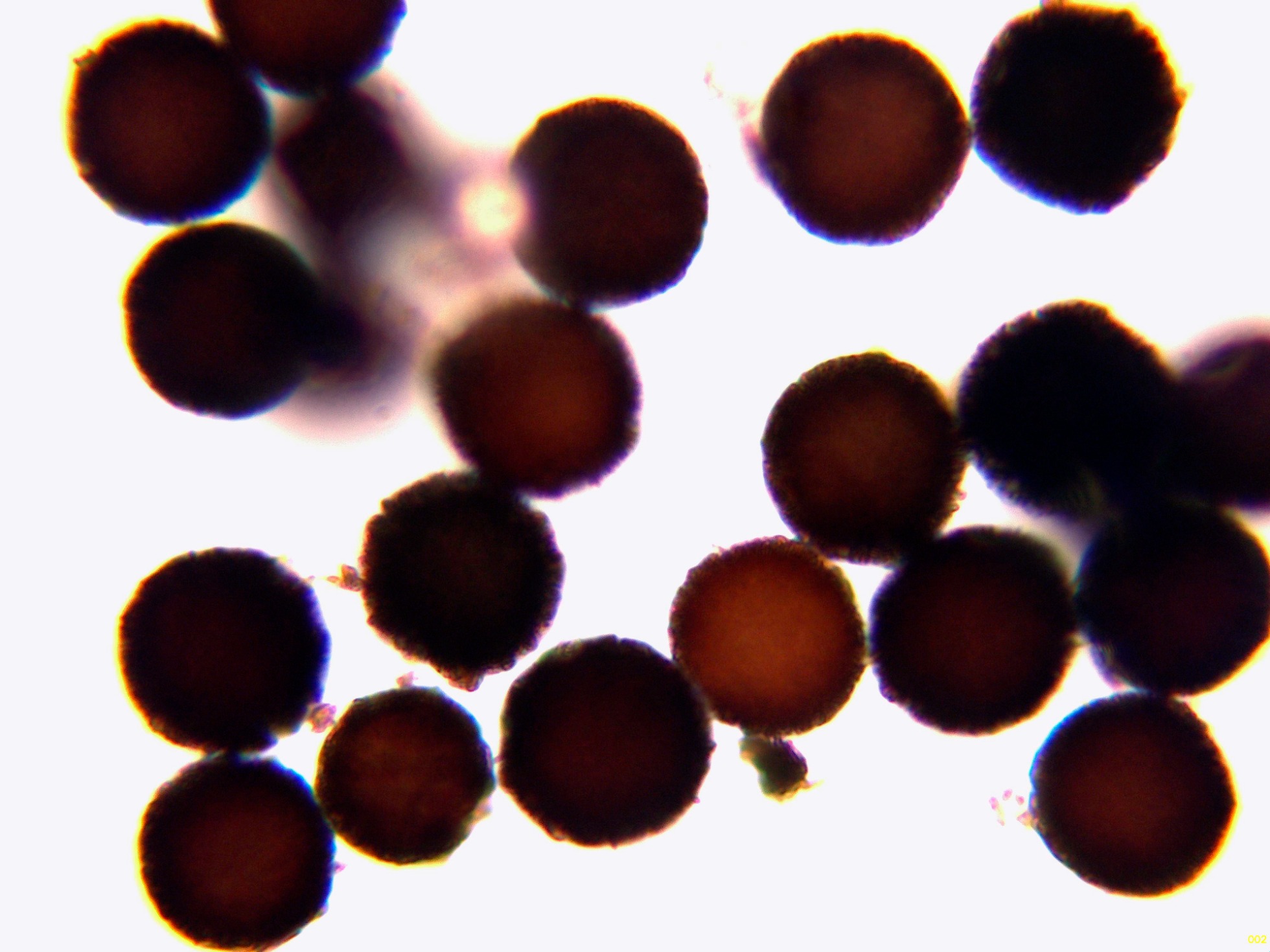 Las mismas esporas de la imágen anterior, observadas desde distinto plano, para poder observar mejor su ornamentación: