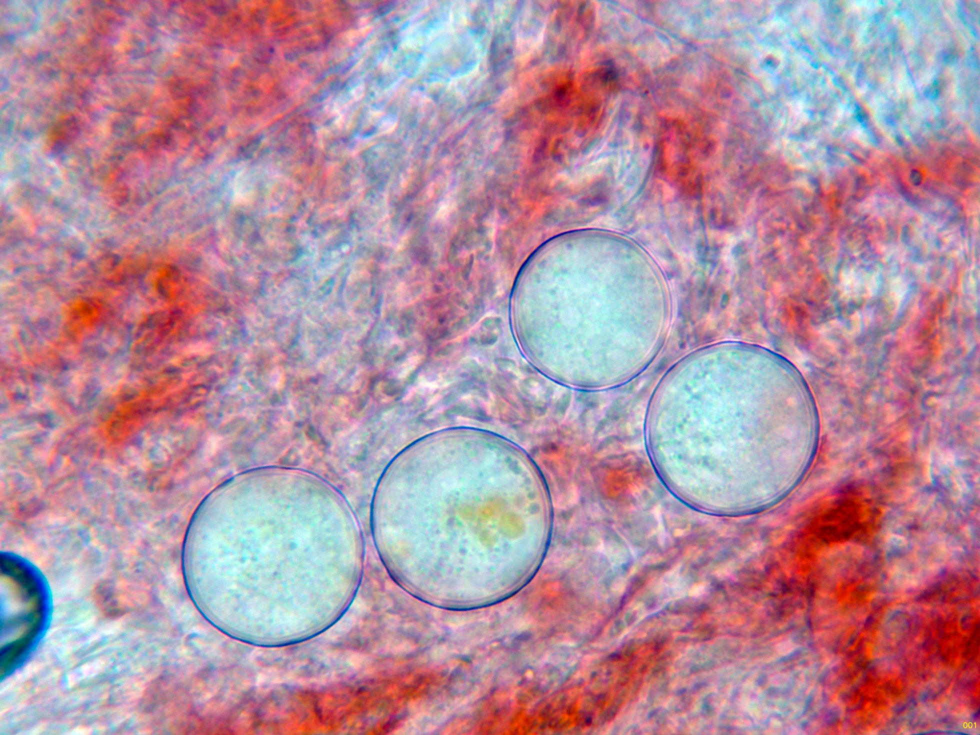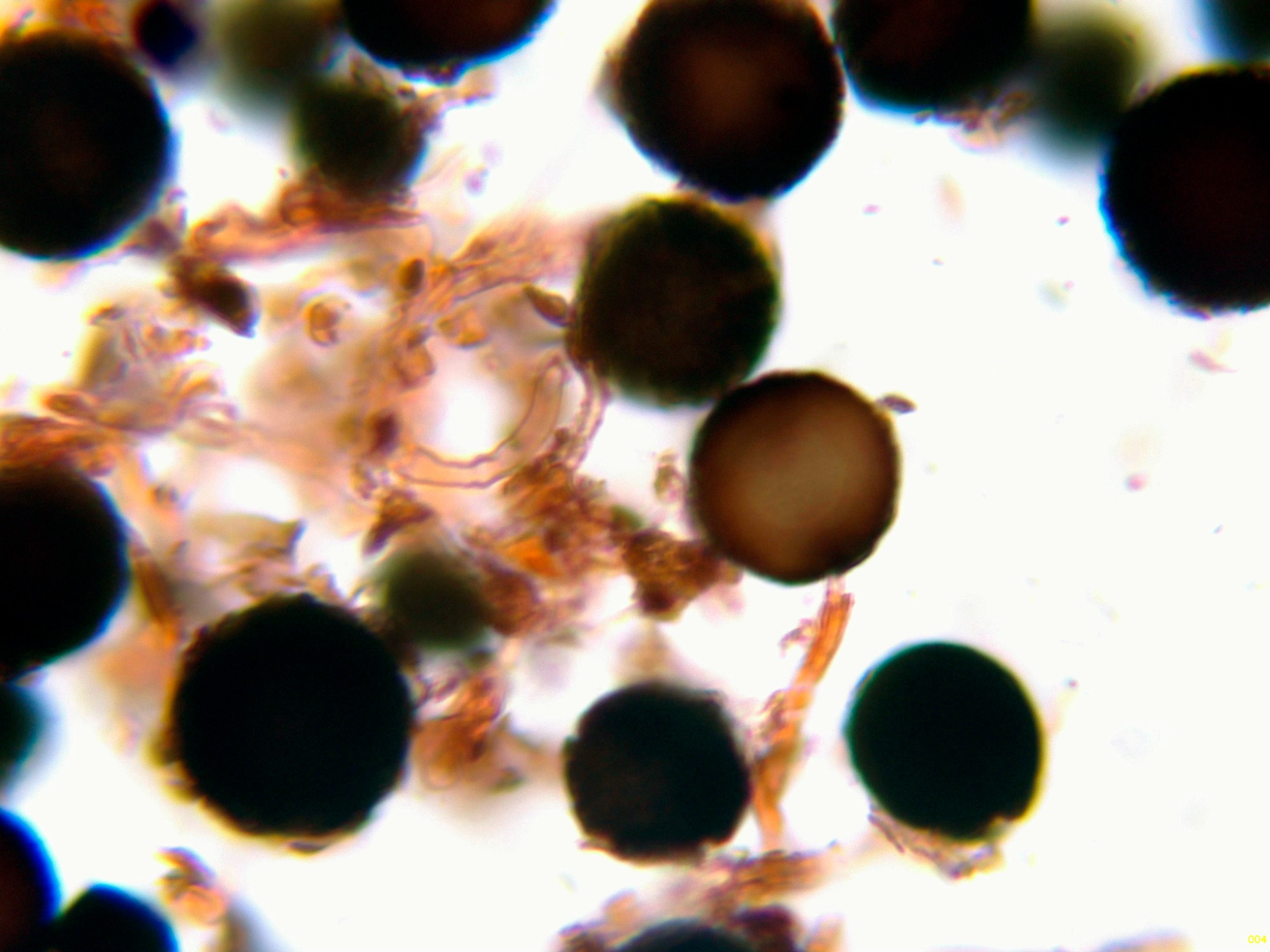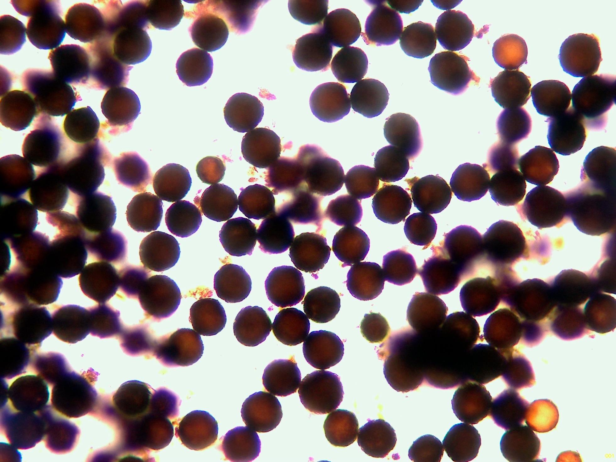 Las mismas esporas de la imágen anterior, observadas desde distinto plano, para poder observar mejor su ornamentación: