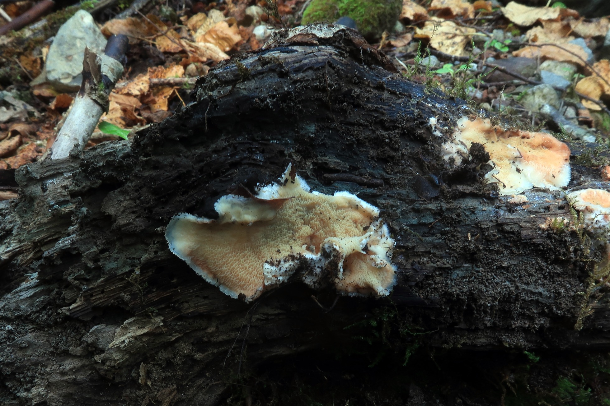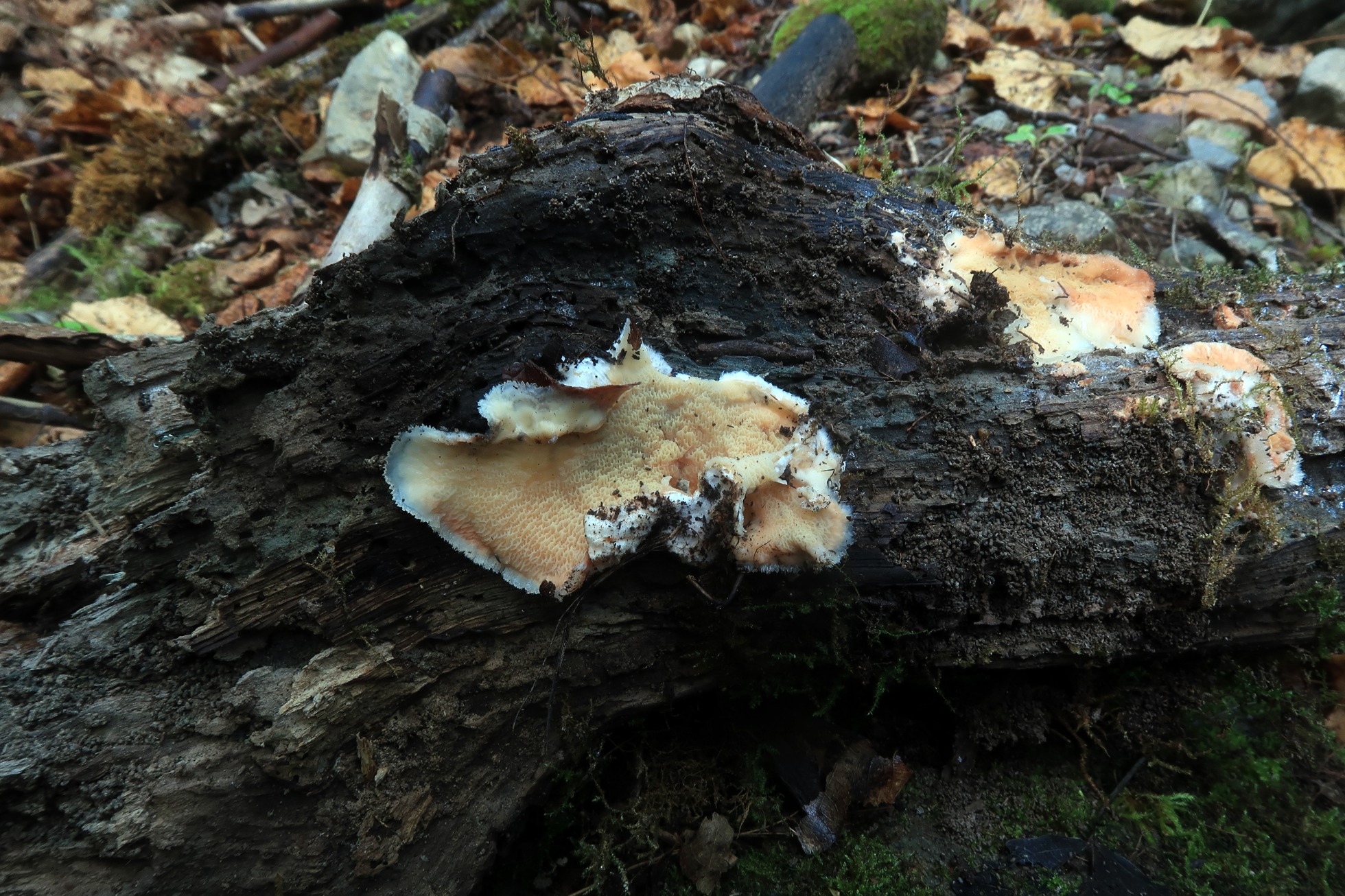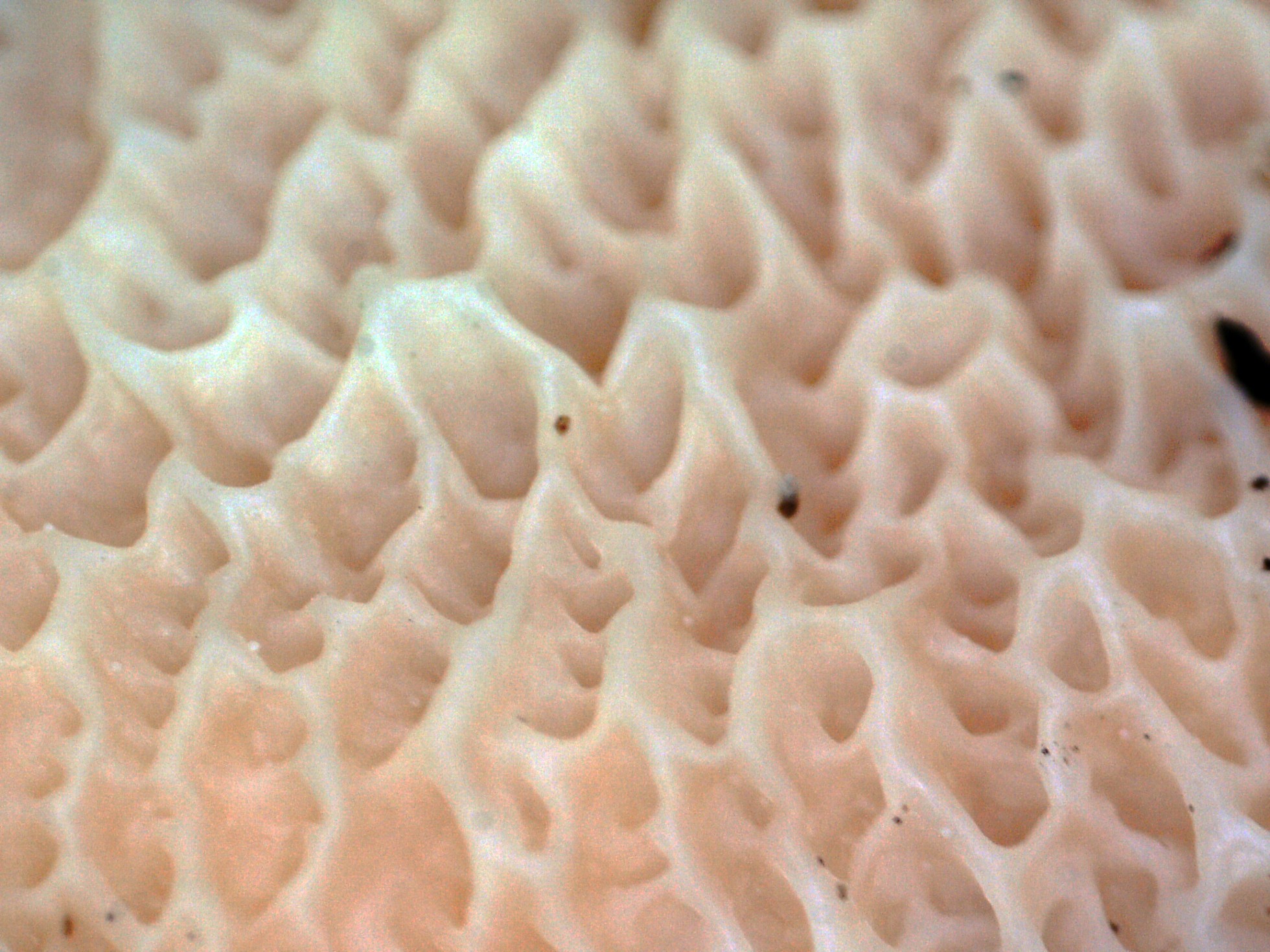 Los basidiomas sobre el sustrato, con el himenio meruloide: