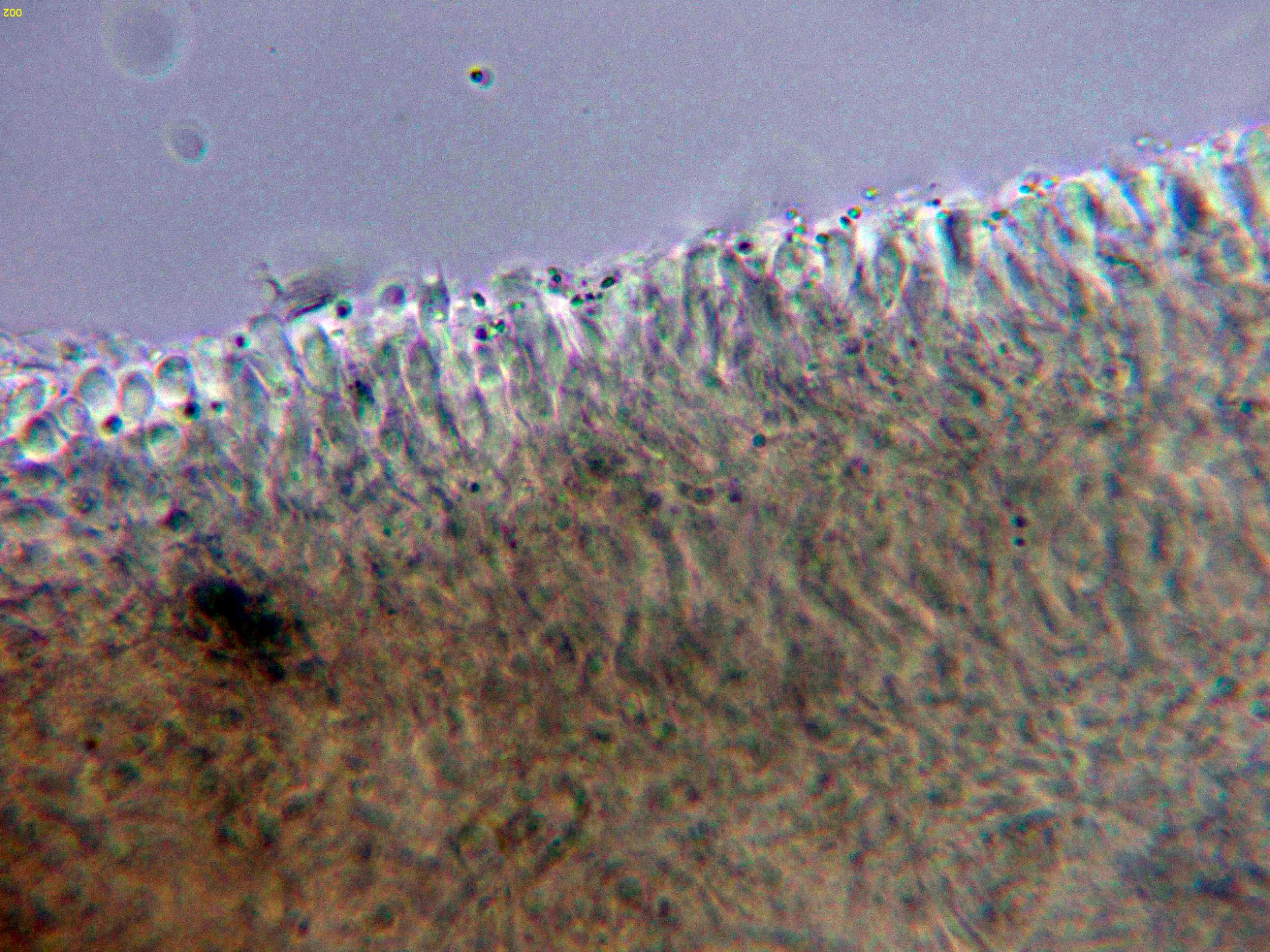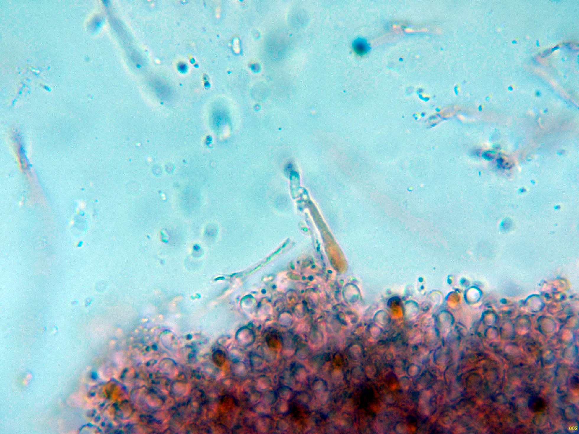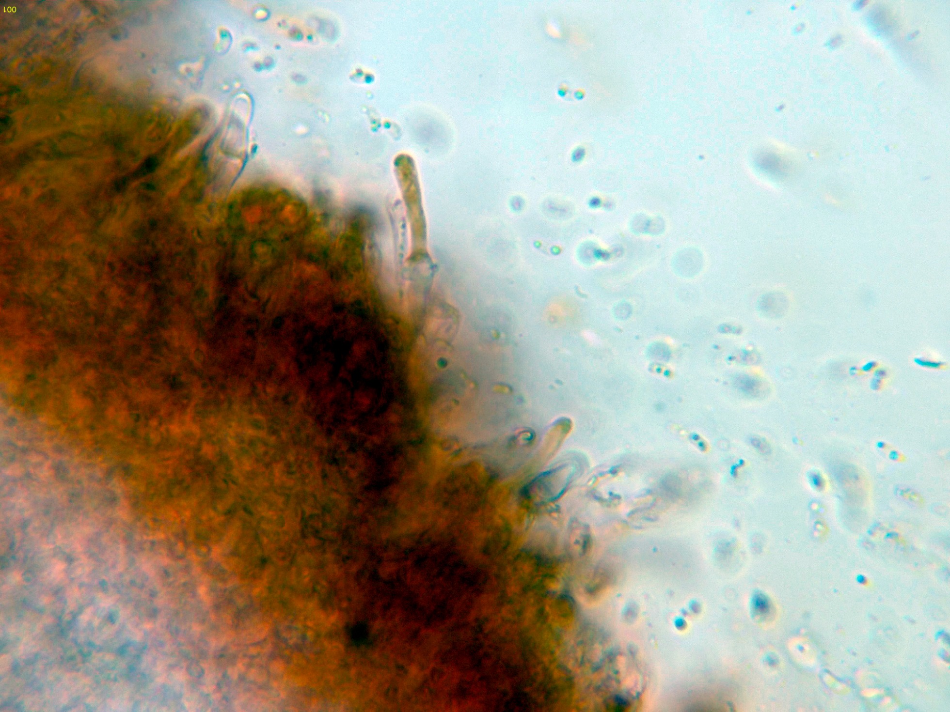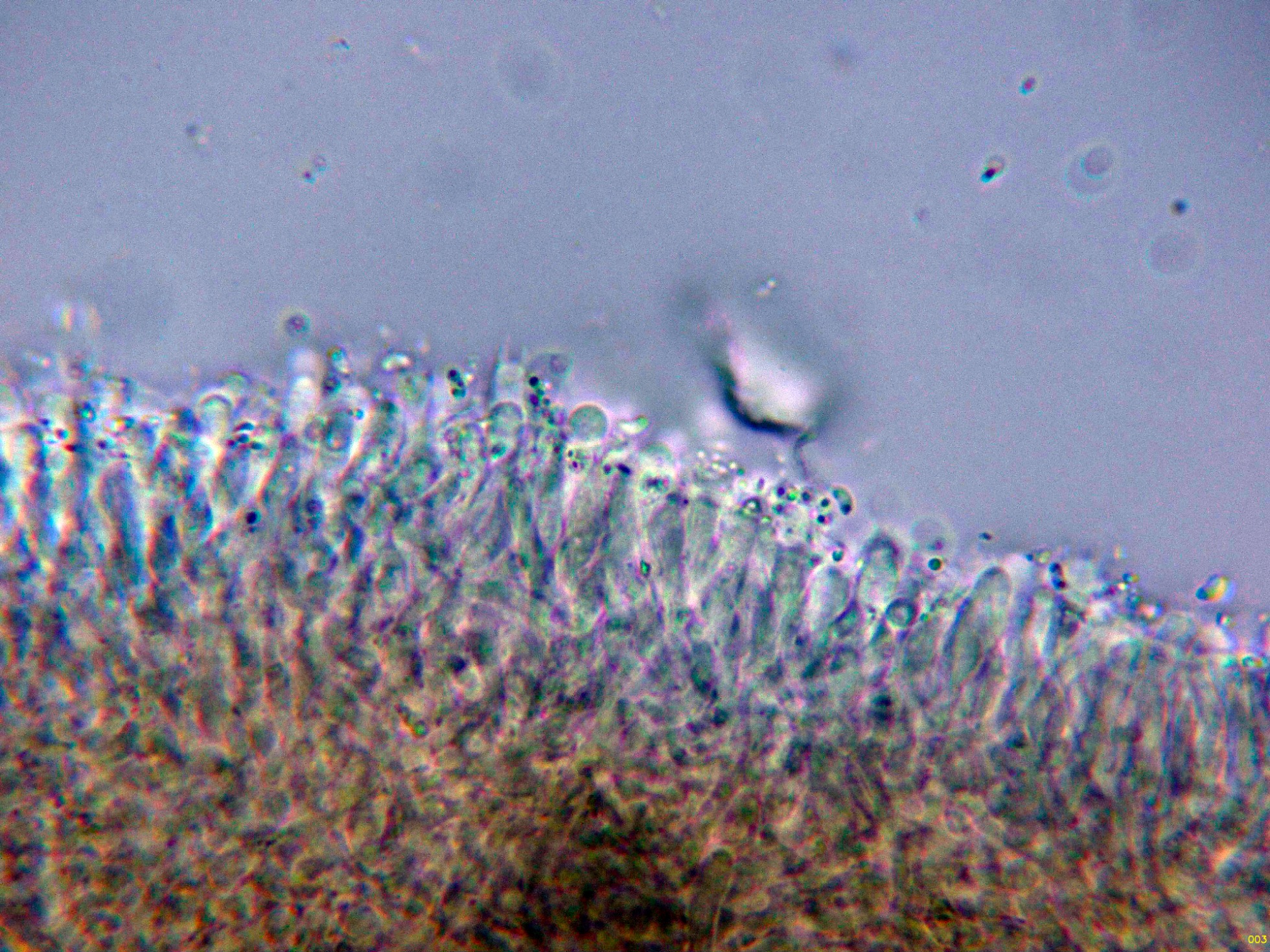 Cistidios muy escasos y dispersos que sobresalen considerablemente por encima del nivel de los basidios: