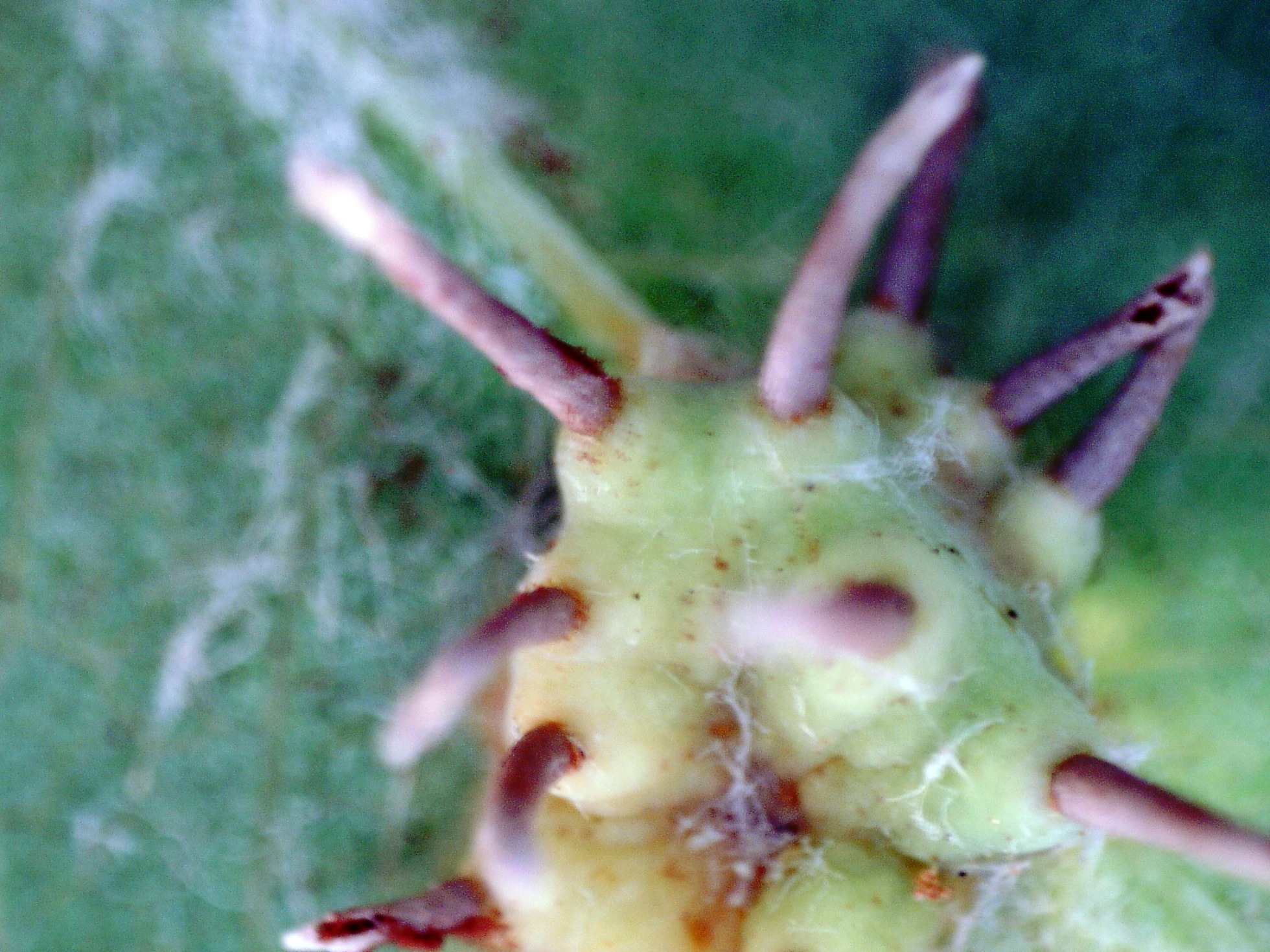 En el envés de la hoja provoca unas agallas con terminaciones a modo de tubos por donde expulsa las eciosporas: