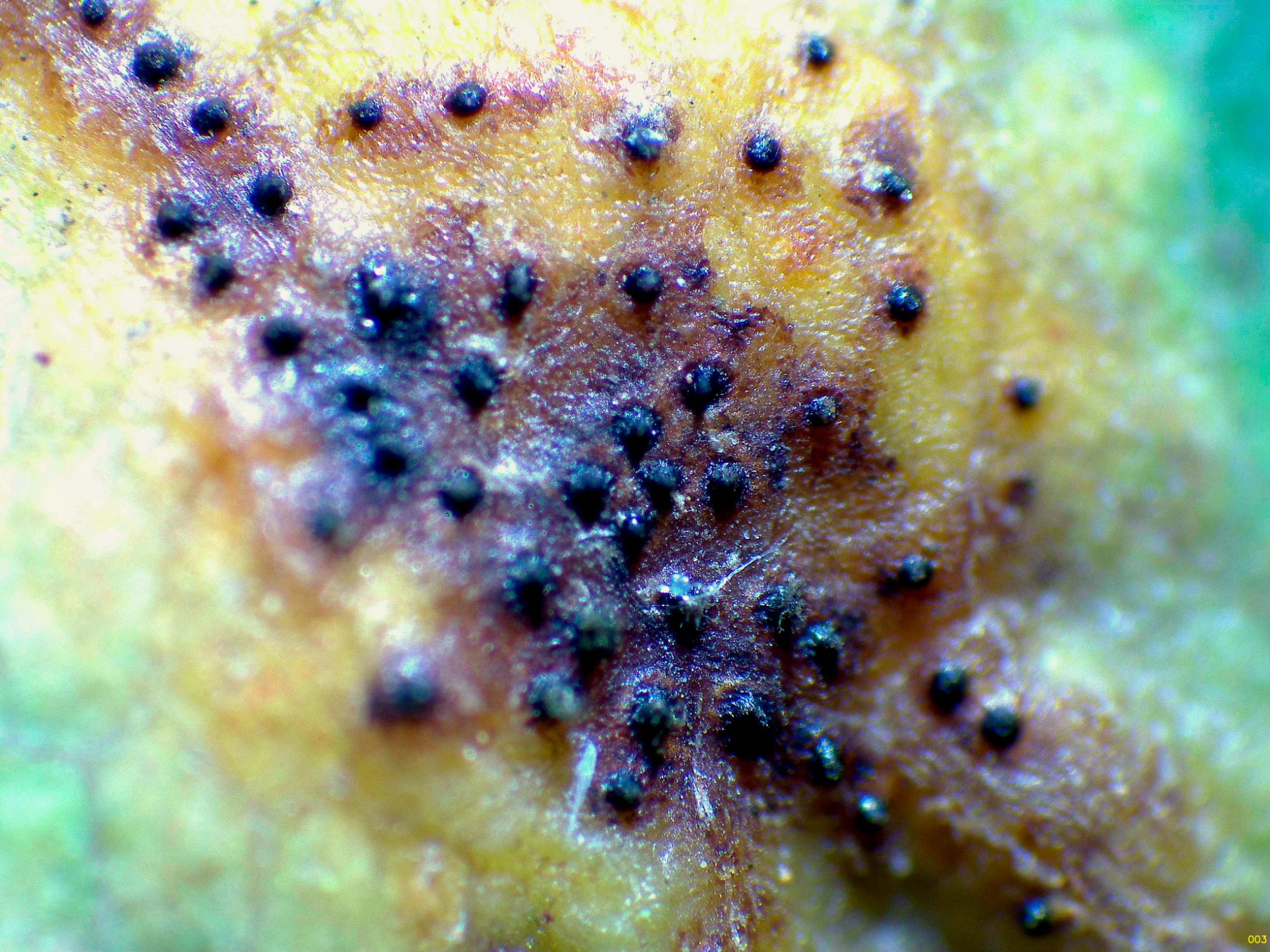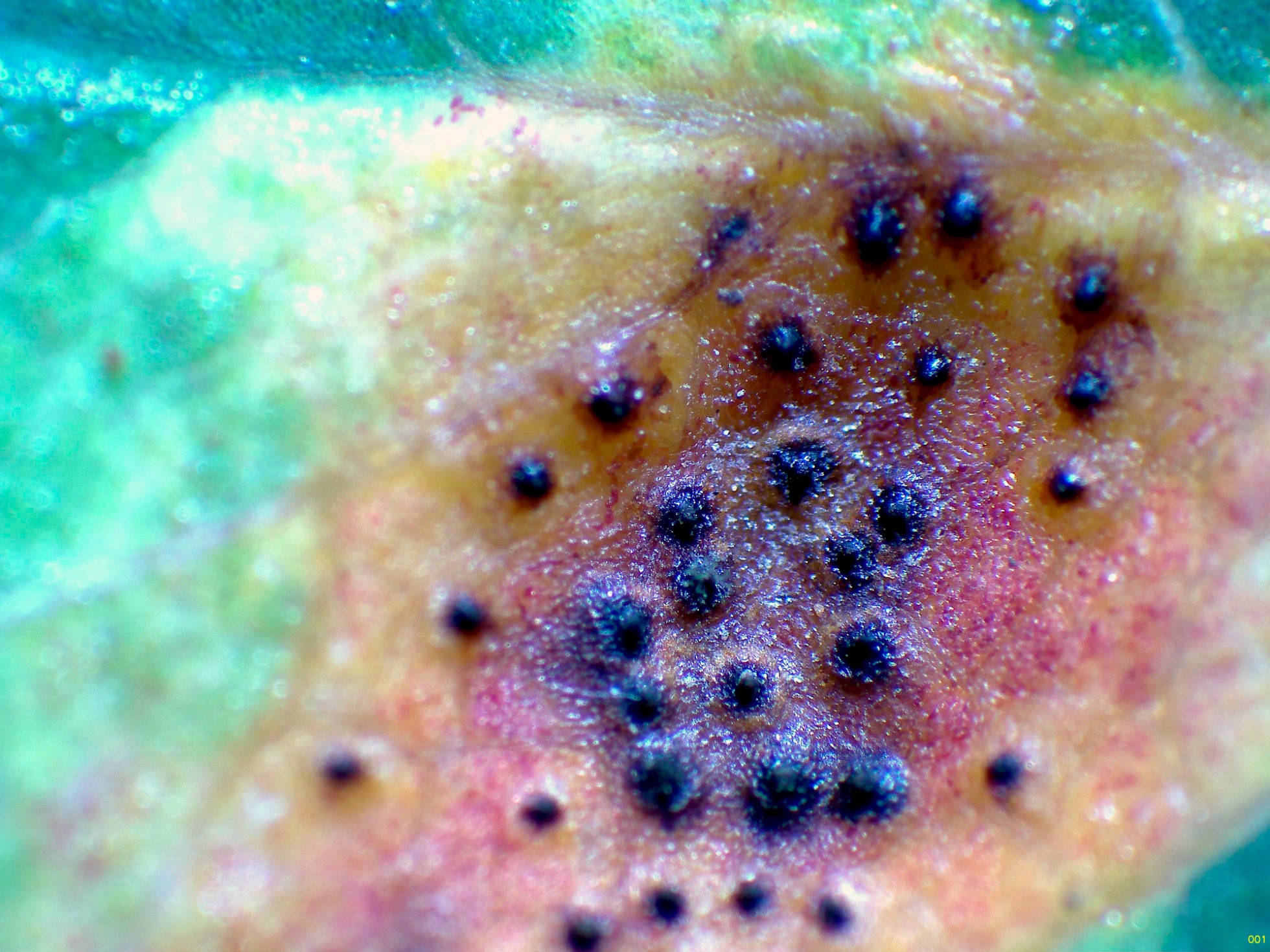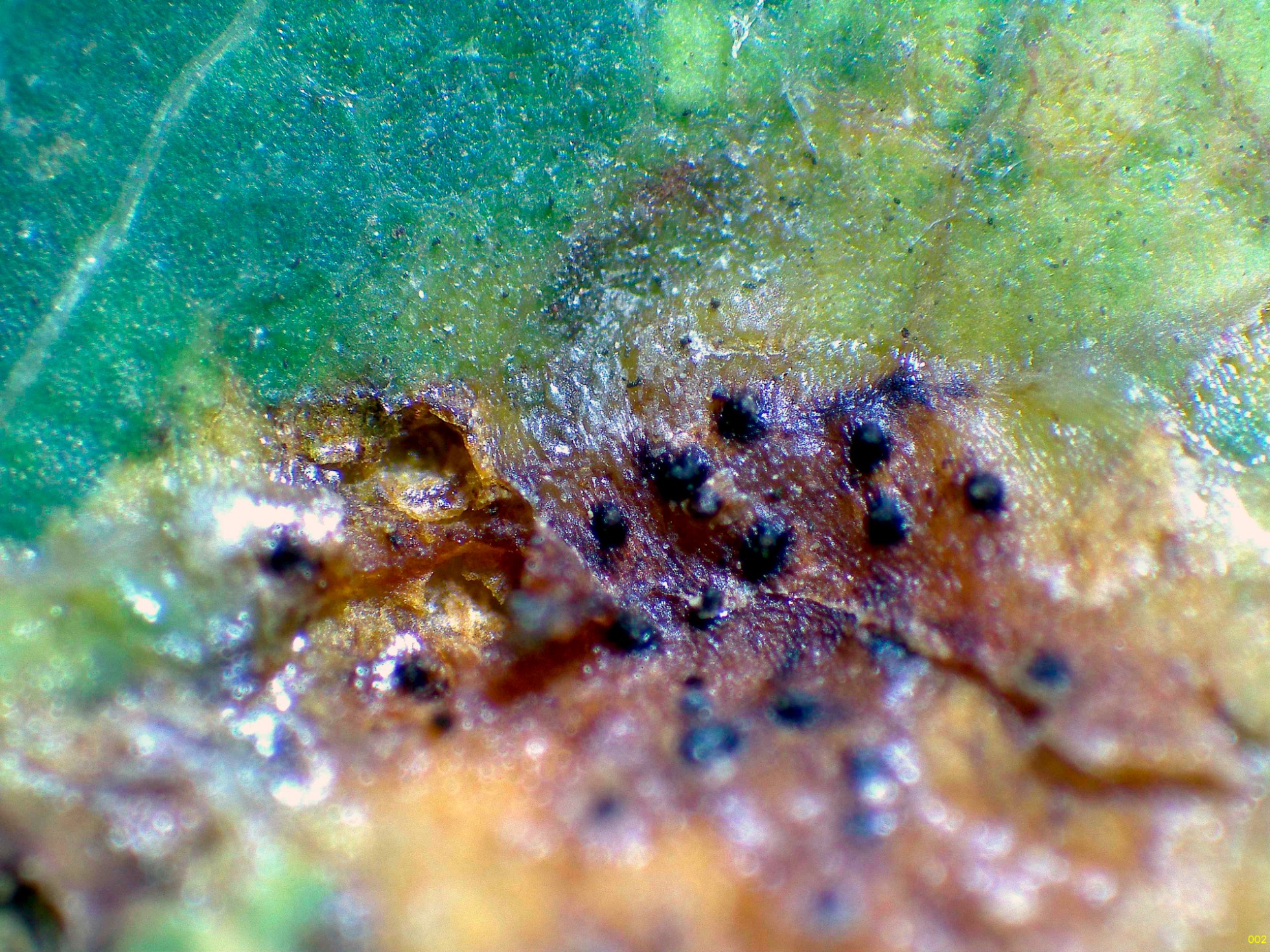 Los picnidios en el haz de la hoja a 20 aumentos: