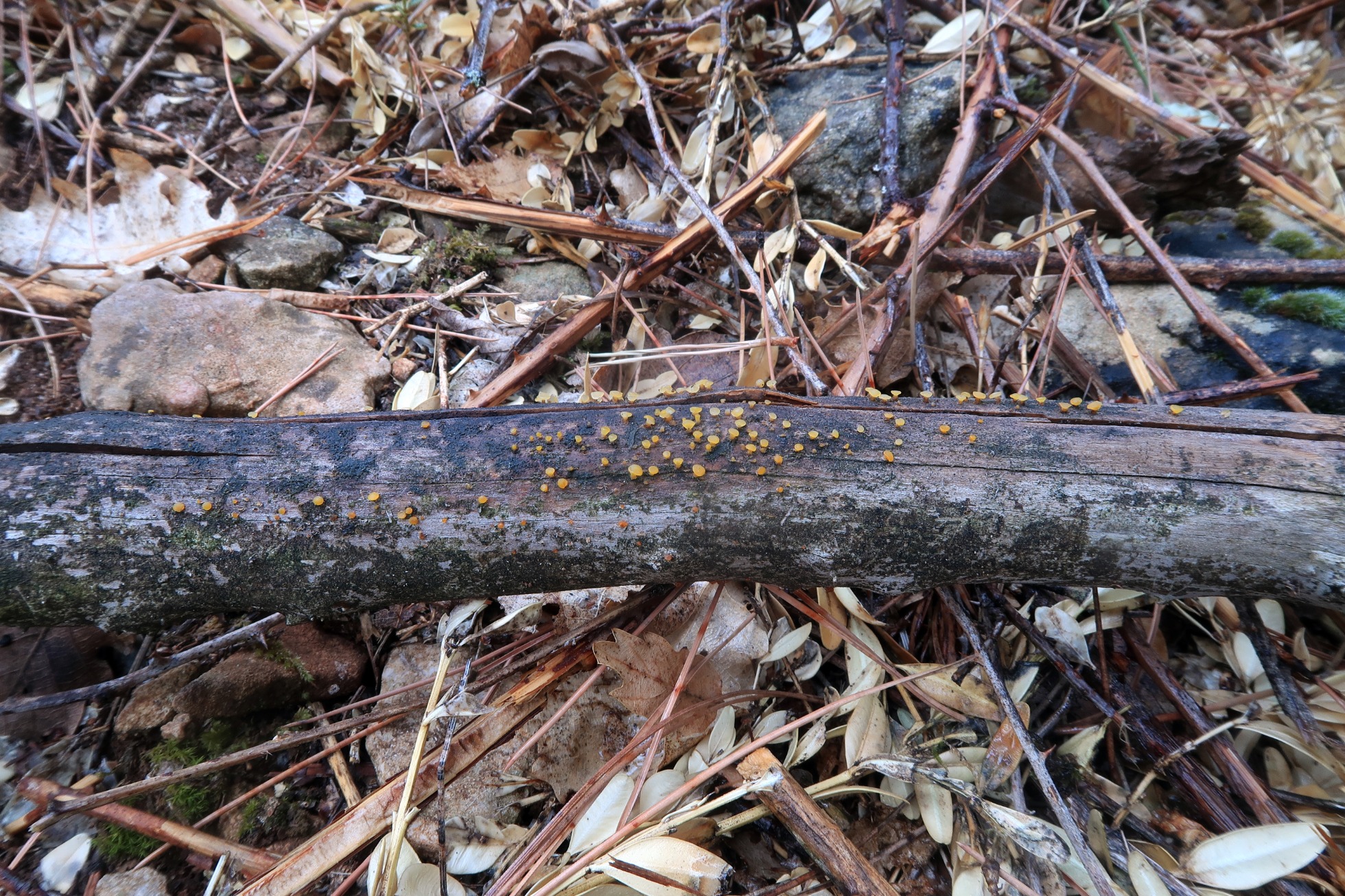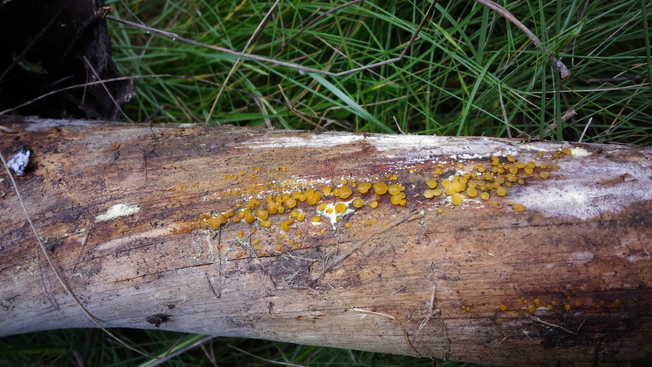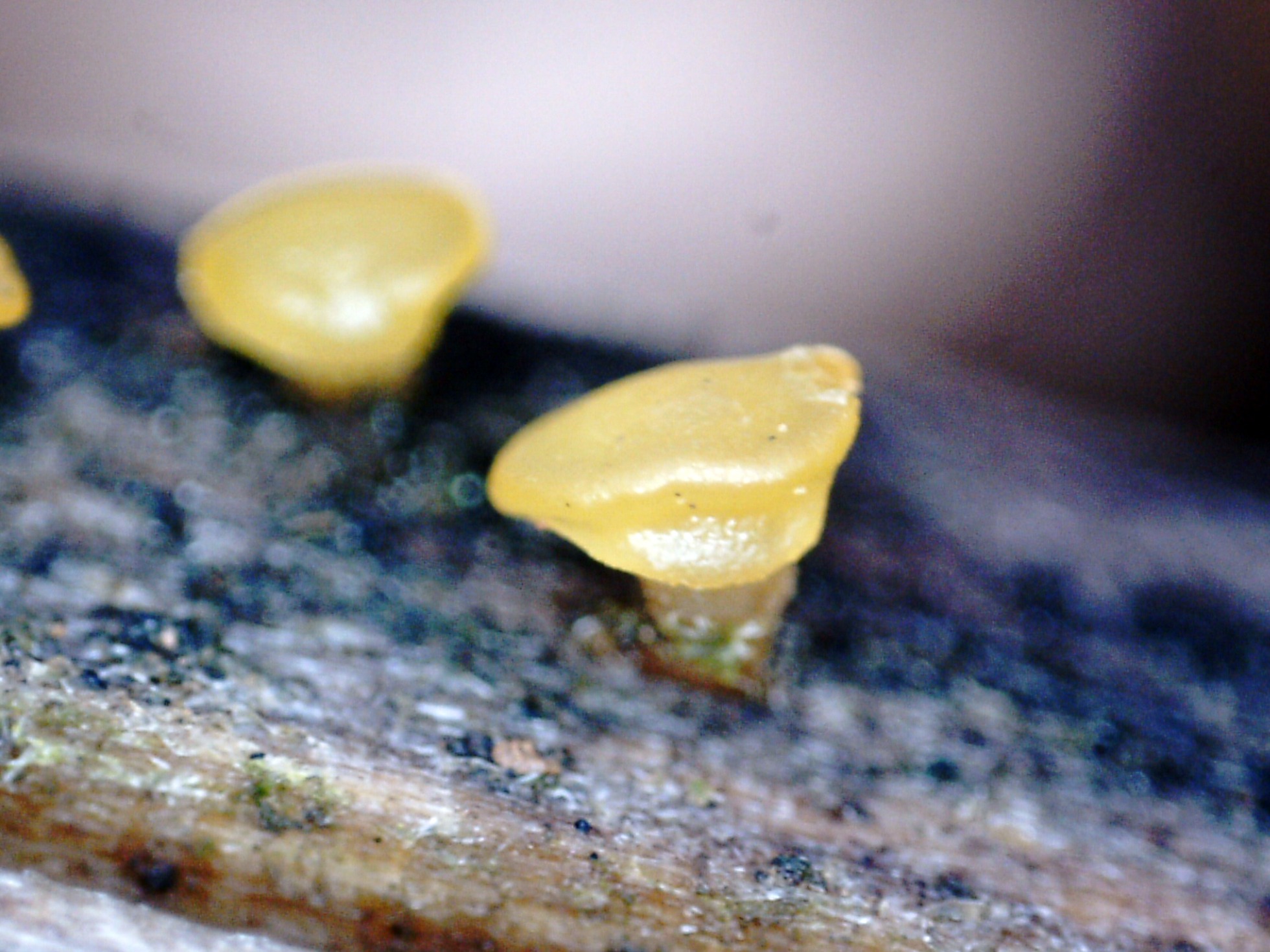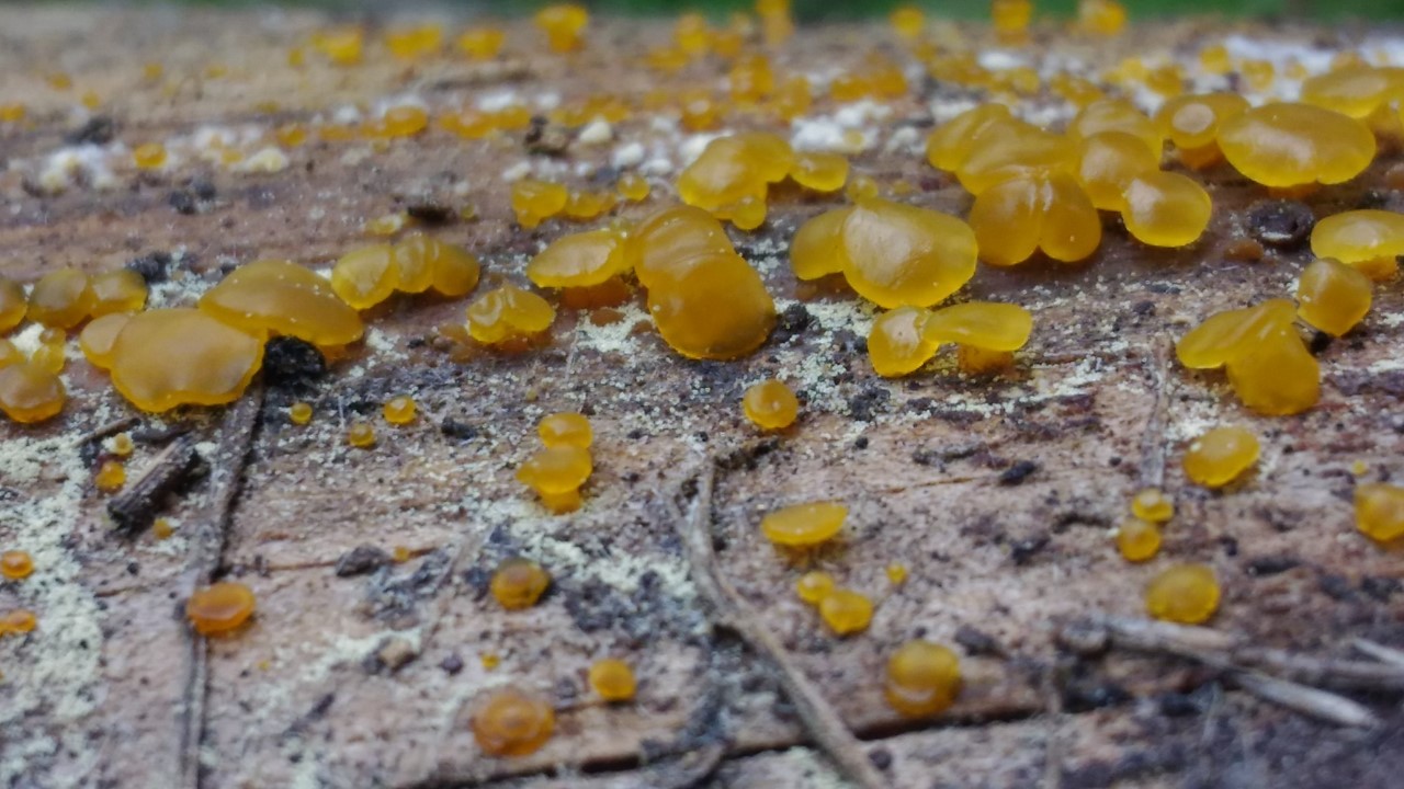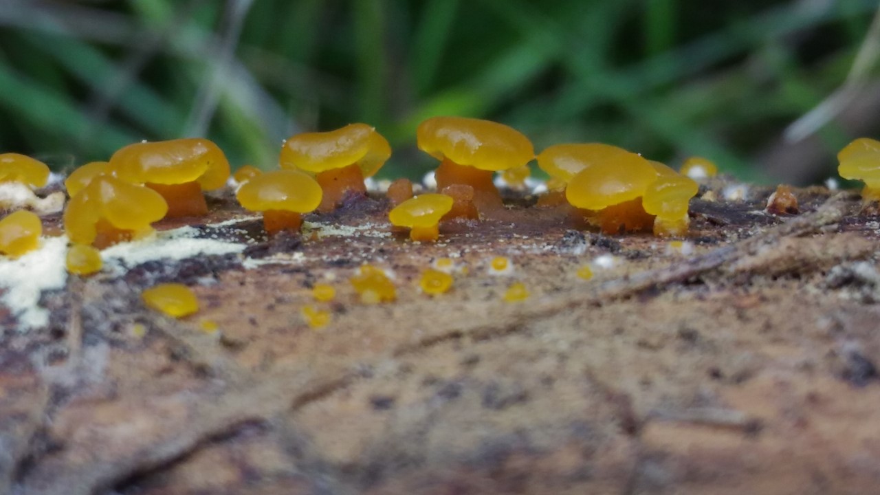 Un Dacrymycetal del 18 de agosto pasado que si bien ya me había encontrado allá por 2015, no lo había visto desde entonces y de él no disponía de su microscopía, tan solo conservaba una mala imágen de sus esporas.