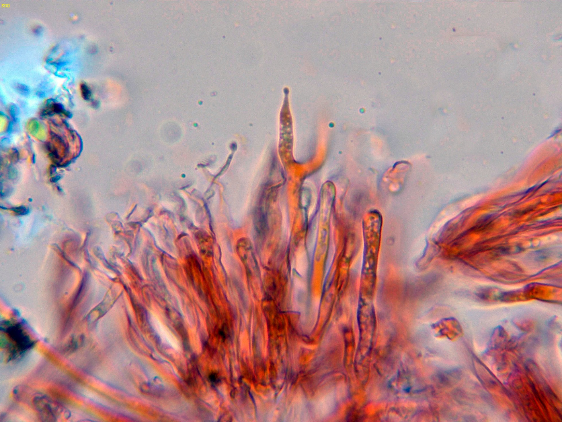 Los basidios con su típica forma de diapasón, con largos esterigmas: