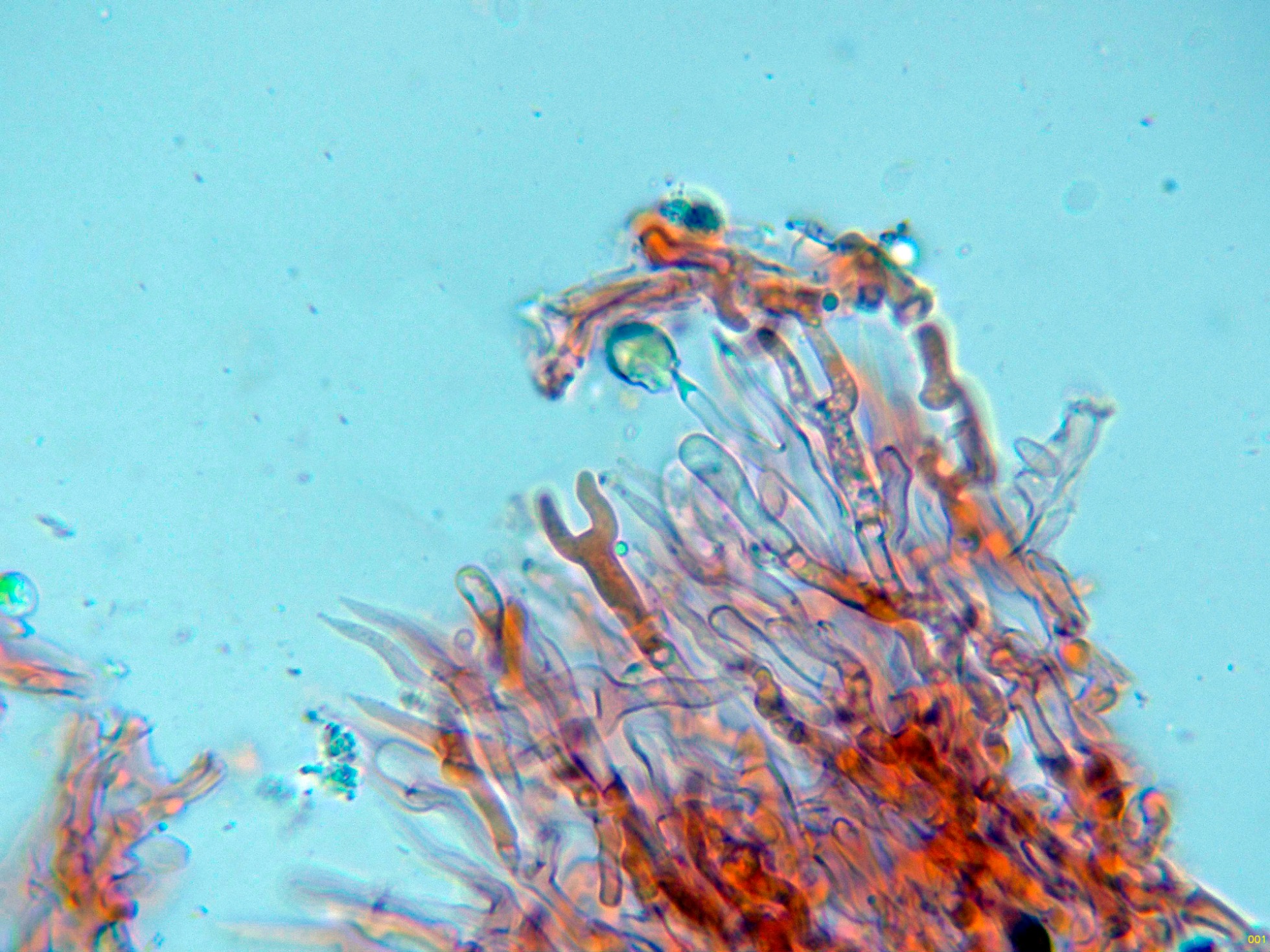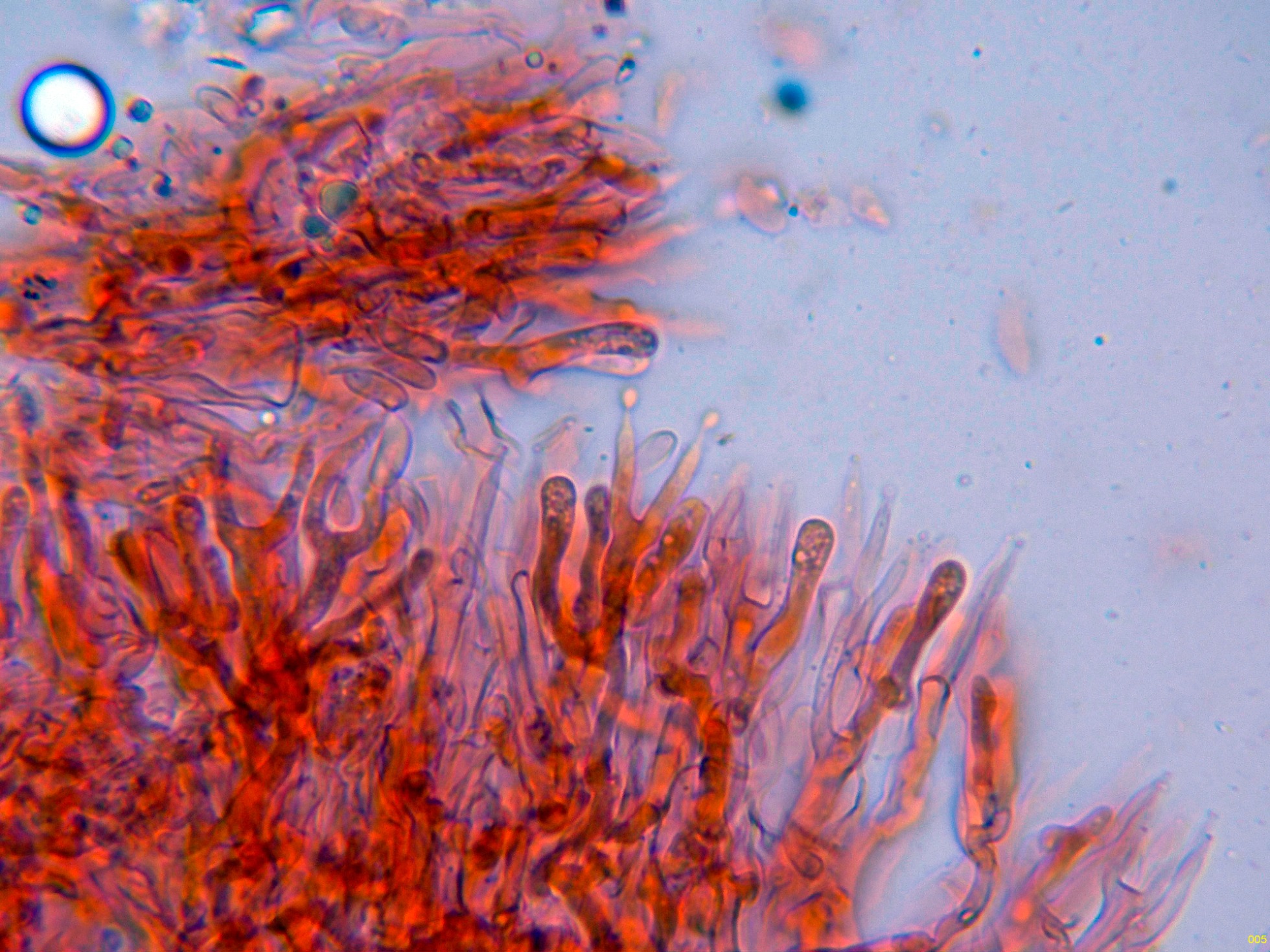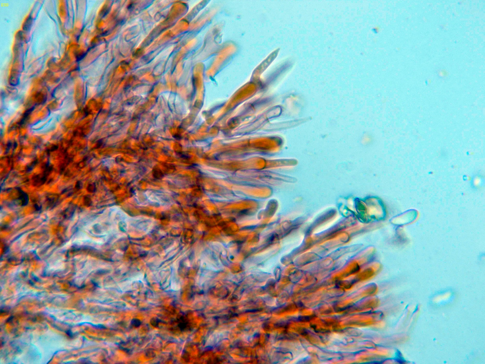 Los basidios con forma de diapasón, con unas medidas de (12.1) 16.8 - 22.8 (23.7) × (2.6) 3.4 - 4.2 (4.4) µm., y con unos esterigmas con unas medidas de (10.3) 11 - 15.3 (15.9) × (1.5) 1.9 - 2.3 (2.7) µm.