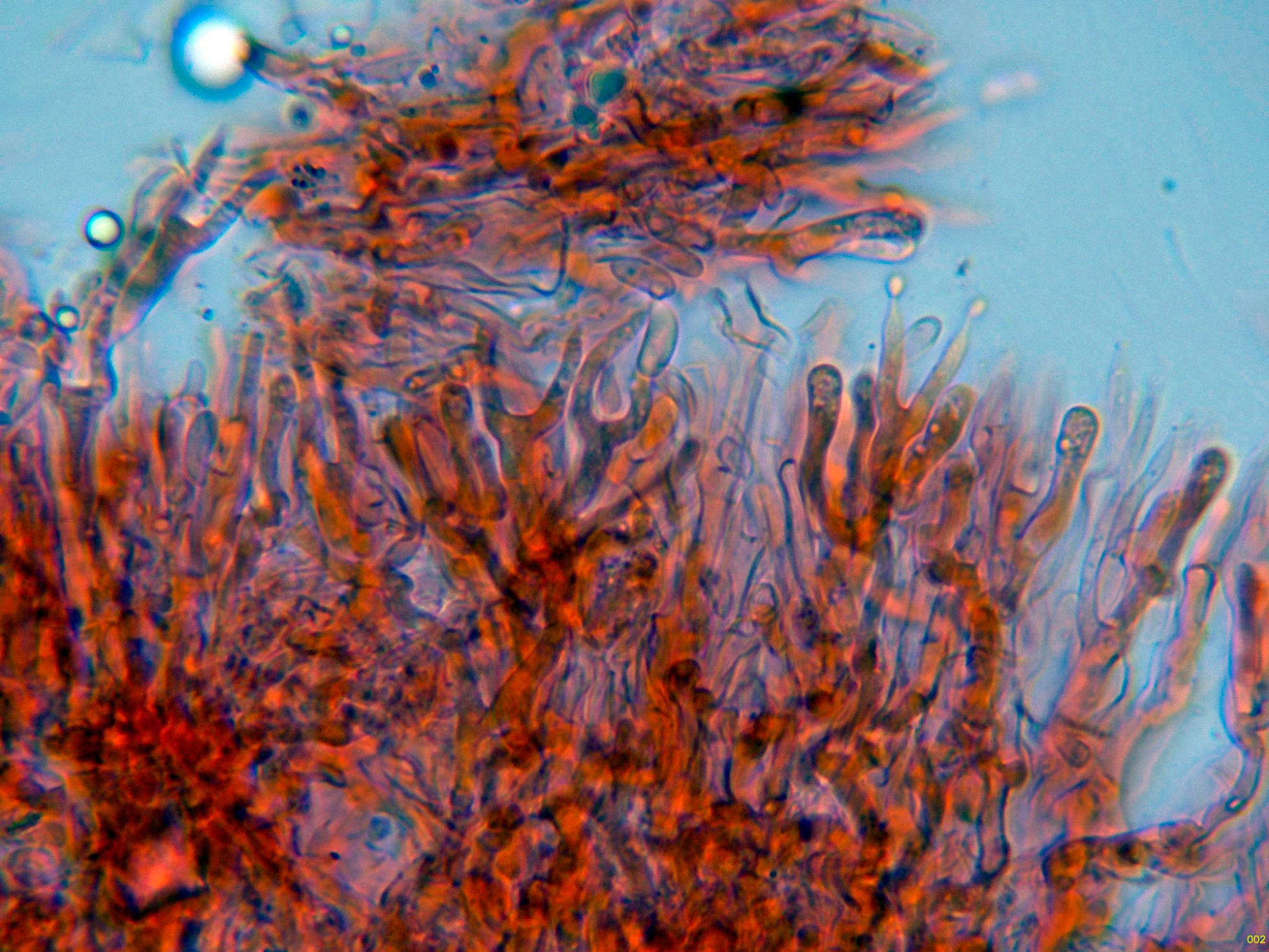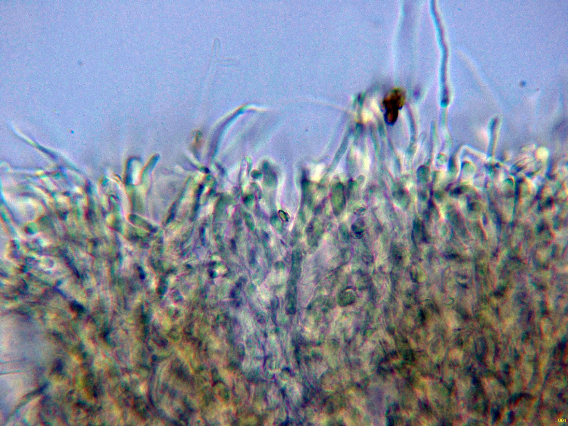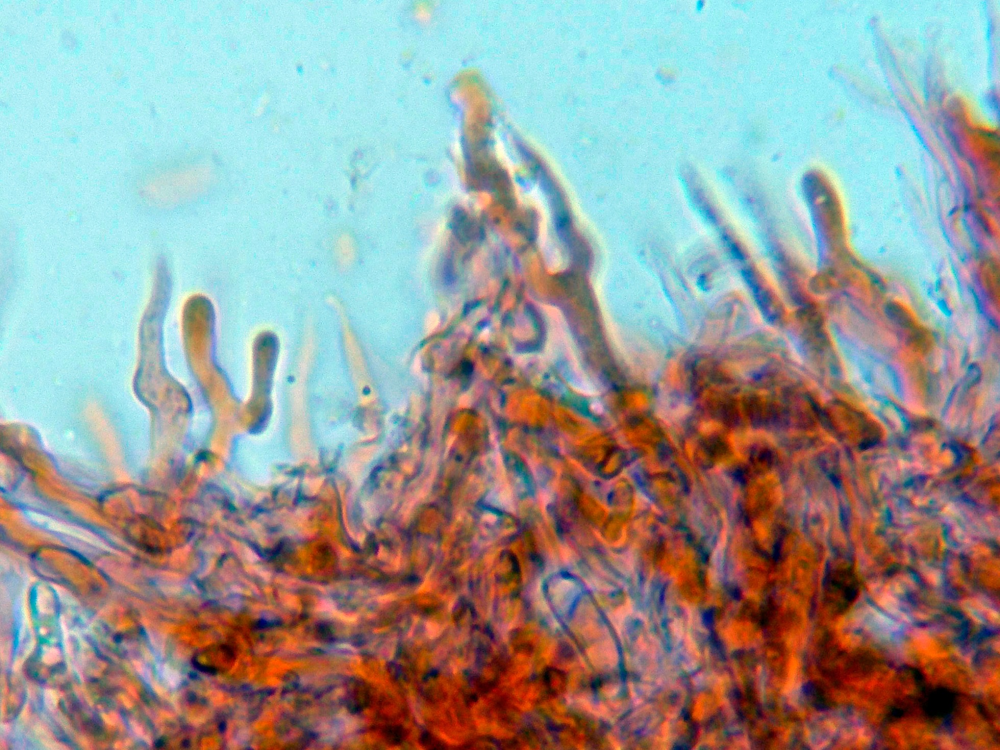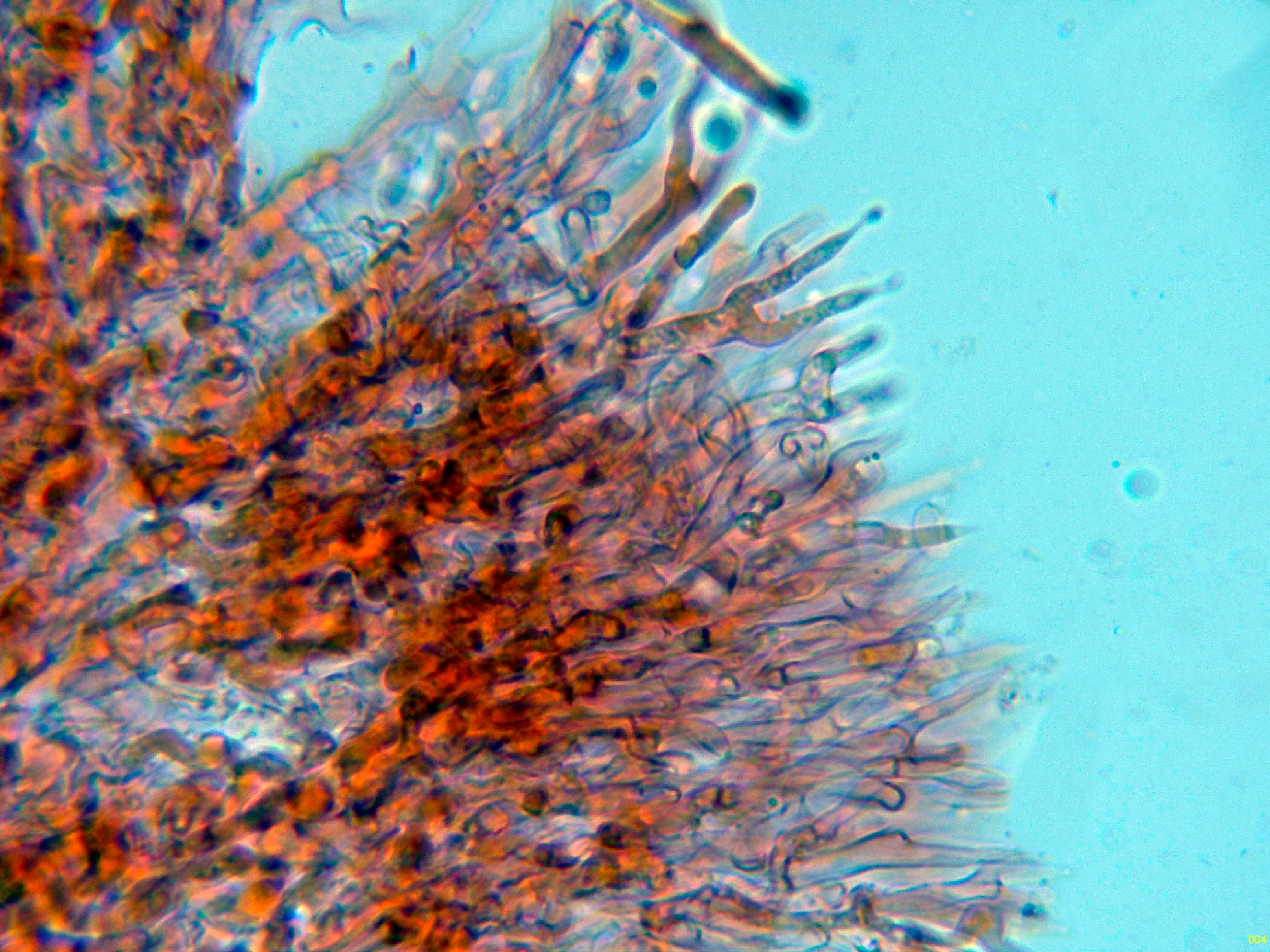 Los basidios con forma de diapasón, con unas medidas de (12.1) 16.8 - 22.8 (23.7) × (2.6) 3.4 - 4.2 (4.4) µm., y con unos esterigmas con unas medidas de (10.3) 11 - 15.3 (15.9) × (1.5) 1.9 - 2.3 (2.7) µm.