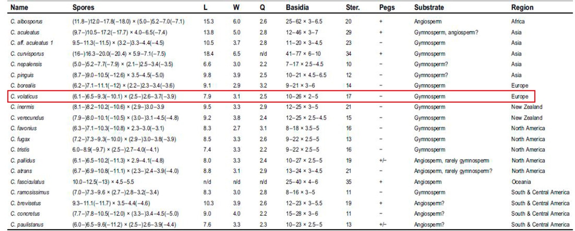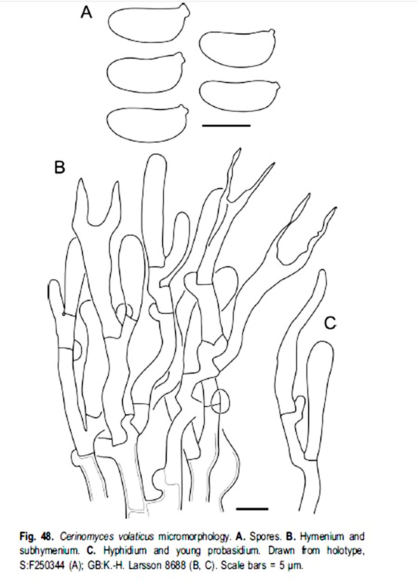 En la imágen se citan unas medidas esporales para el Cerinomyces volaticus de (6.1–)6.5–9.3(–10.1) × (2.5–) 2.6–3.7(–3.9) μm, muy concordantes con las del presente estudio de (7.5) 7.9 - 9 (10.3) × (2.7) 3 - 3.4 (3.5) µm., además de las medidas de los basidios de 10–26 × 2–5 μm, y en mi estudio de 12.1- 23.7 × 2.6 - 4.4 µm., amén de la longitud de los esterigmas, según el documento de hasta 17 µm., y en mi estudio de hasta 15.9 µm.