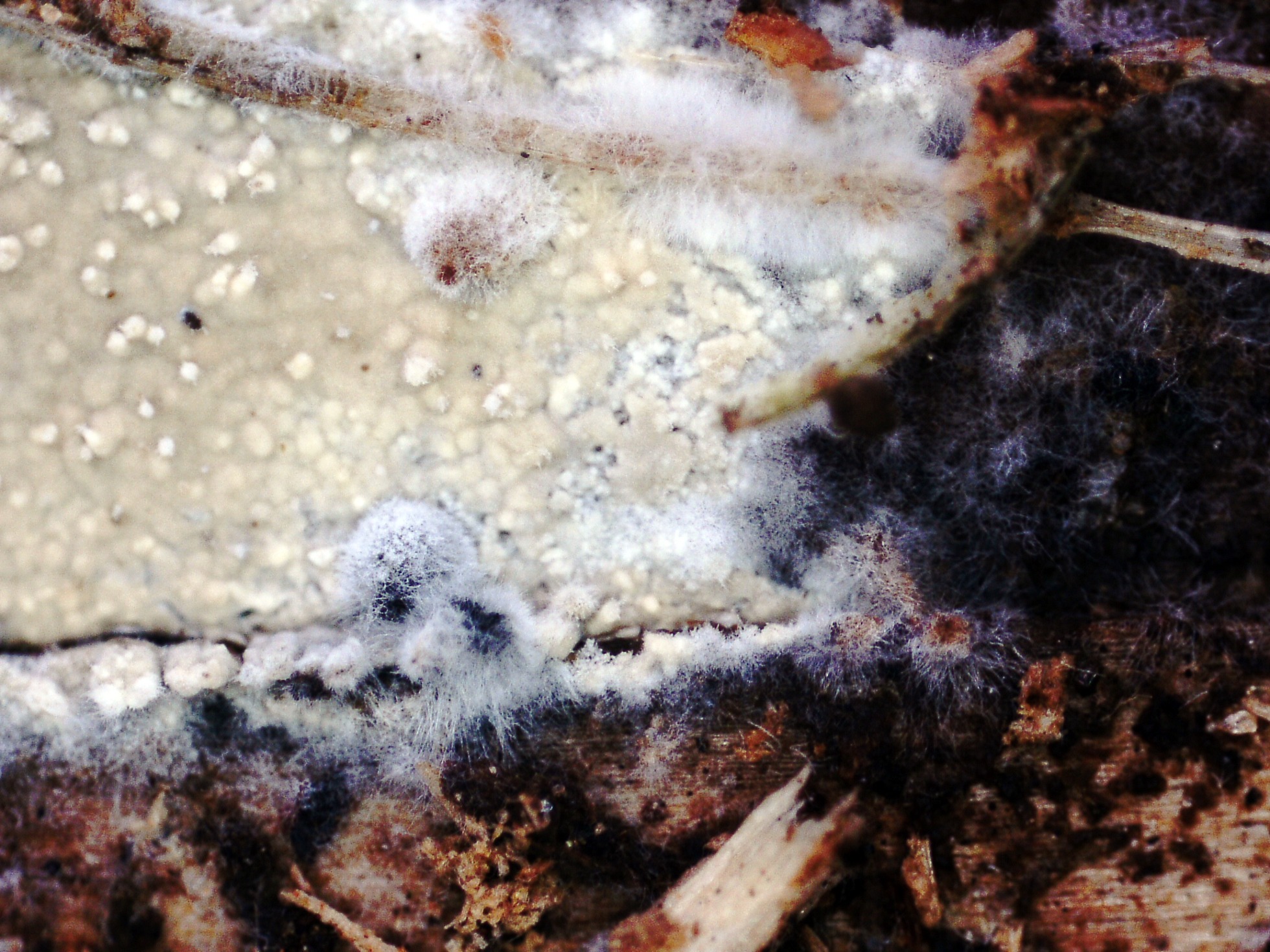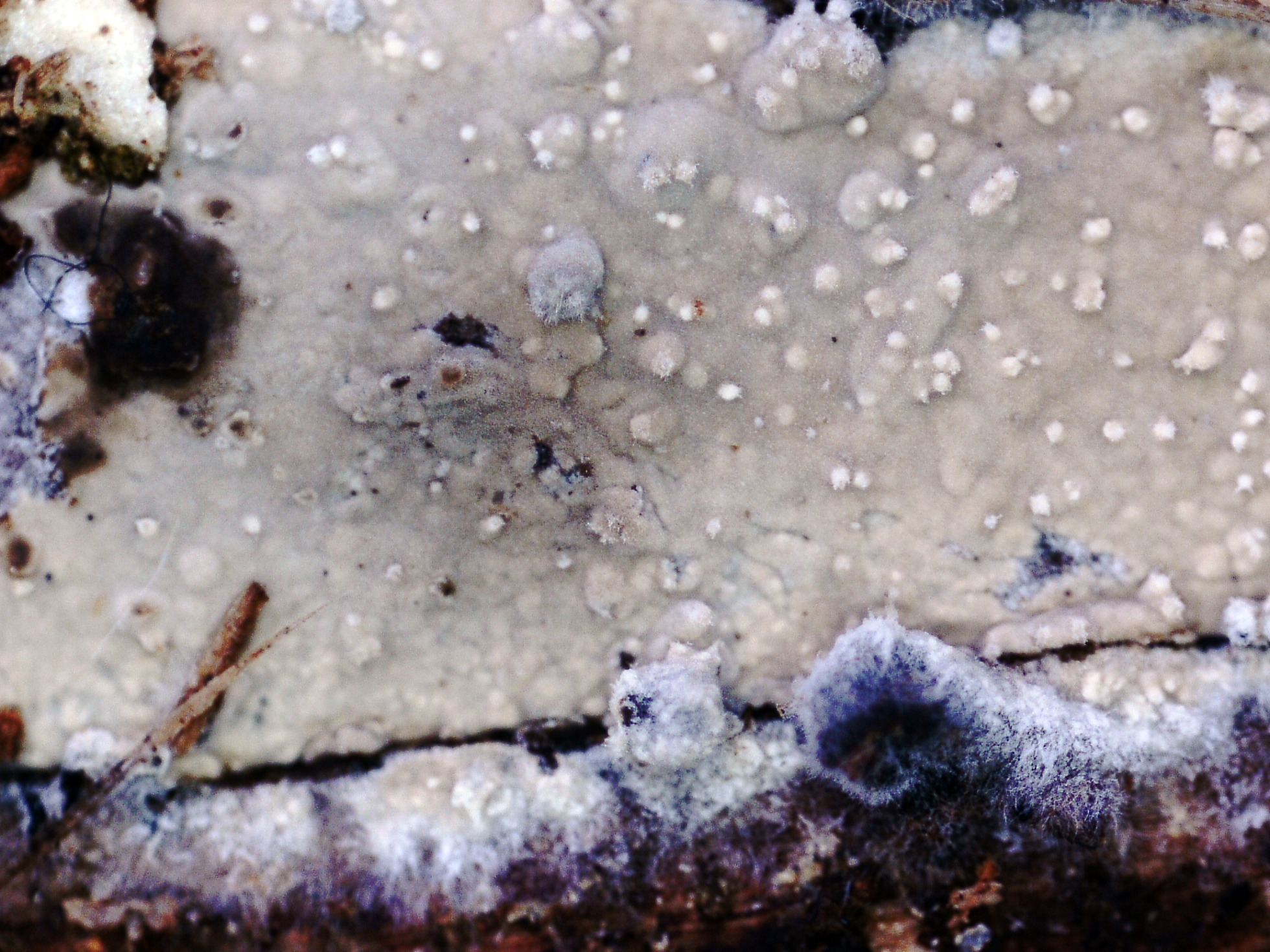 Observaciones: Determinación hecha siguiendo el criterio de las Claves de Ryvarden "Corticiaceae of North Europe", que me conducen irremediablemente al género Cerinomyces, en el trabajo del mismo autor solo se describe uno, el Cerinomyces crustulinus, según la descripción de consistencia gelatinosa y esporas de mayor tamaño 7-12 x 2.5-4 µm., además consultando el trabajo del maestro Enrique Rubio se indican para el Cerinomyces crustulinus unas medidas esporales de 9.9-13 x 3.9-4.4 µm. en ambos casos considerablemente por encima.