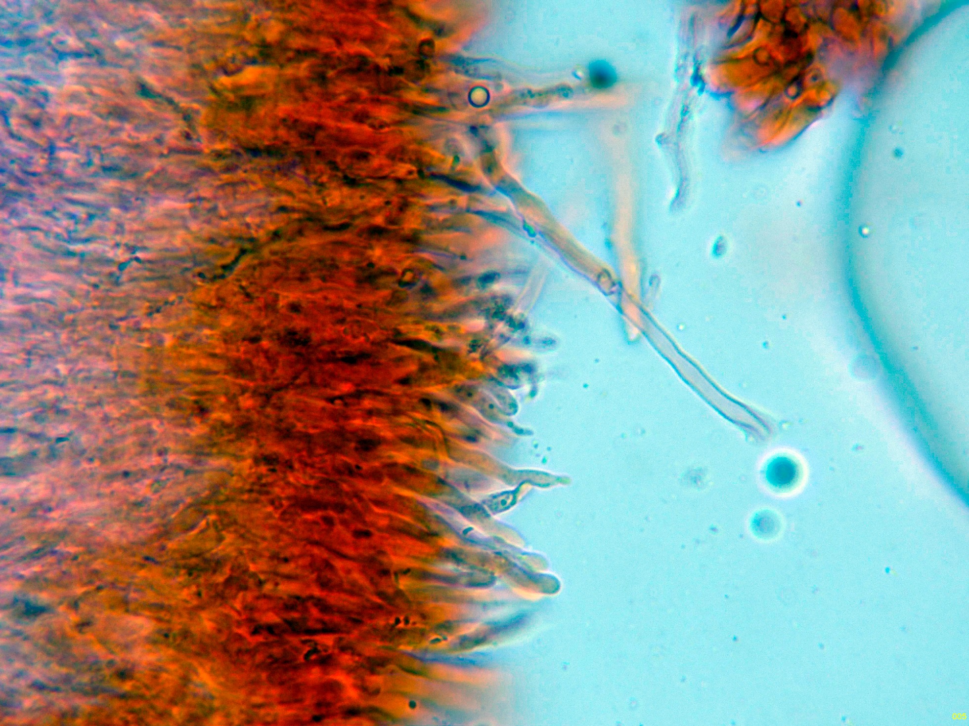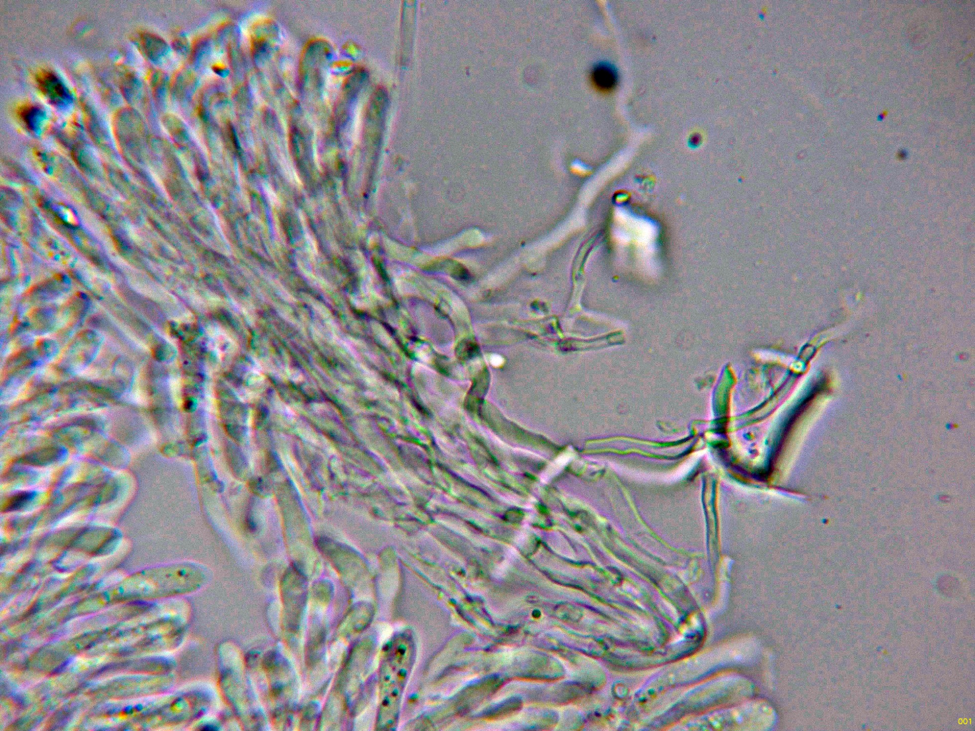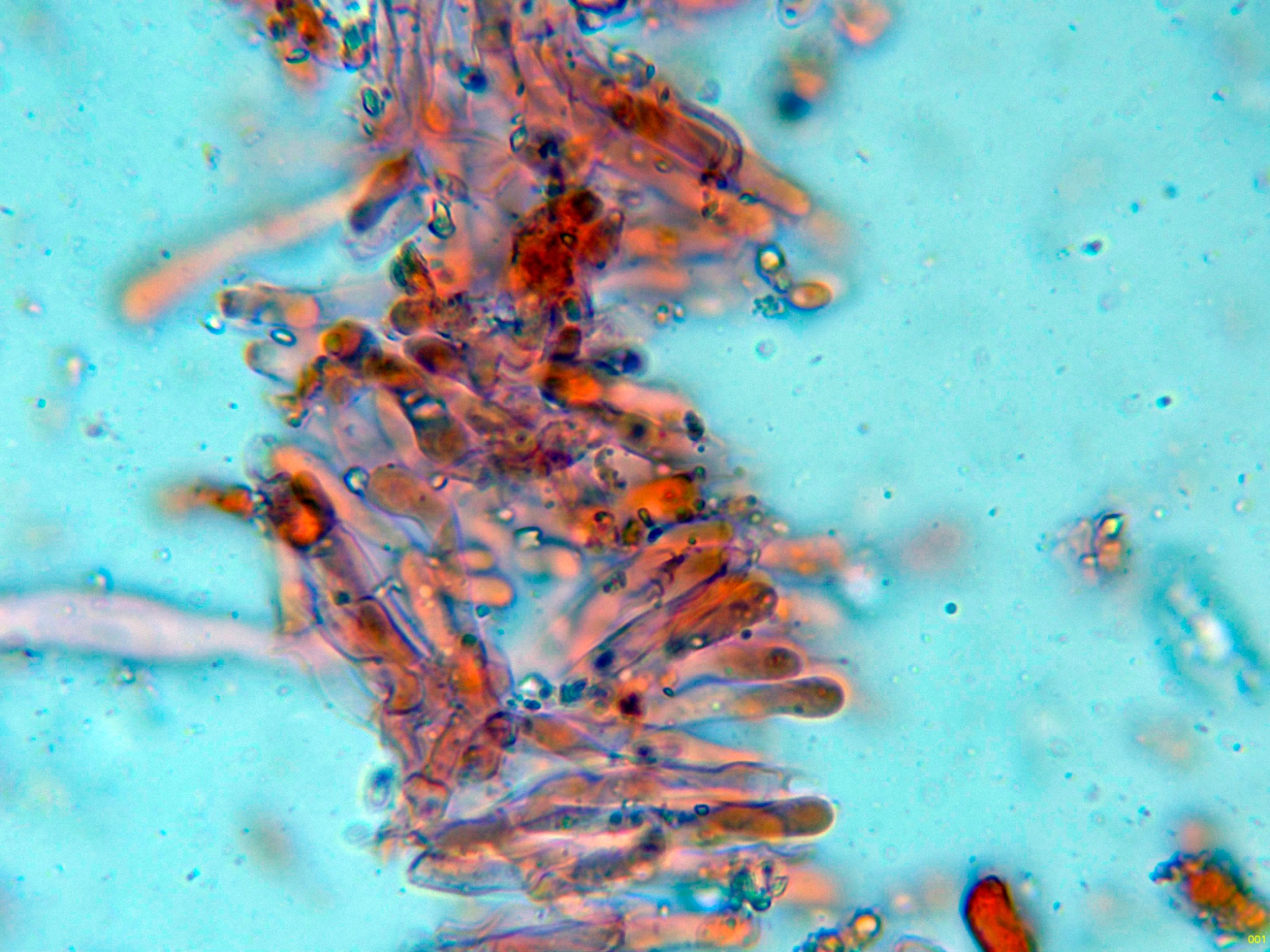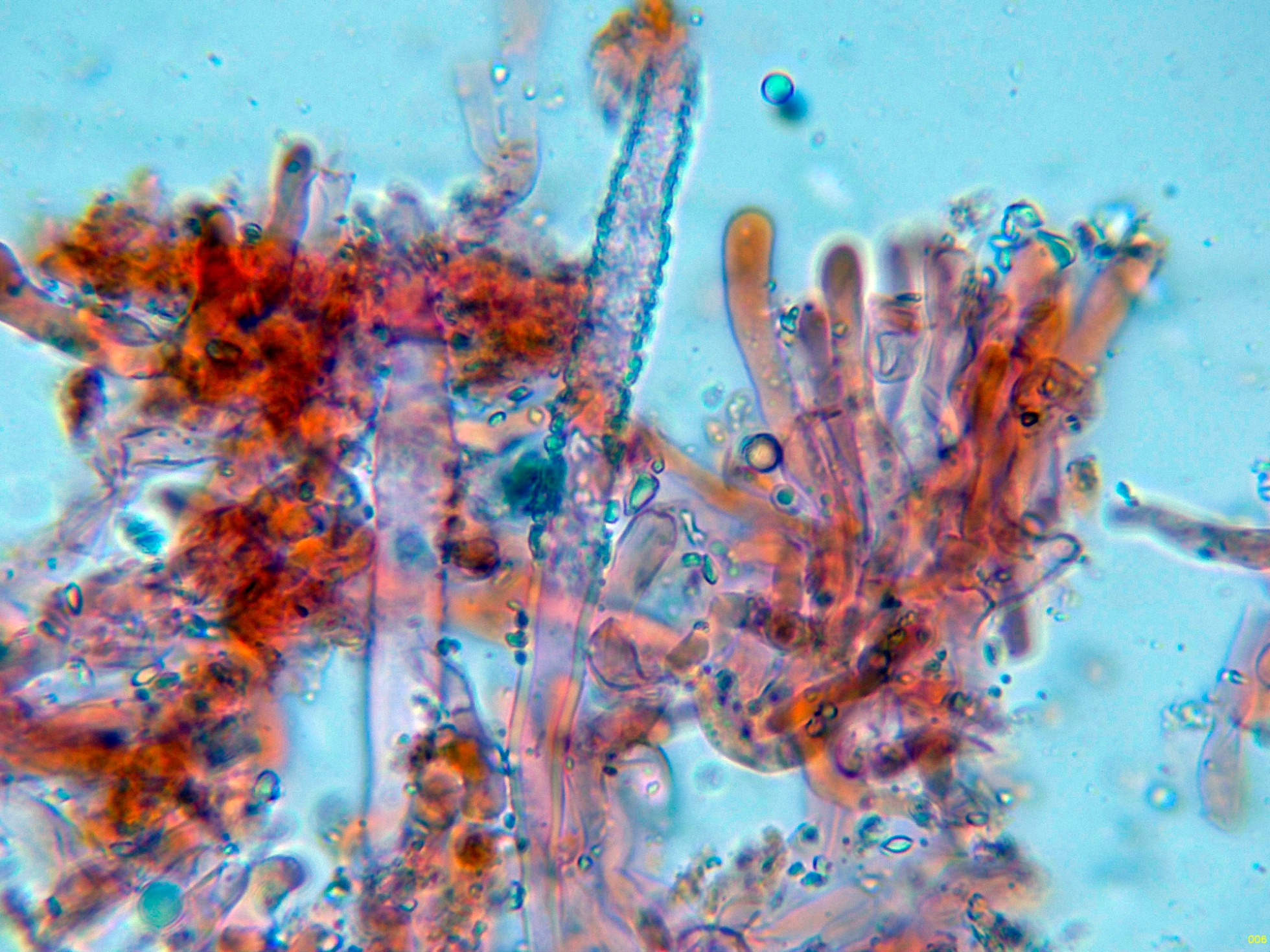 Otro Corticial, un Phanerochaete, a mi entender uno de los más abundantes, sus cistidios estrechos y que superan las 100 micras de longitud lo delatan, la Phanerochaete sordida.