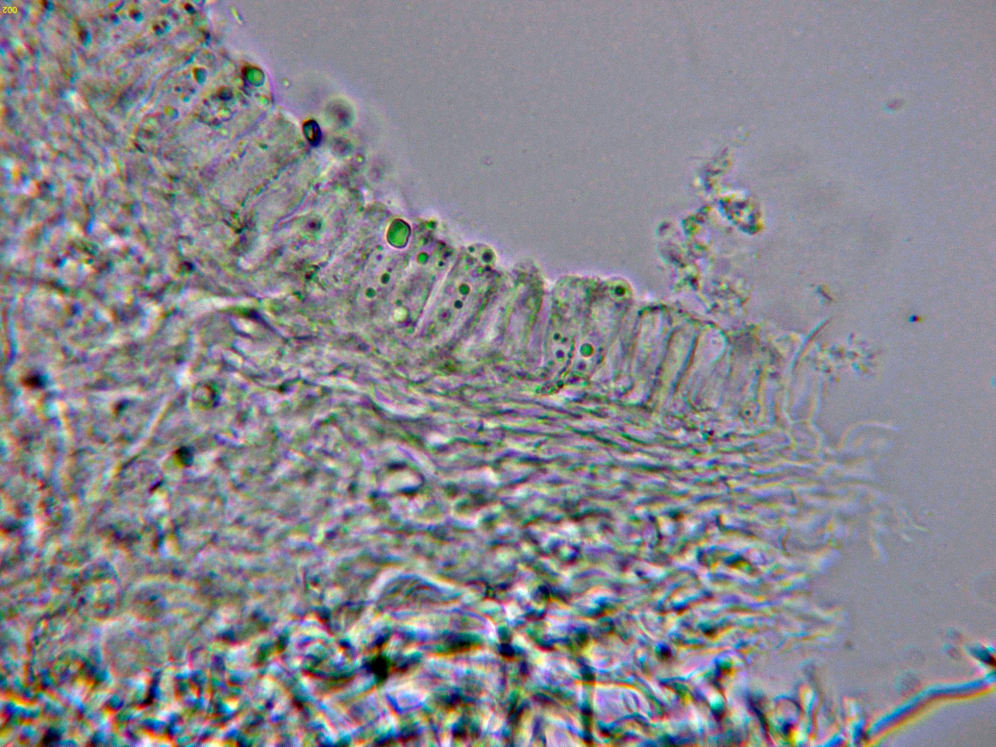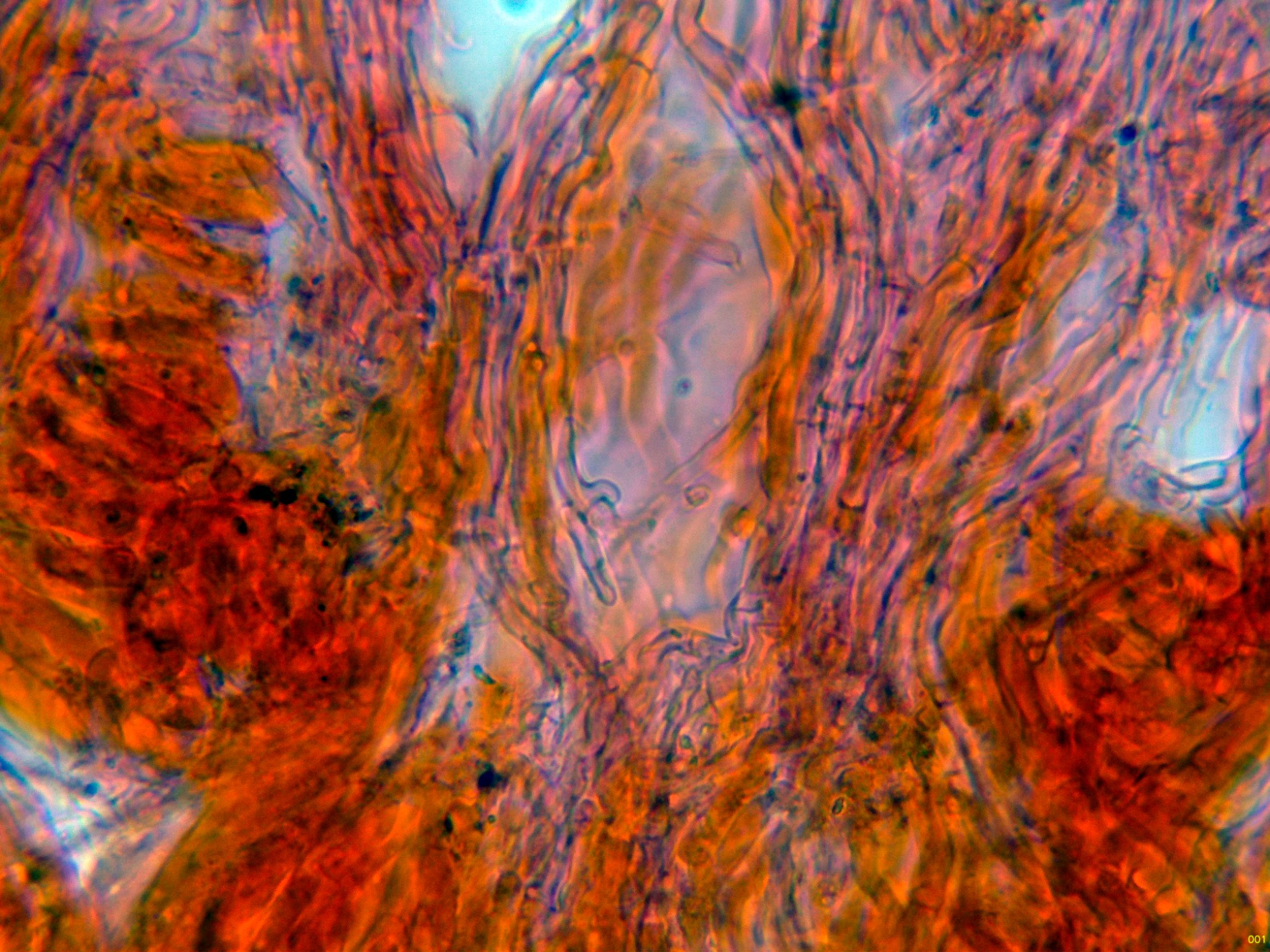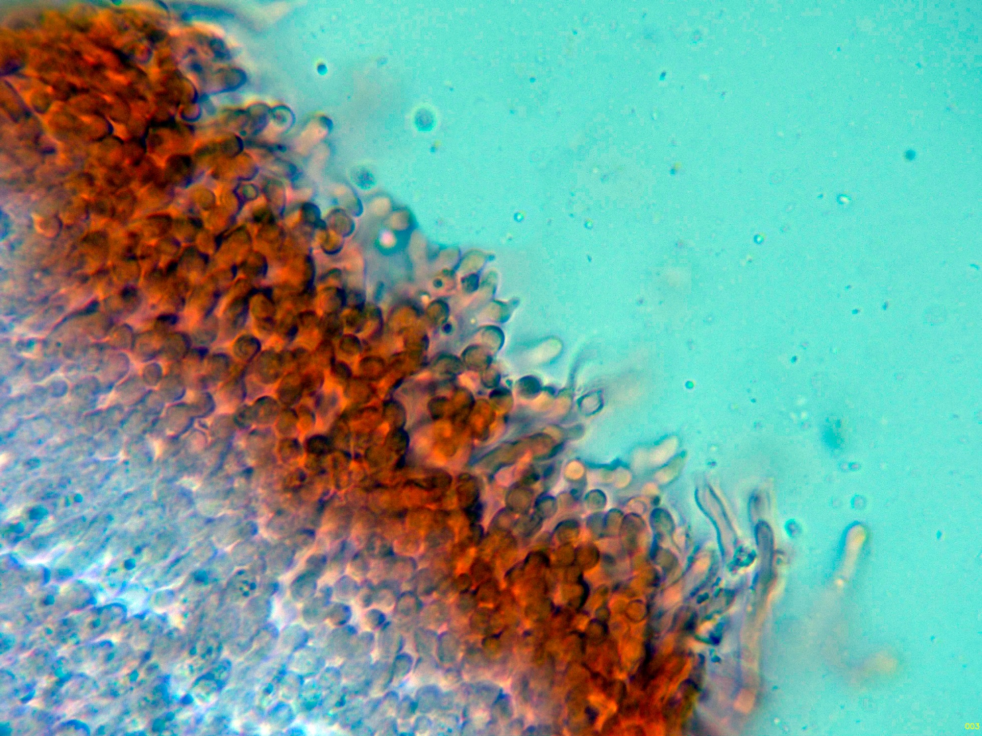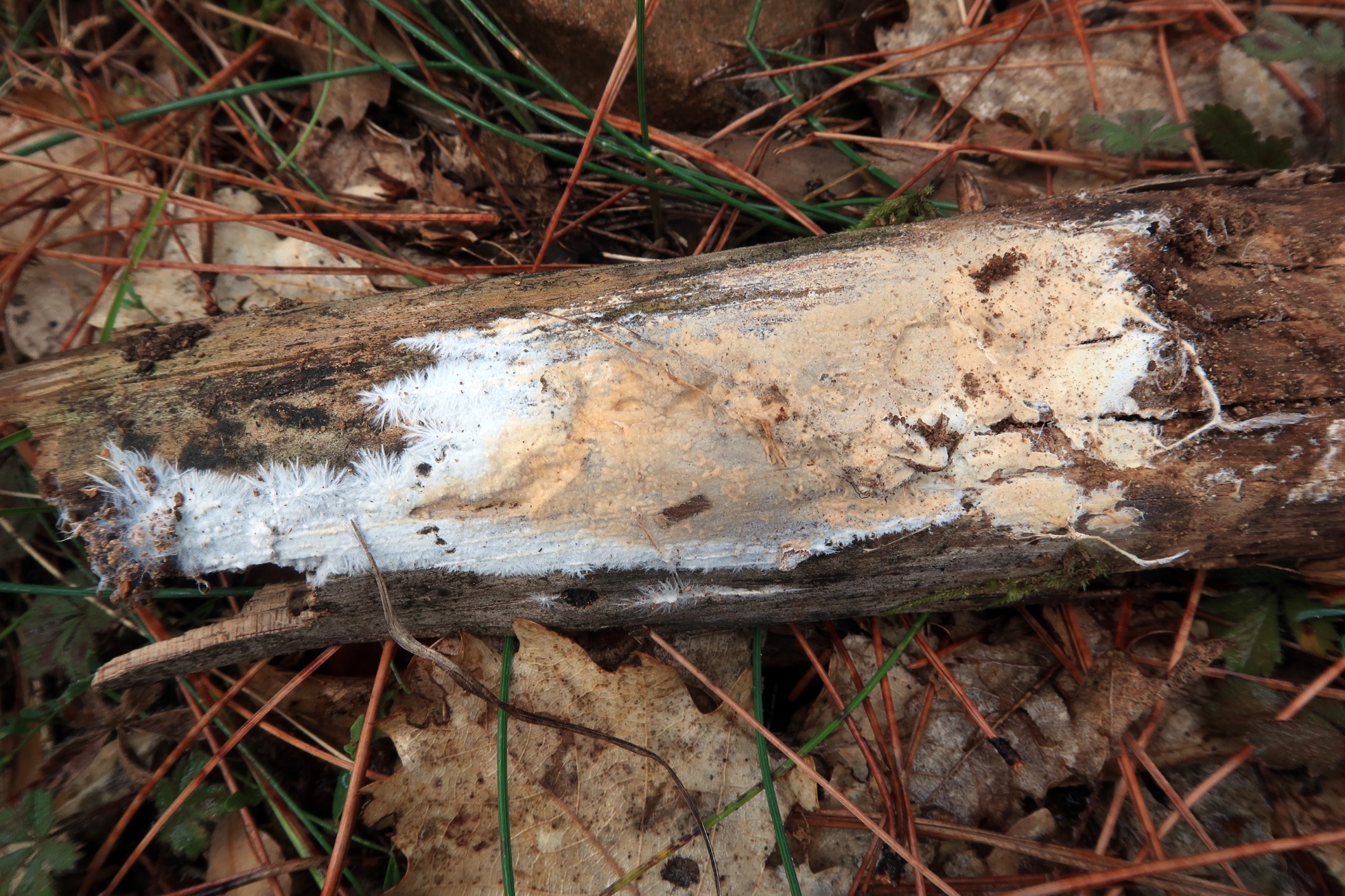 Otro Corticial, un Phanerochaete, a mi entender uno de los más abundantes, sus cistidios estrechos y que superan las 100 micras de longitud lo delatan, la Phanerochaete sordida.
