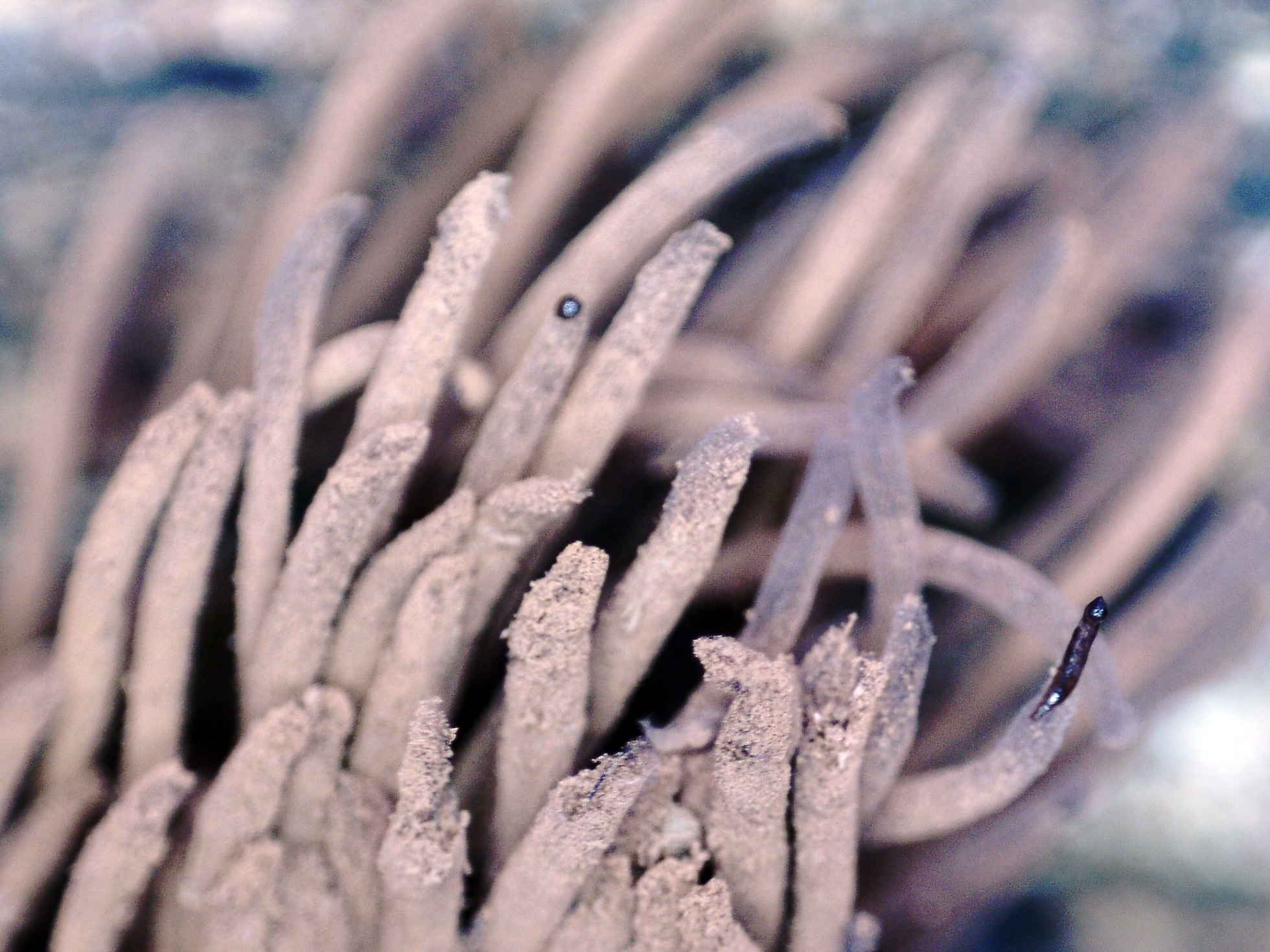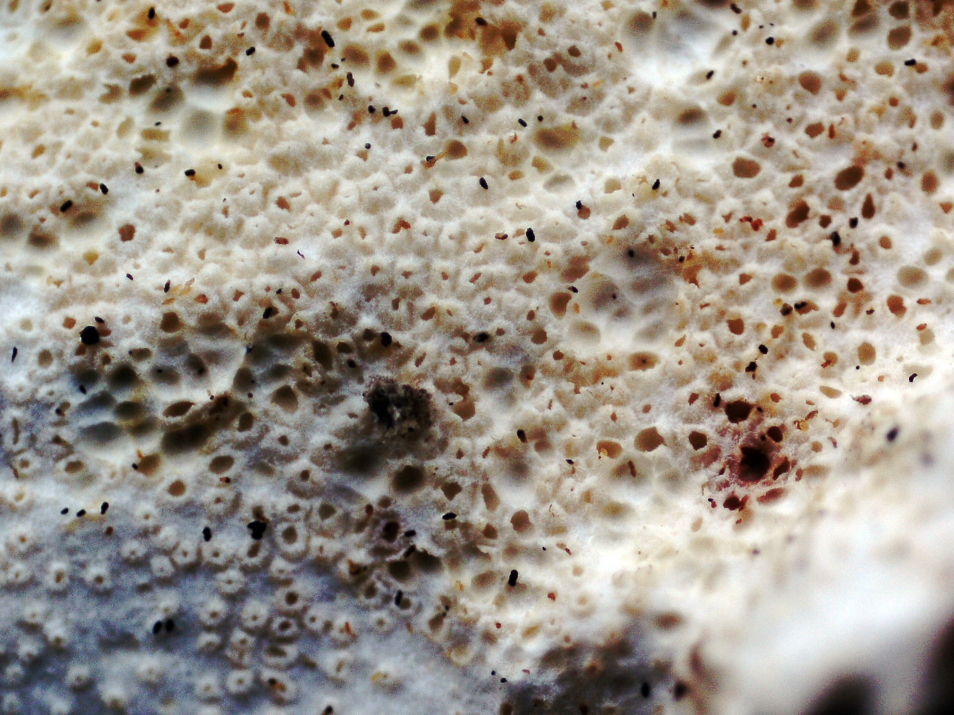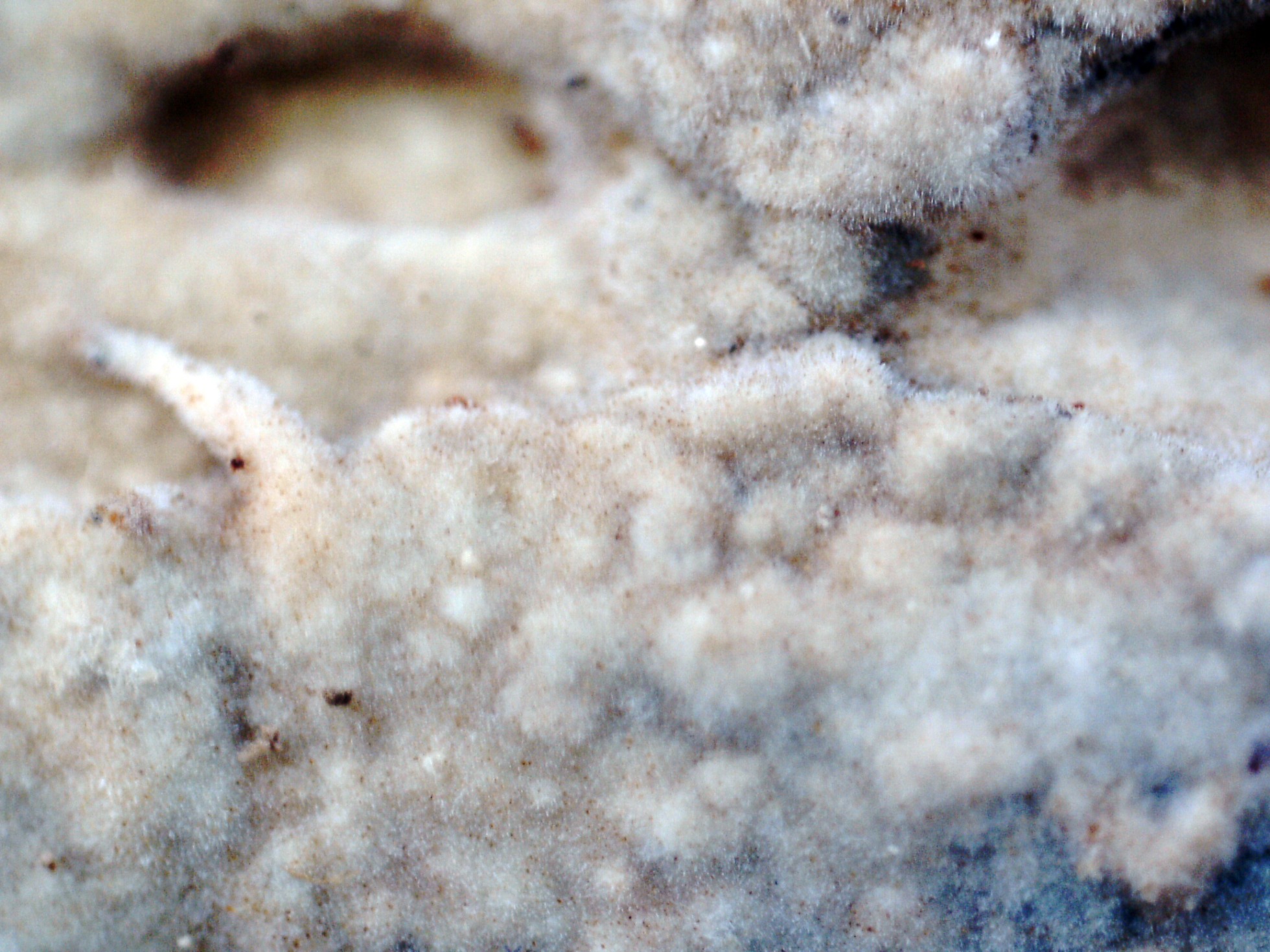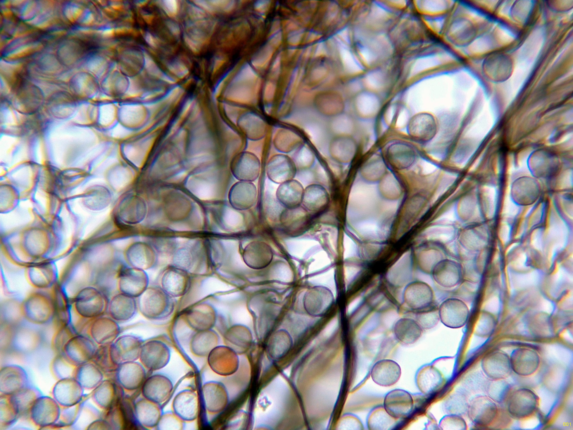 Otro Corticial, un Phanerochaete, a mi entender uno de los más abundantes, sus cistidios estrechos y que superan las 100 micras de longitud lo delatan, la Phanerochaete sordida.