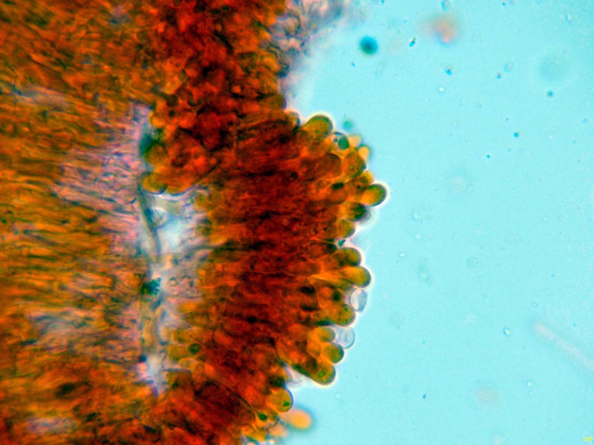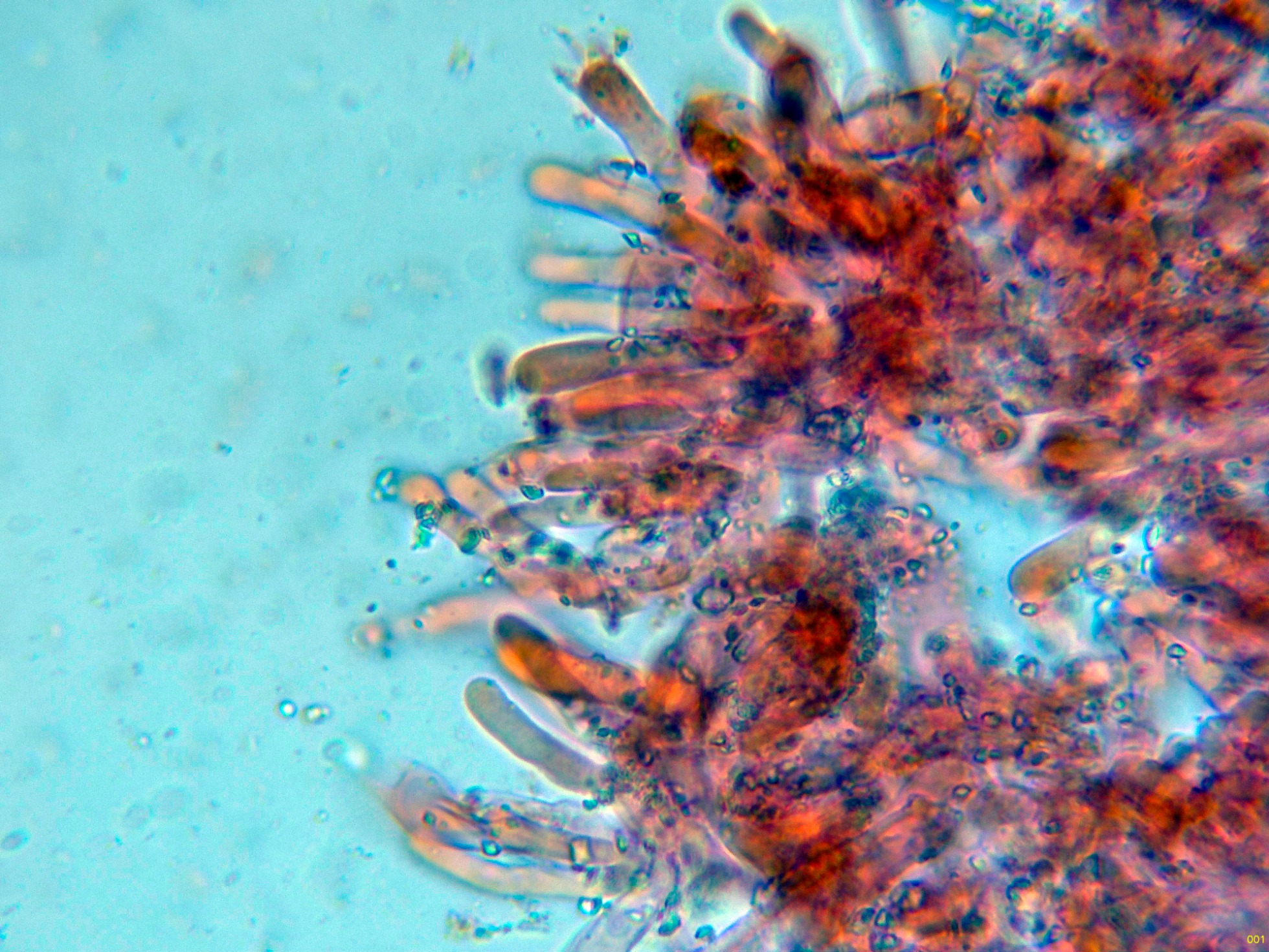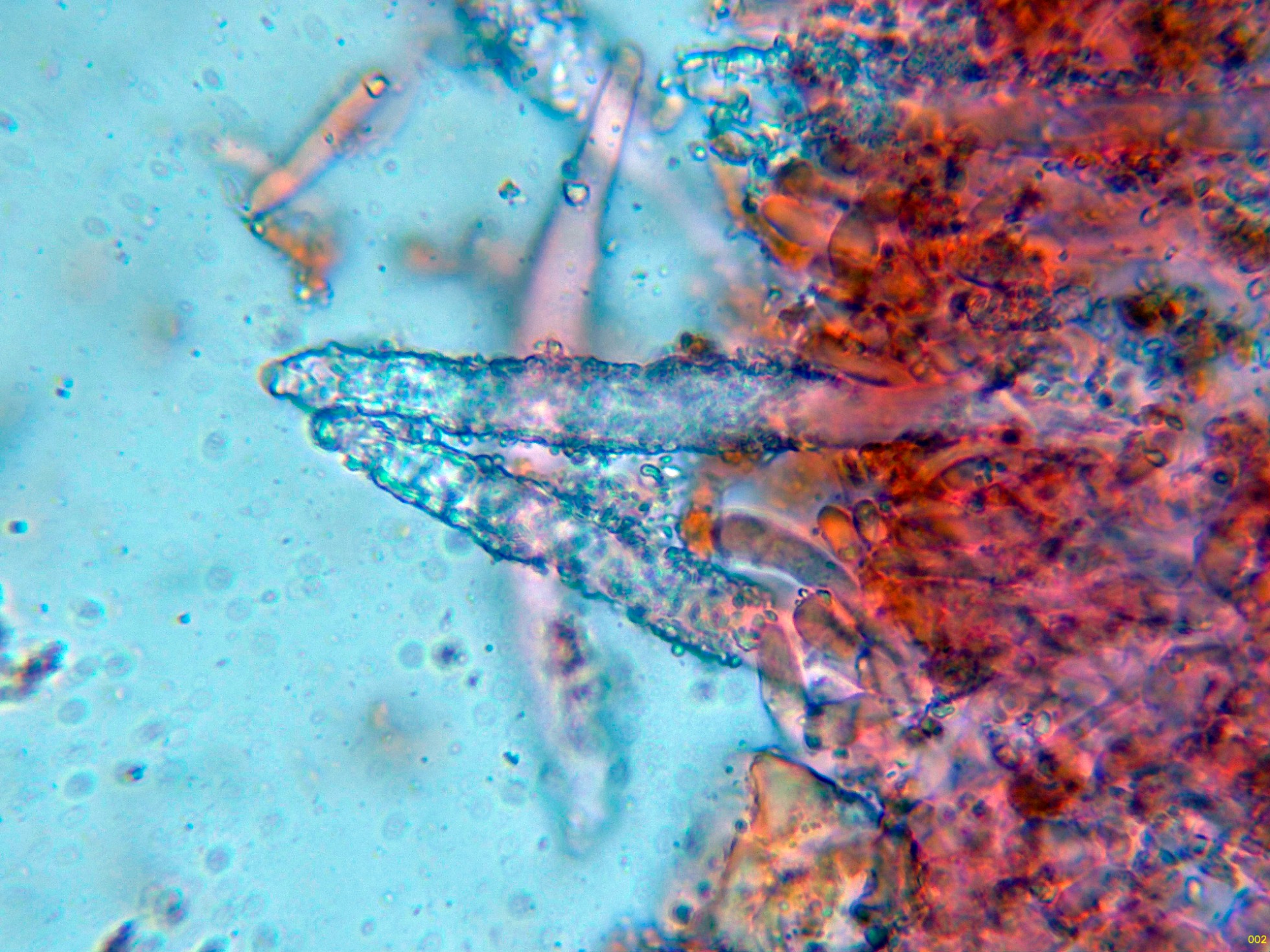 Sus cistidios cubiertos de cristalizaciones, estos cistidios con unas medidas de (81.3) 87.8 - 103.6 (112) × (7.4) 7.8 - 9.4 (9.5) µm.: