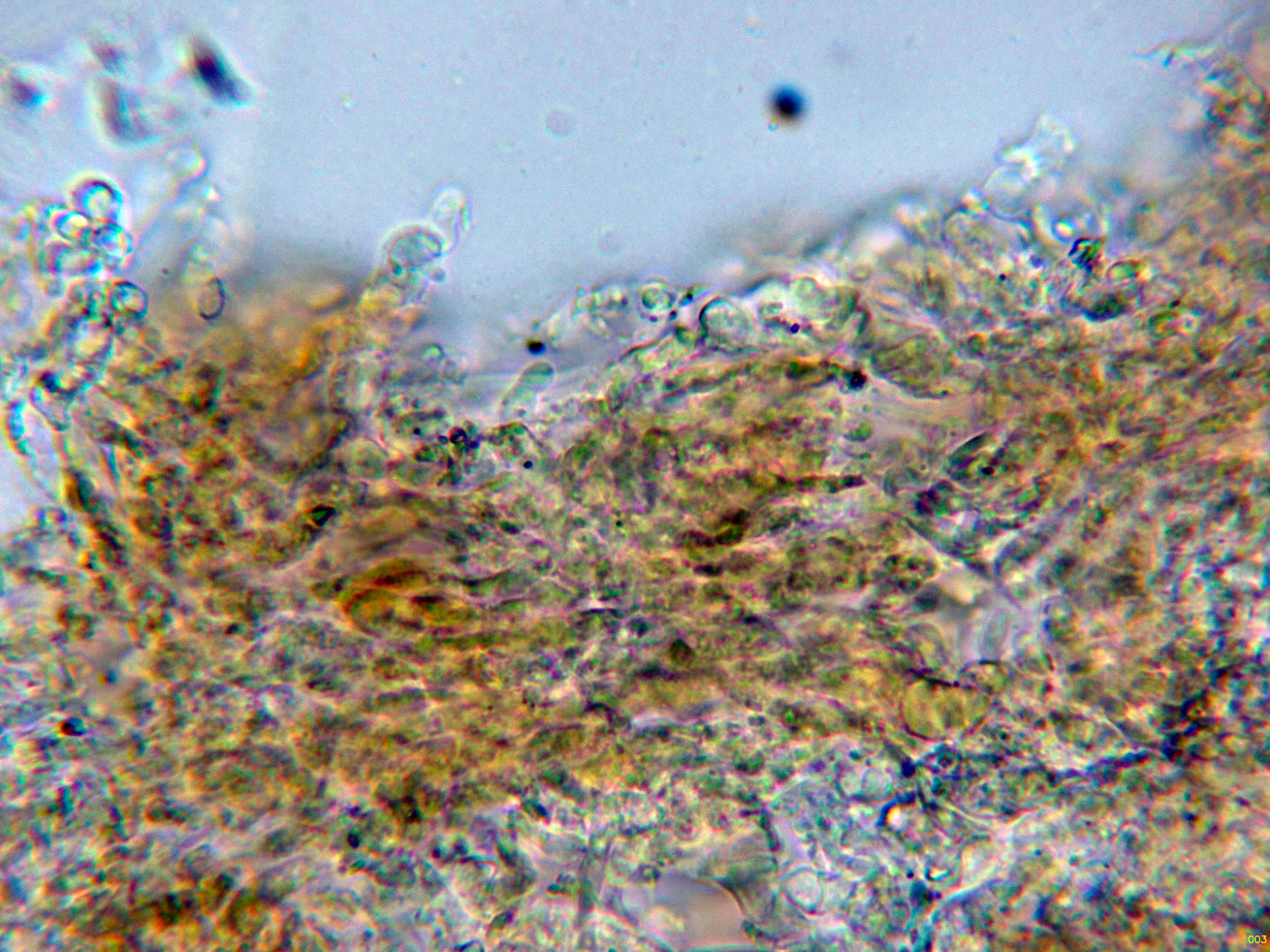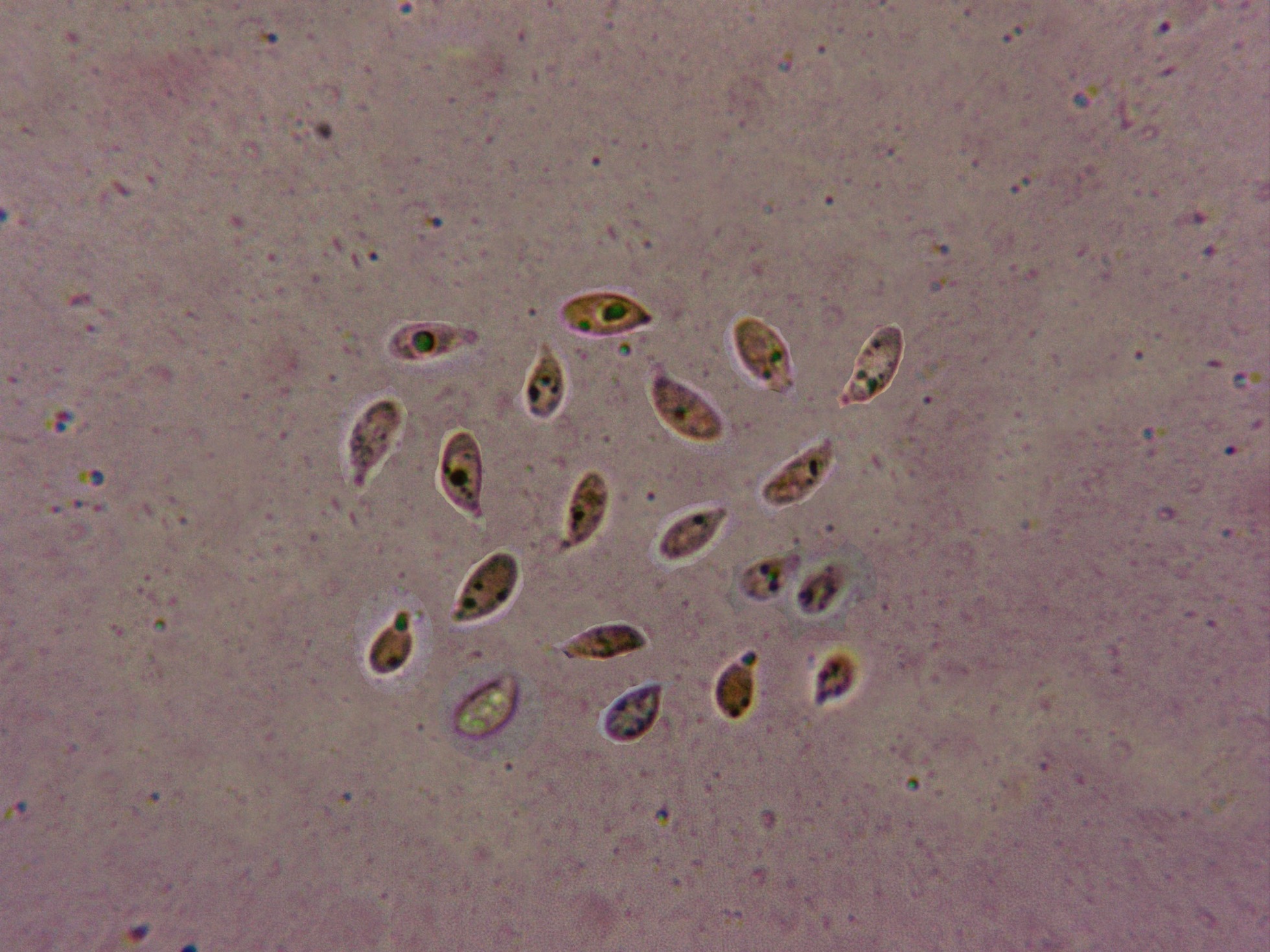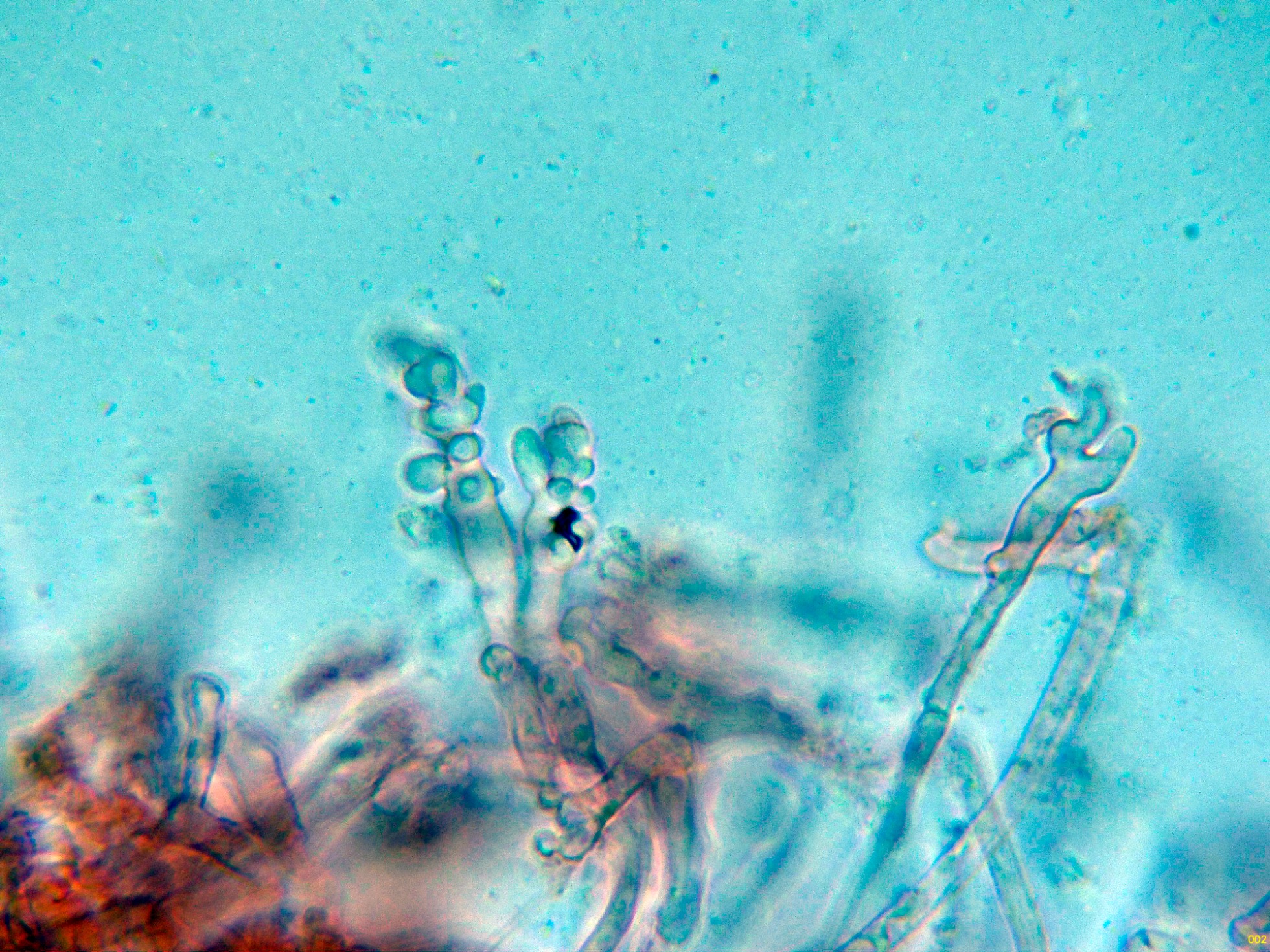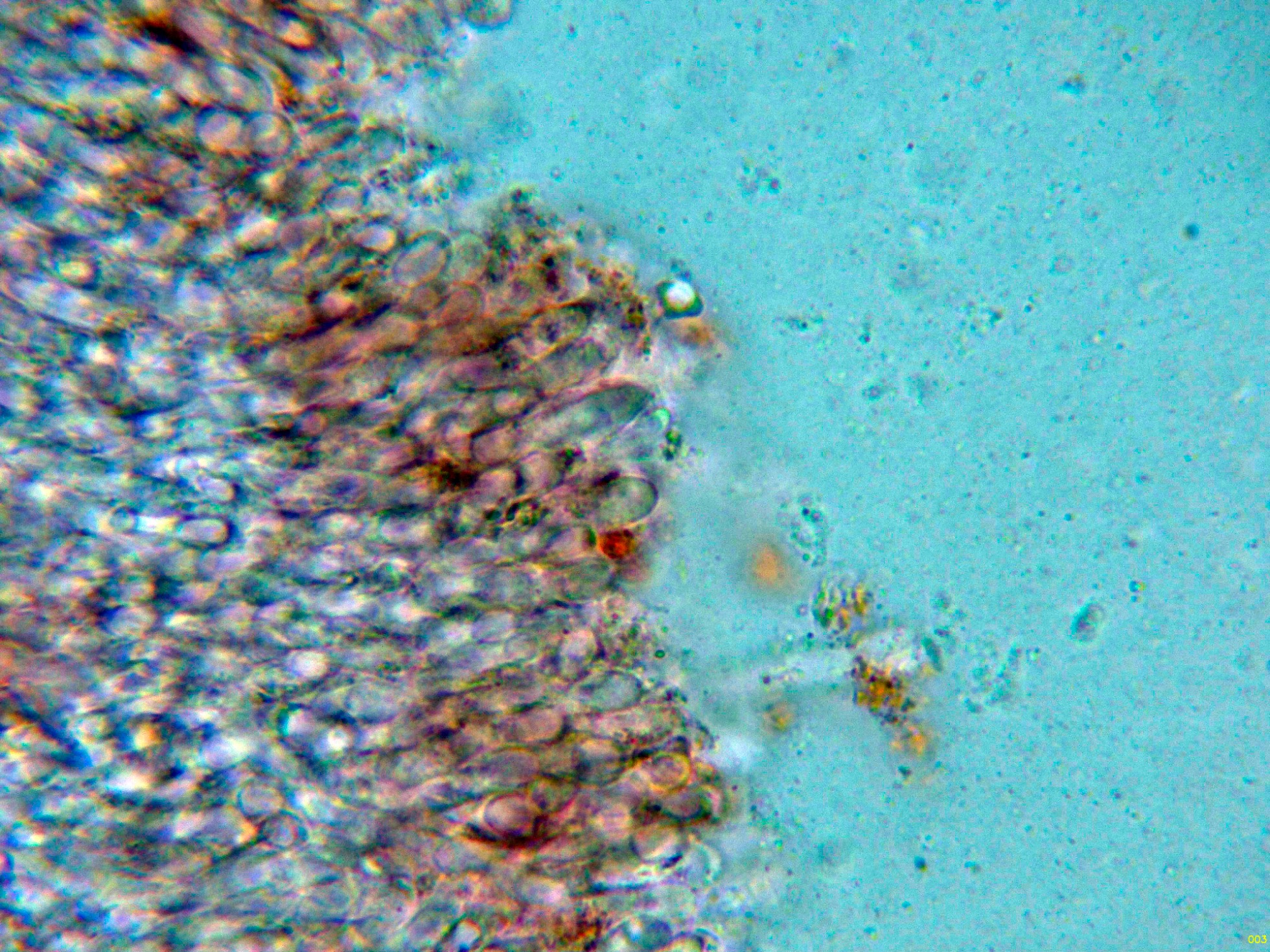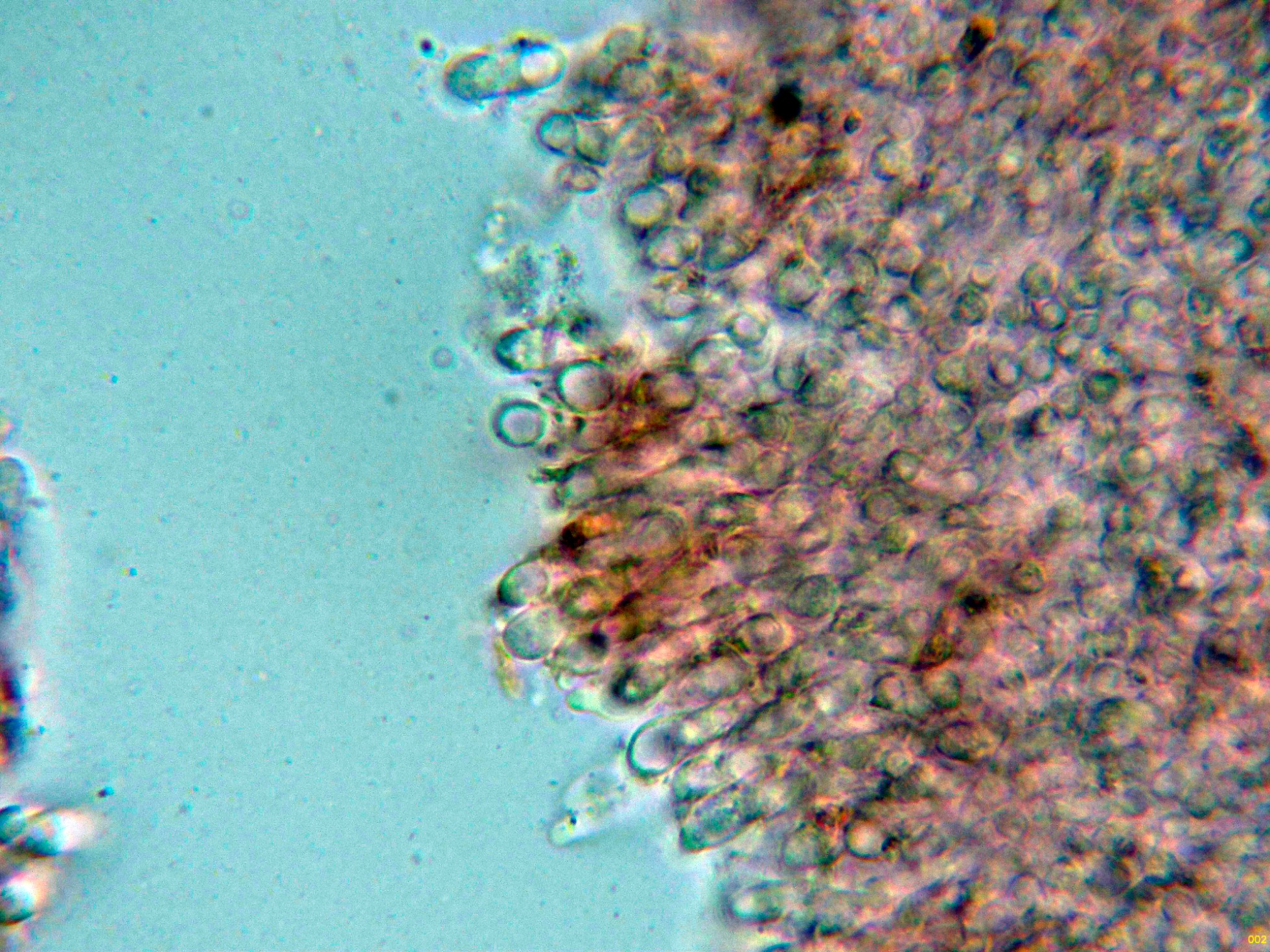 A pesar de que parecía que estaban en perfectas condiciones, no pude obtener esporas, dejo una imagen de las pocas esporas observadas en mi estudio anterior realizado a la especie.