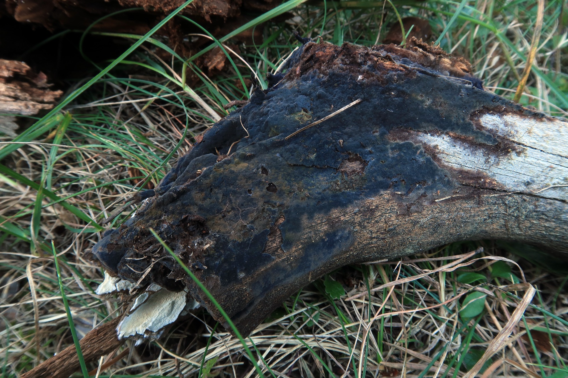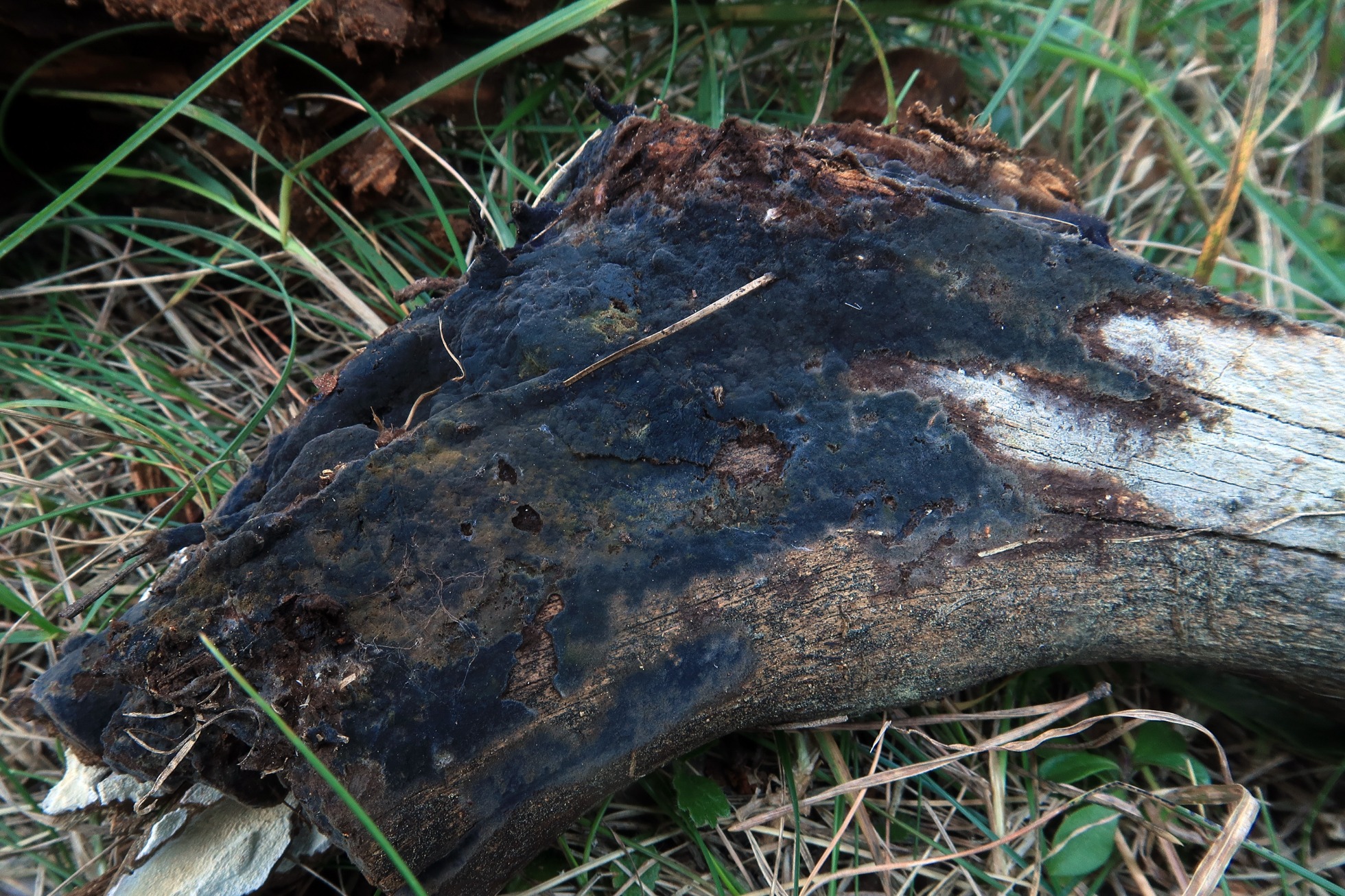 Un Corticial azulado parecido a la Terana coerulea, del pasado 15 de septiembre, brotando sobre la superficie descortezada de un tronco tumbado del suelo, de muy probablemente Pinus sylvestris.