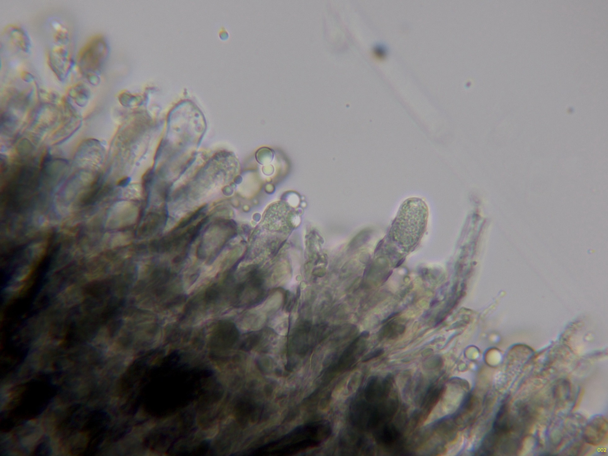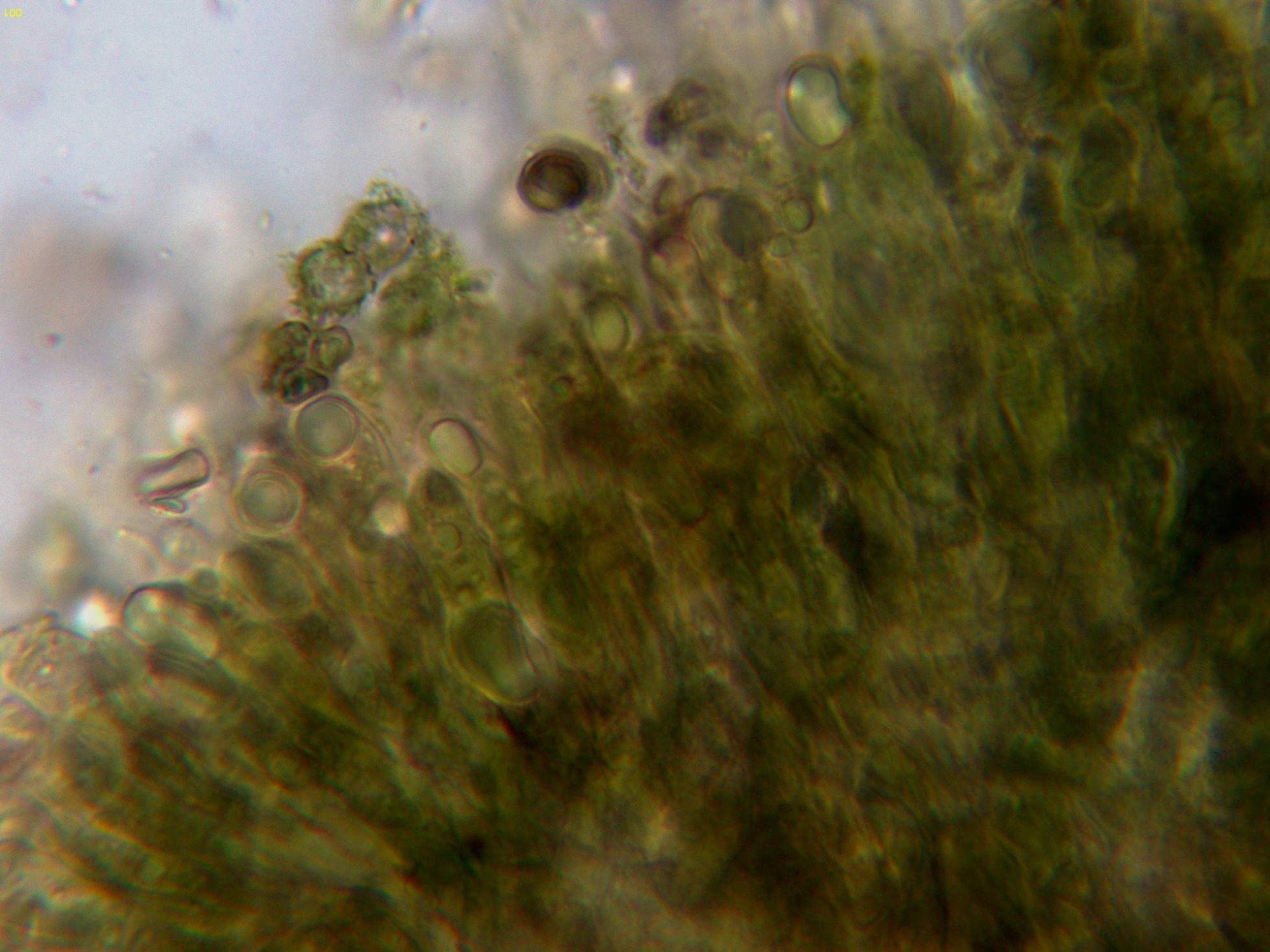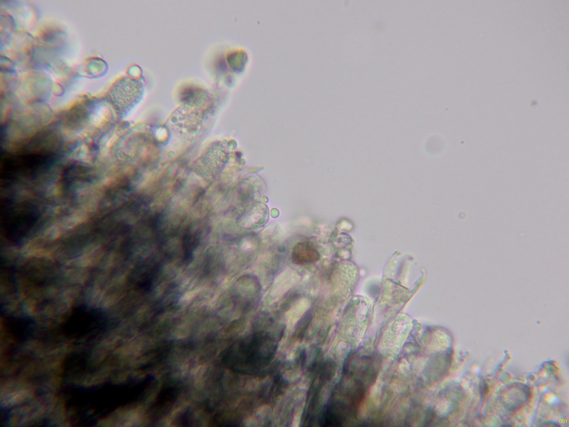 Loa basidios en KOH, en contacto con el aire adquieren tonos verdosos: