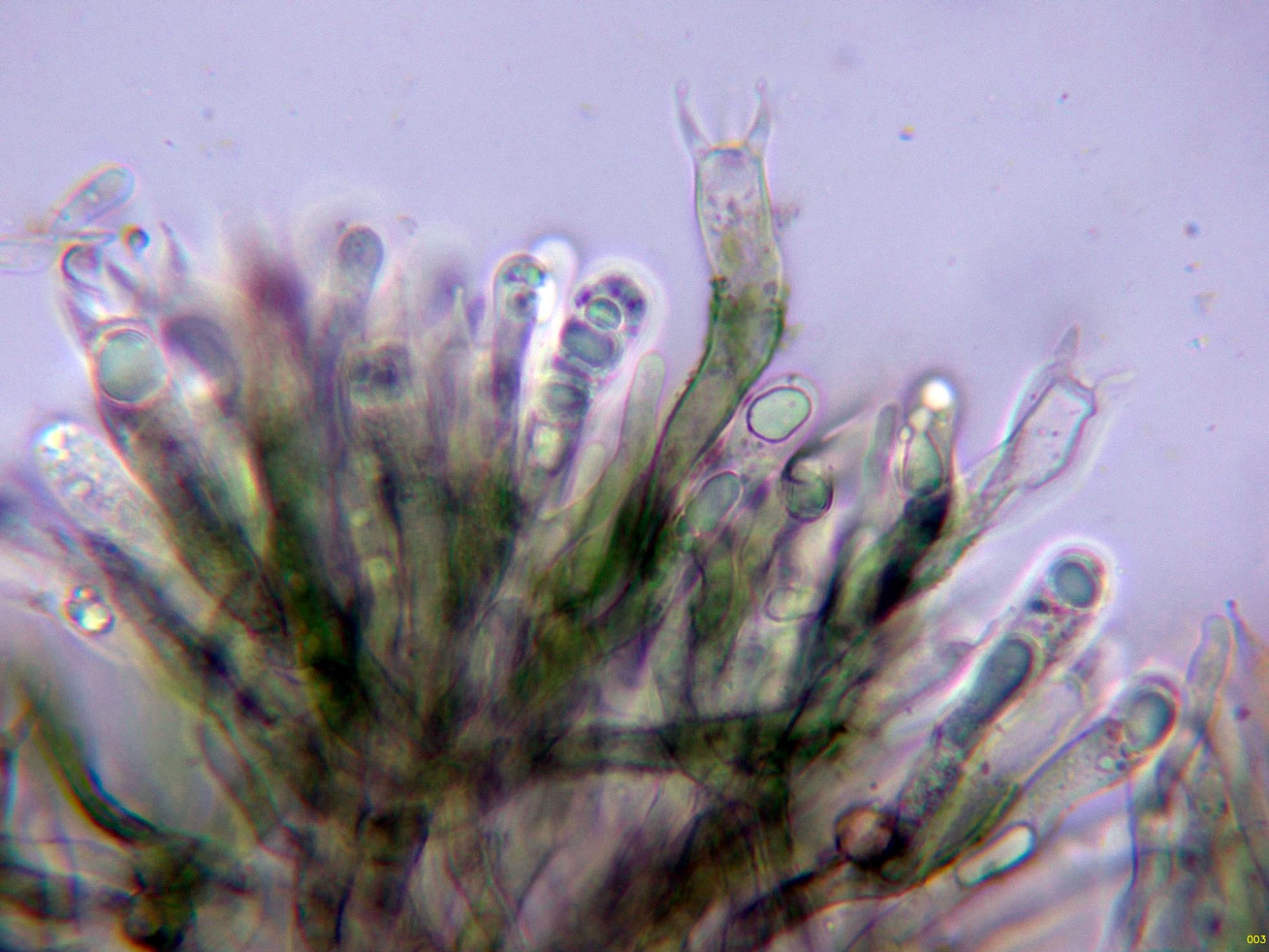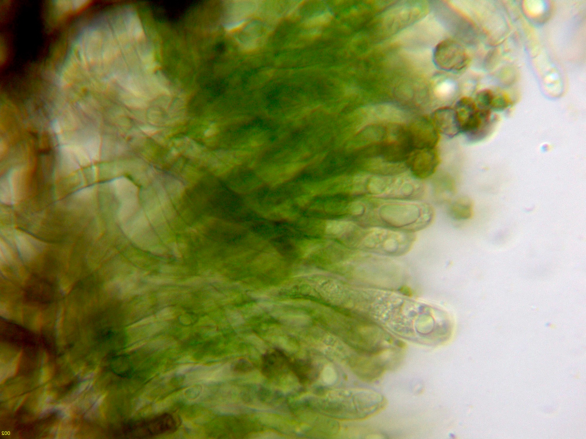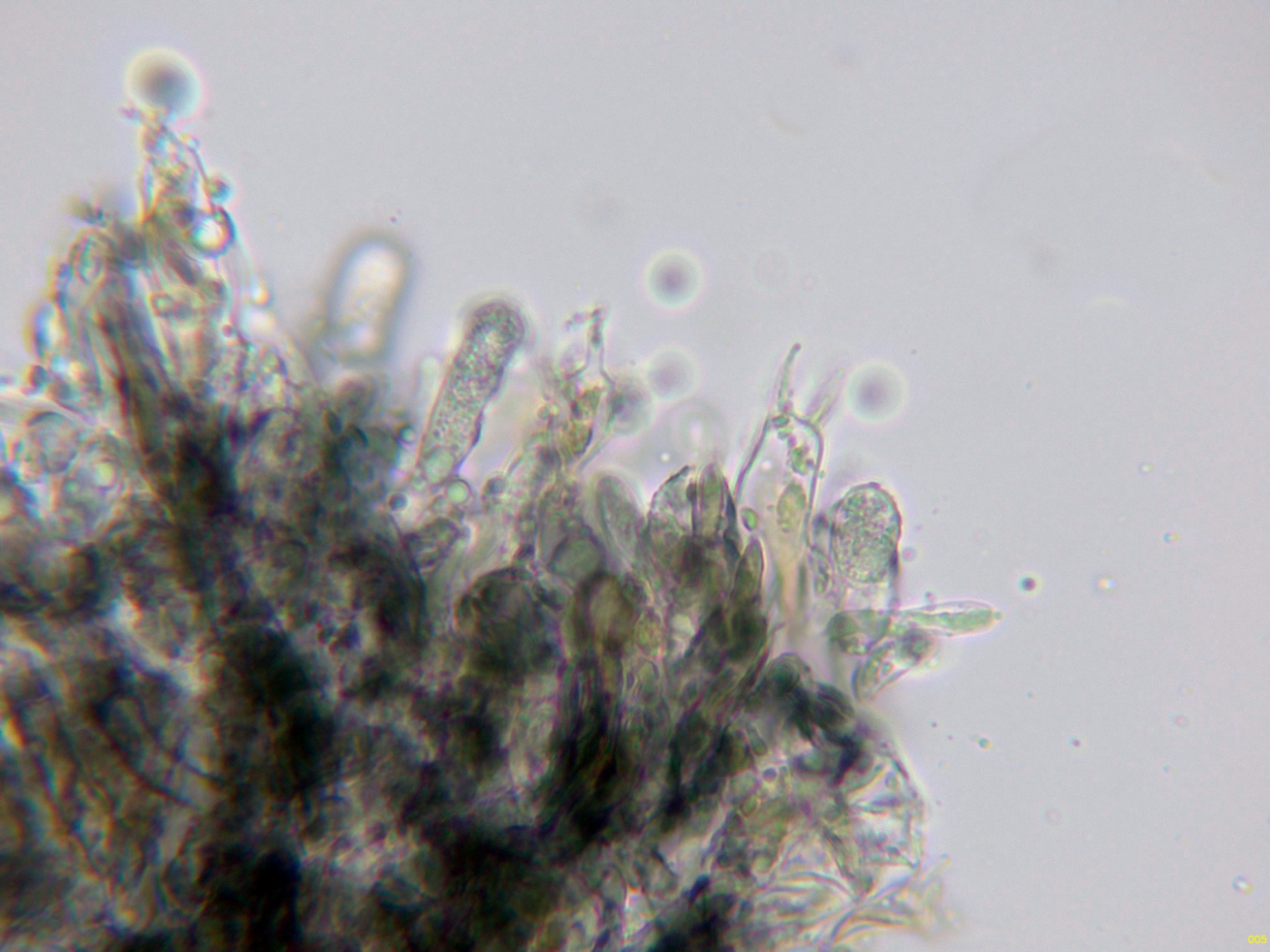 Loa basidios en KOH, en contacto con el aire adquieren tonos verdosos: