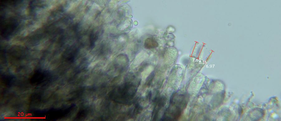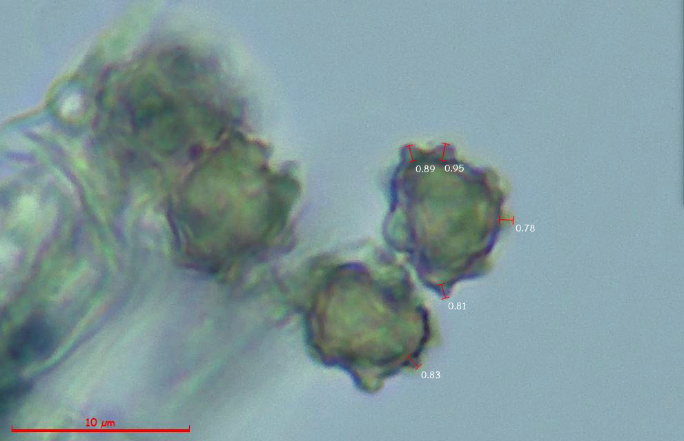 Observaciones: Determinación hecha siguiendo las Claves del documento de MycoKeys 50: 1–77 (2019) con el título de "Solving the taxonomic identity of Pseudotomentella tristis s.l. (Thelephorales, Basidiomycota) – a multigene phylogeny and taxonomic review, integrating ecological and geographical data", que atribuyen a la Pseudotomentella rotundispora unas medidas en anchura para sus hifas subiculares de (2.7–) 3.0–4.6 (–6.3) μm., unas medidas para sus basidios de 40–66 (–69) × 8.2–10.6 (–11.1) μm; con esterigmas de una longitud de (6.6–) 7.4–11.0 (–11.5) μm., unas esporas con unas medidas en visión frontal sin contar la ornamentación de (6.7–) 7.0–8.2 (–8.4) × 7.0–8.6 μm; y estas esporas con espinas con una longitud de 0.5–1.1 (–1.3) μm., todos los parámetros totalmente acordes con los citados en el presente estudio.
