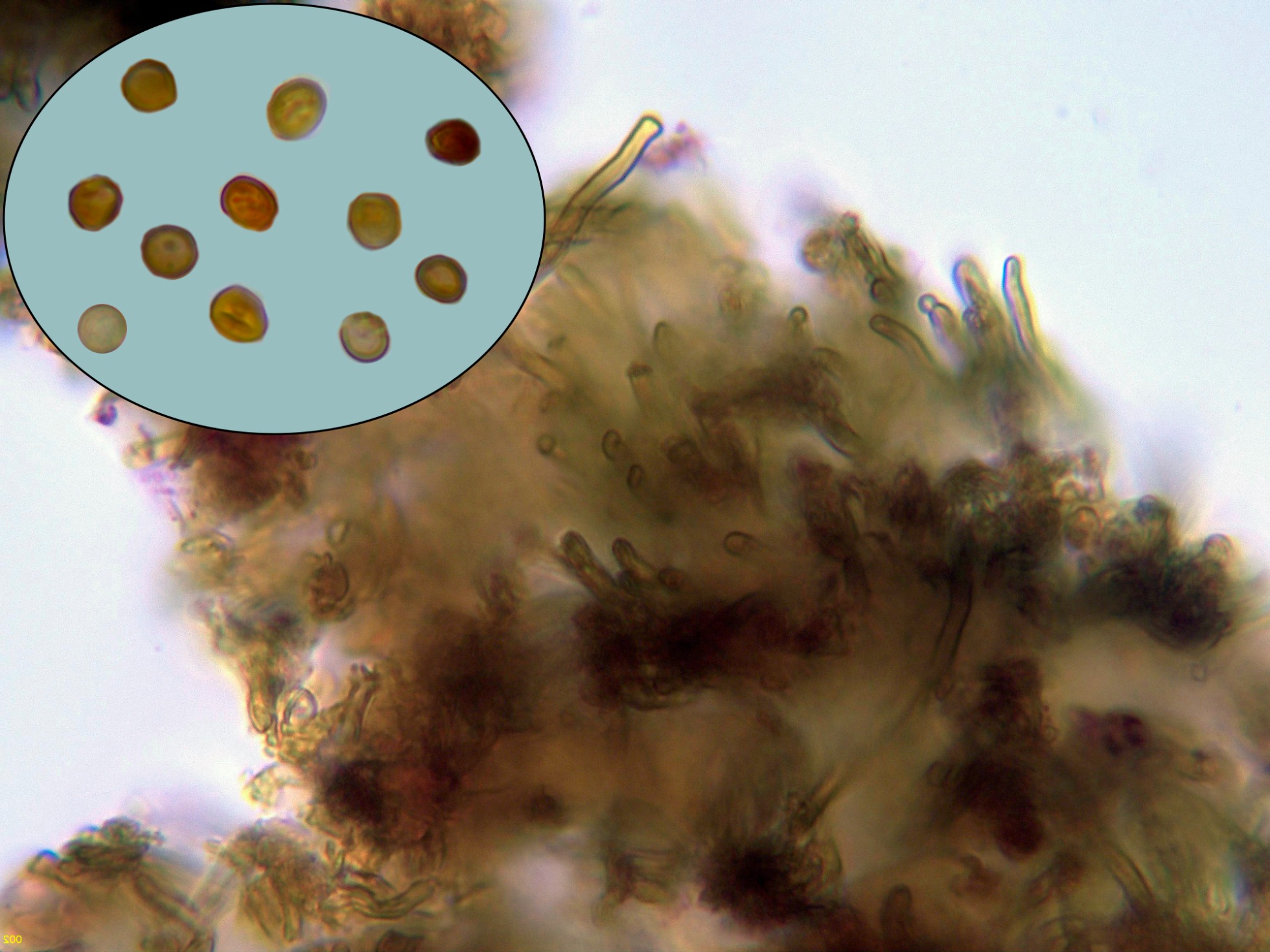 Los basidios muy hundidos en el himenio y en la miniatura una composición de las pocas esporas libres observadas: