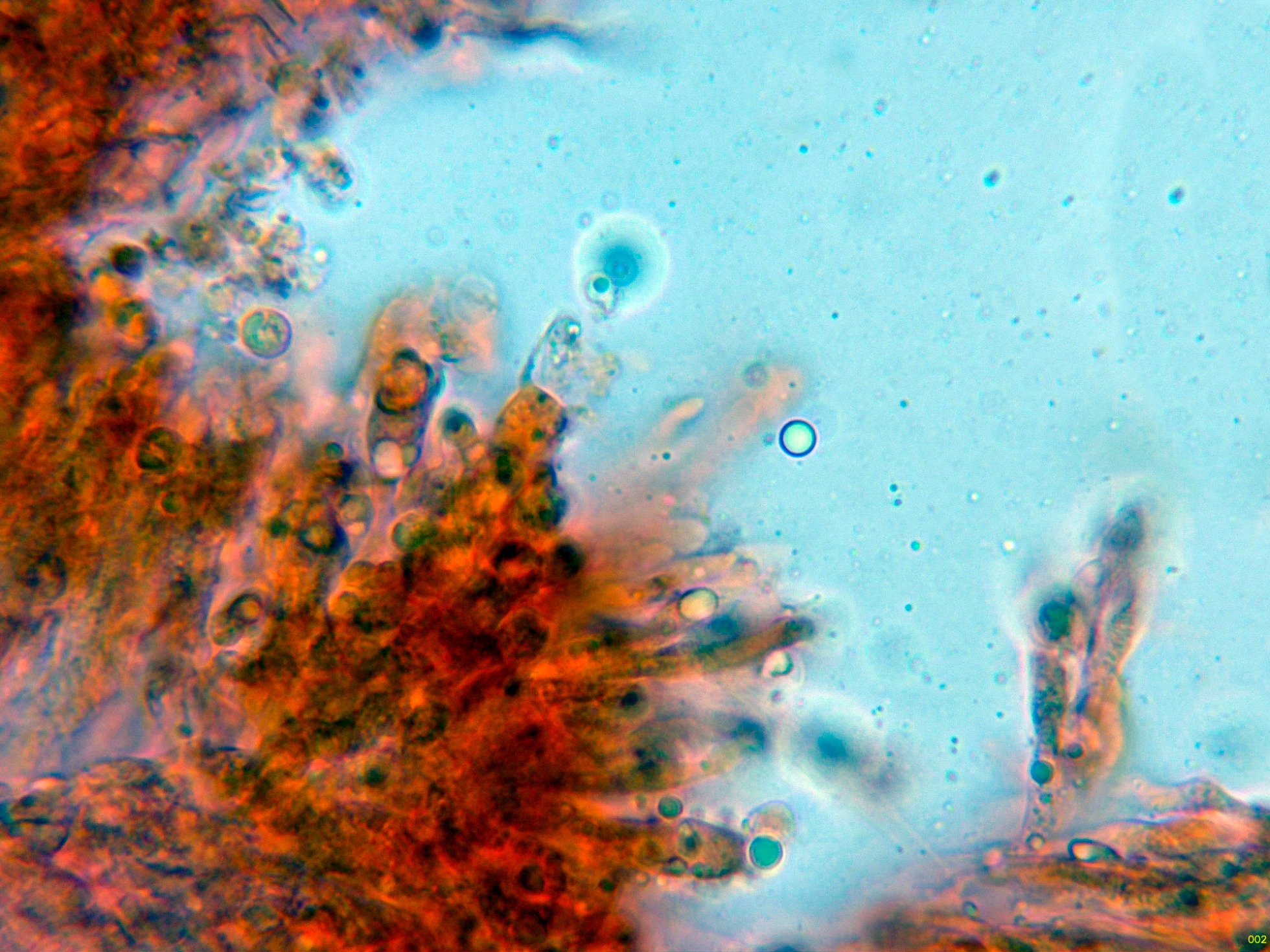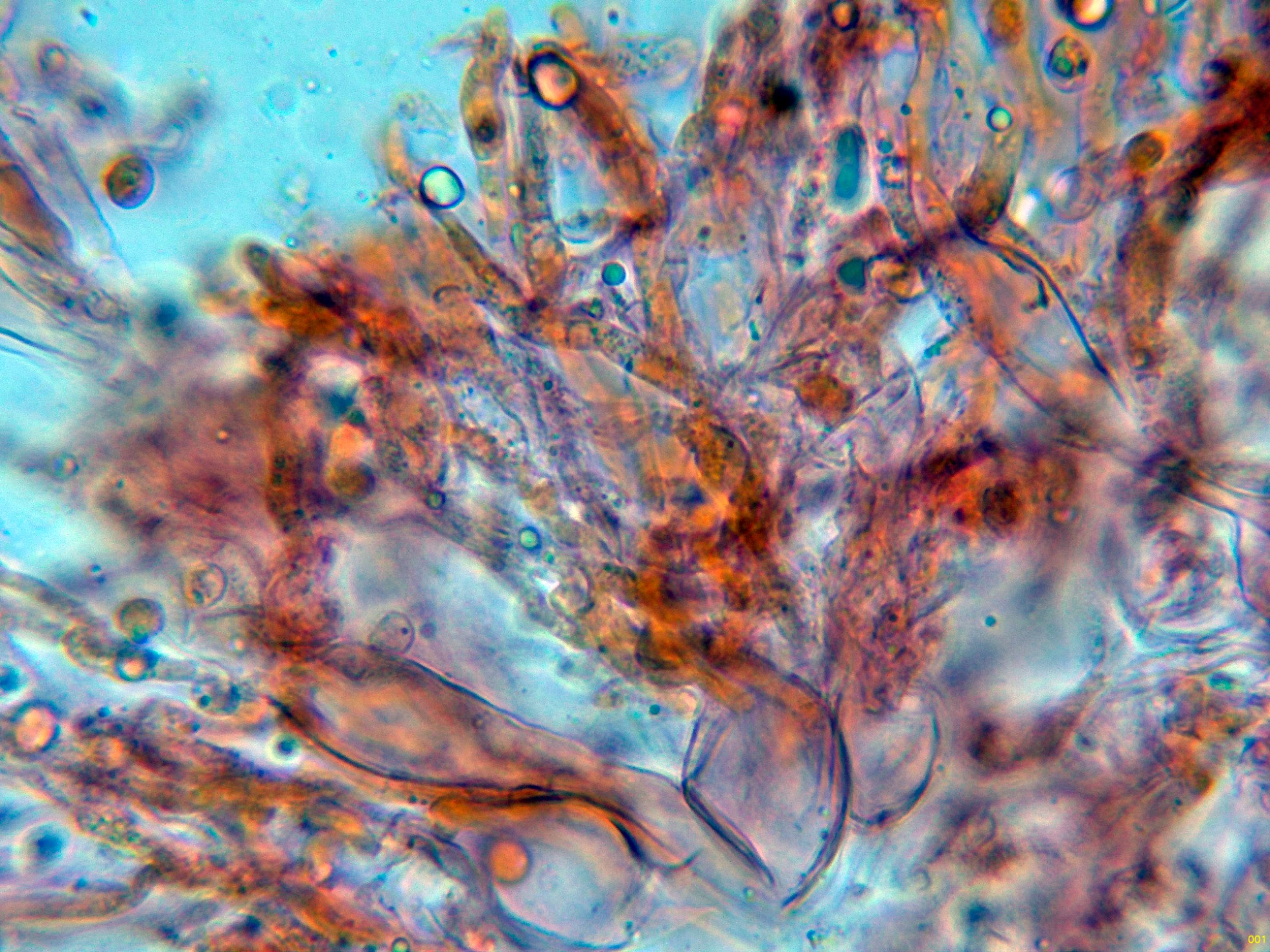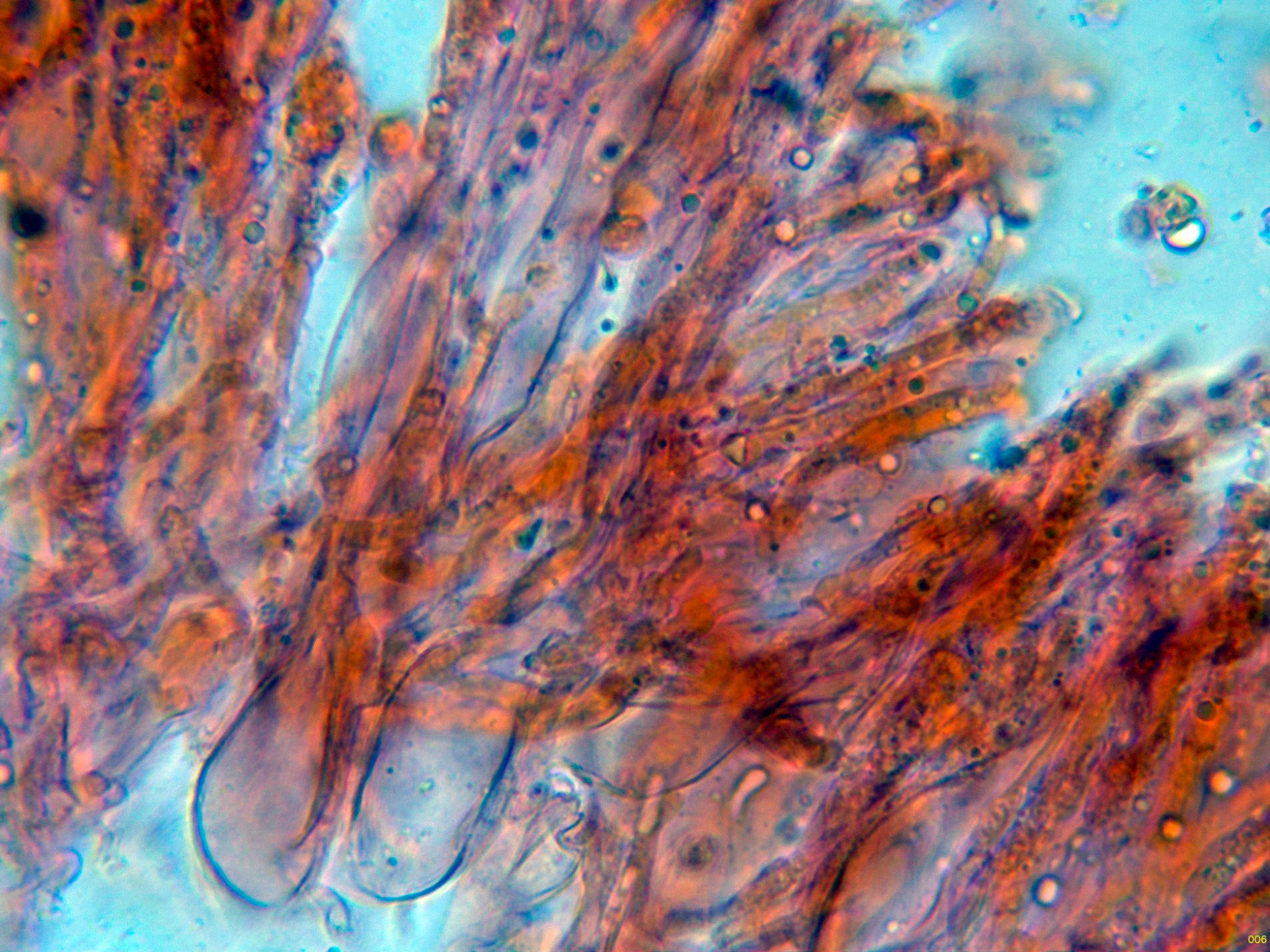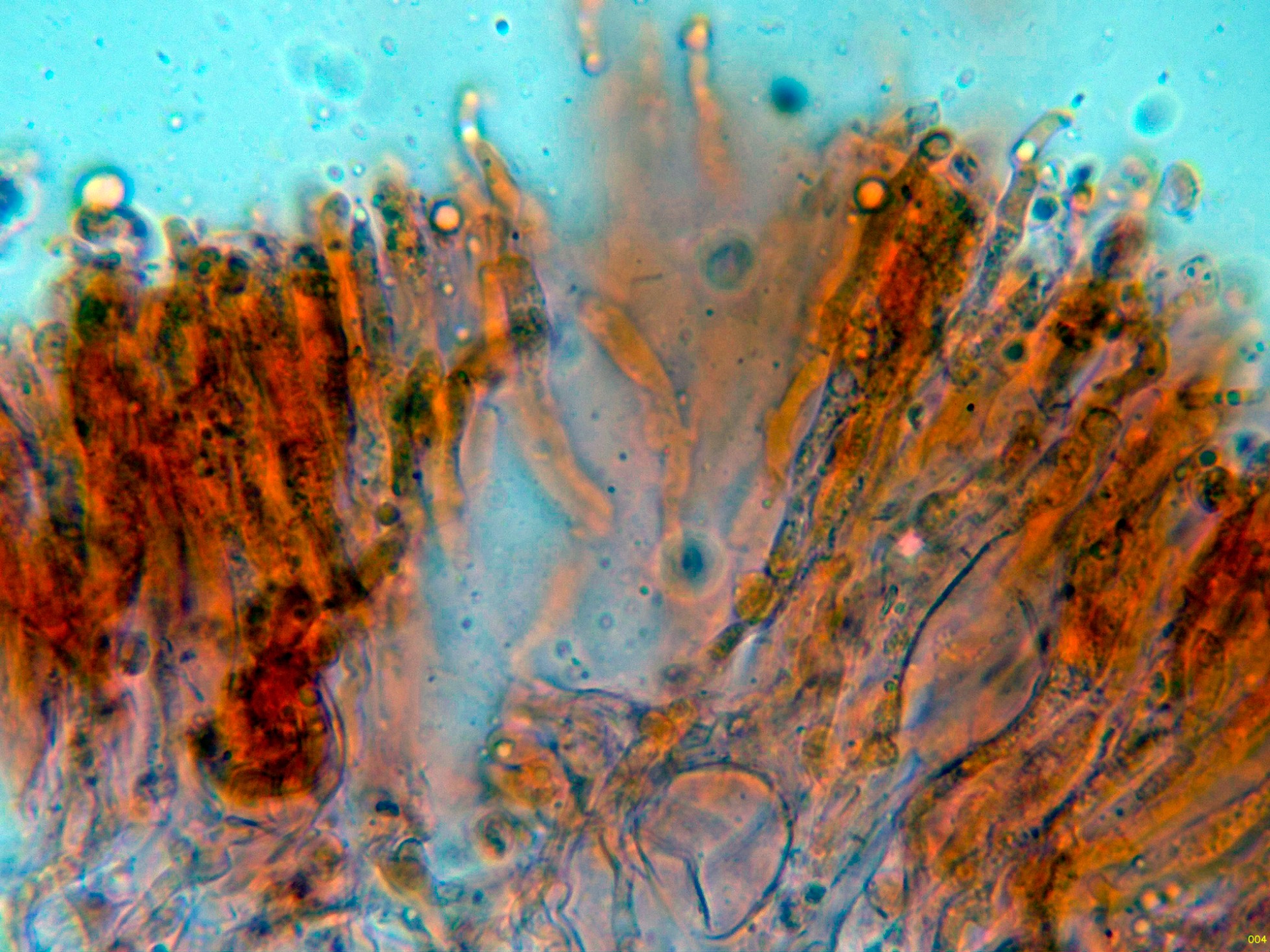 Gloeocistidios traslúcidos, fusiformes, algunos de ellos vesiculosos, muy ensanchados en la base.
