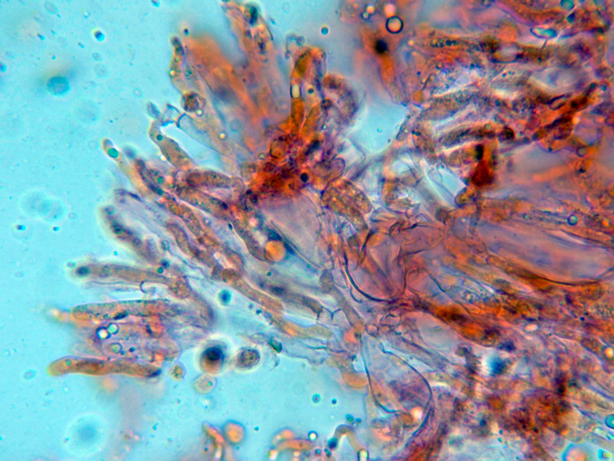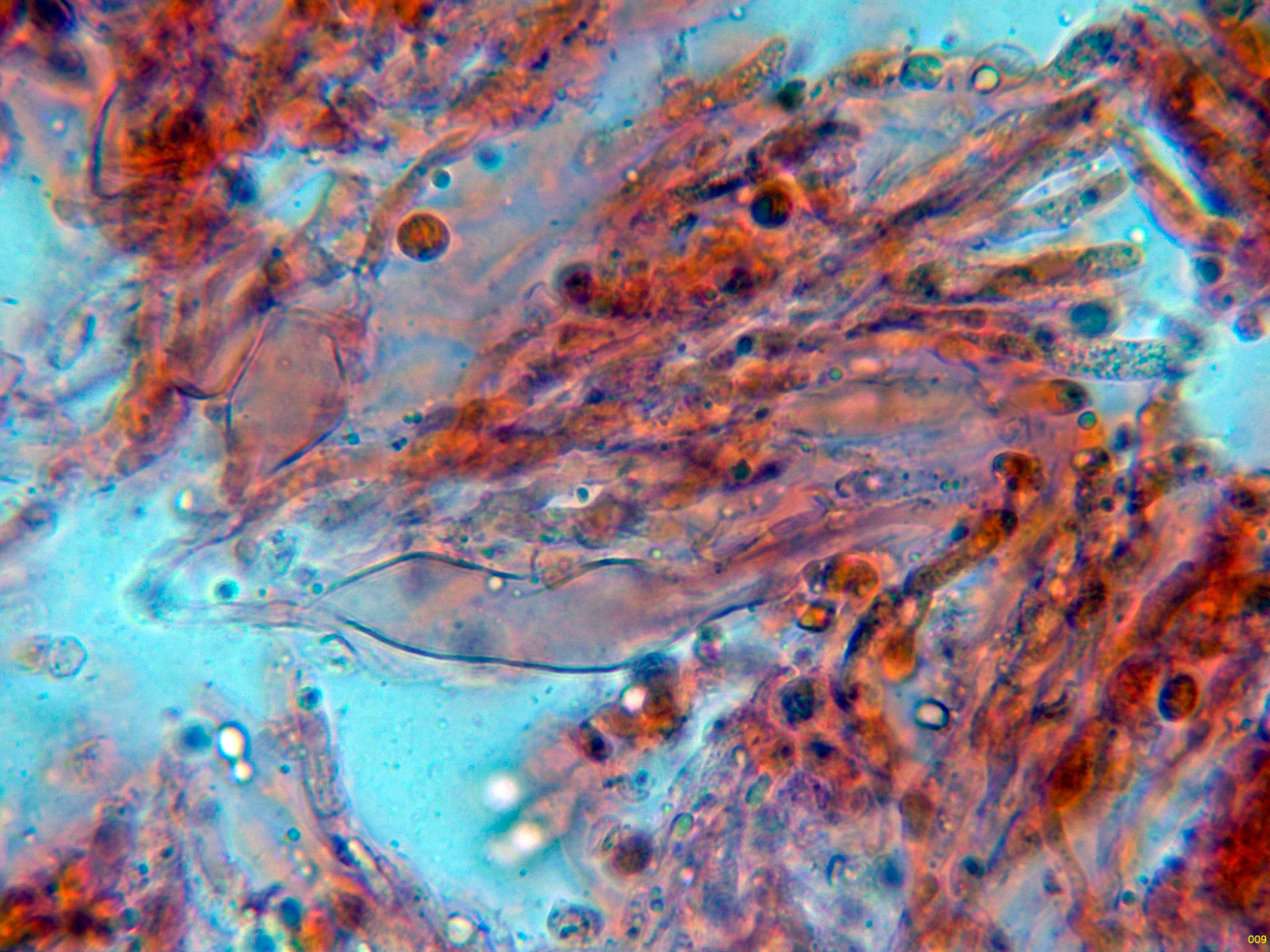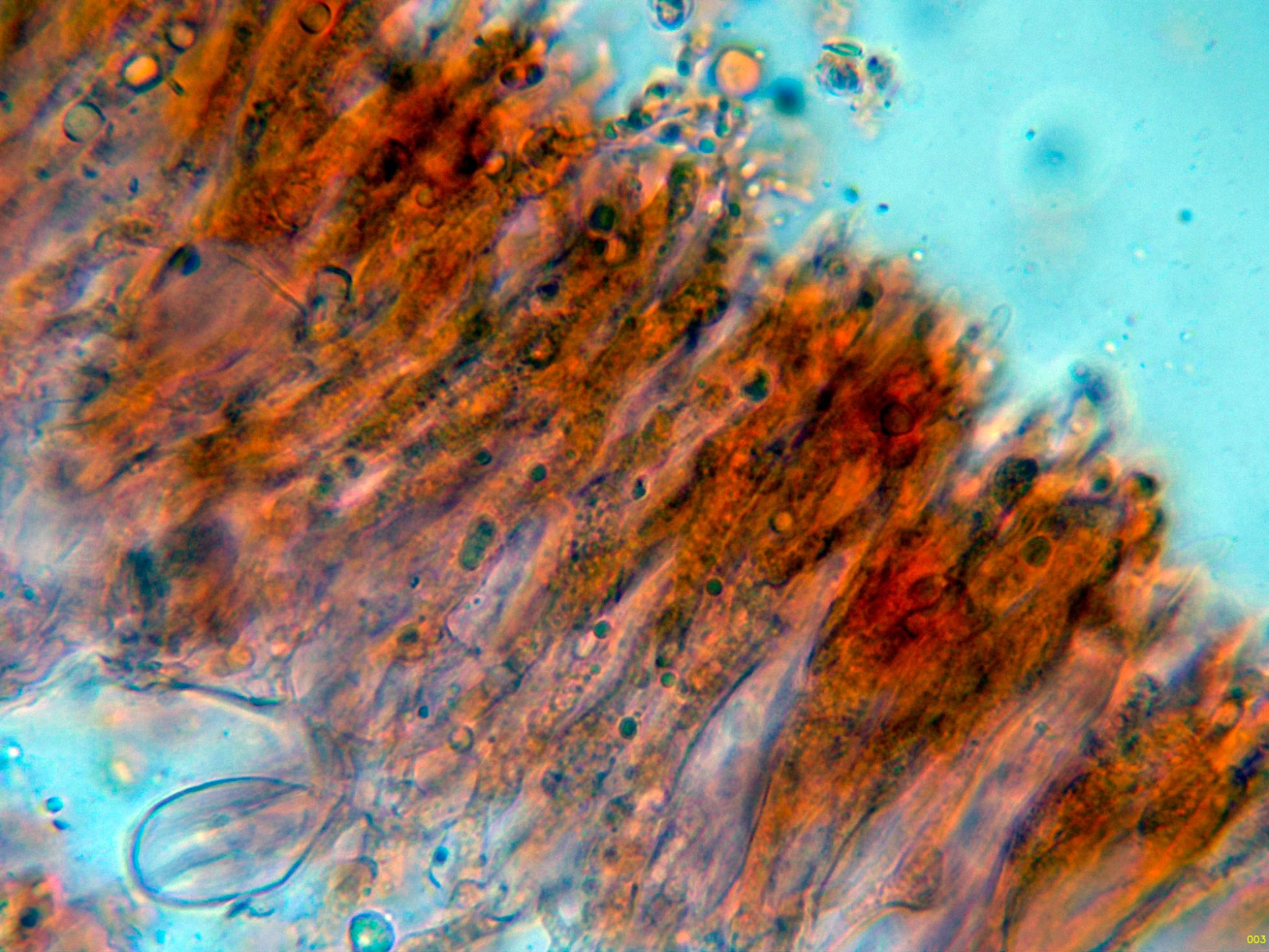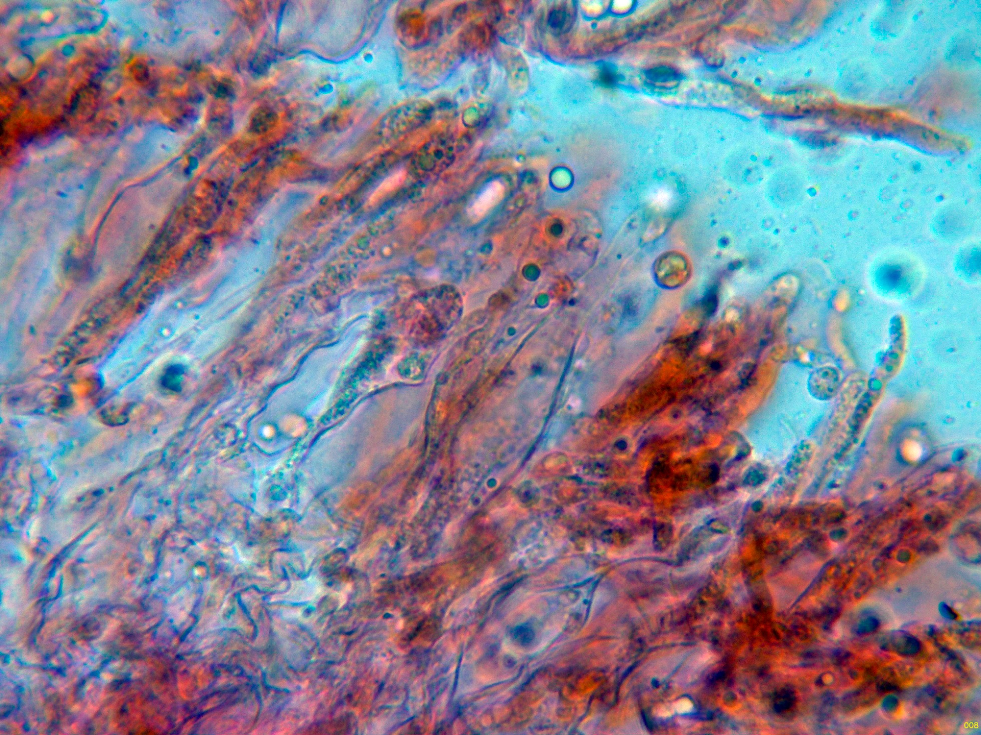 Gloeocistidios traslúcidos, fusiformes, algunos de ellos vesiculosos, muy ensanchados en la base.