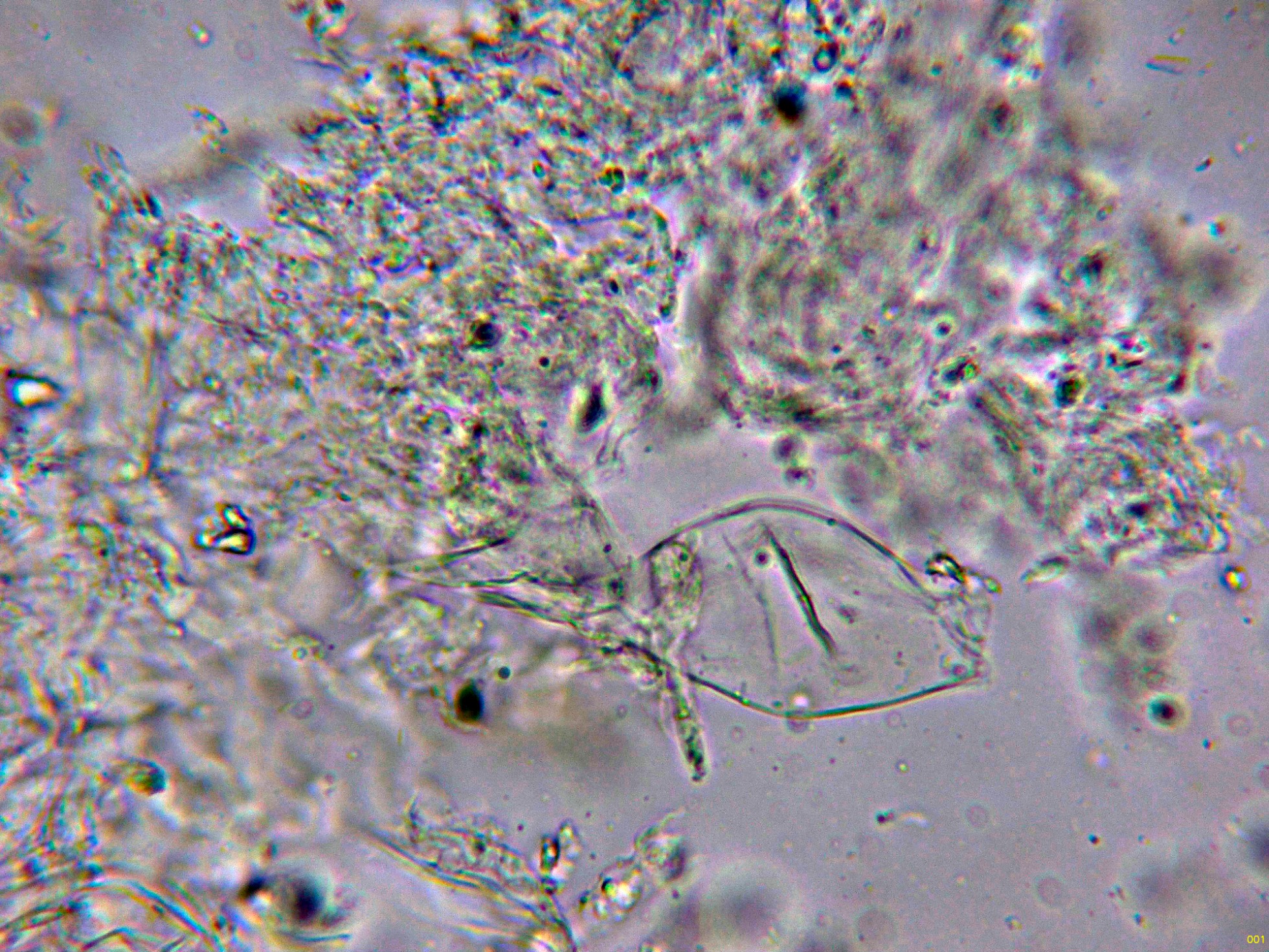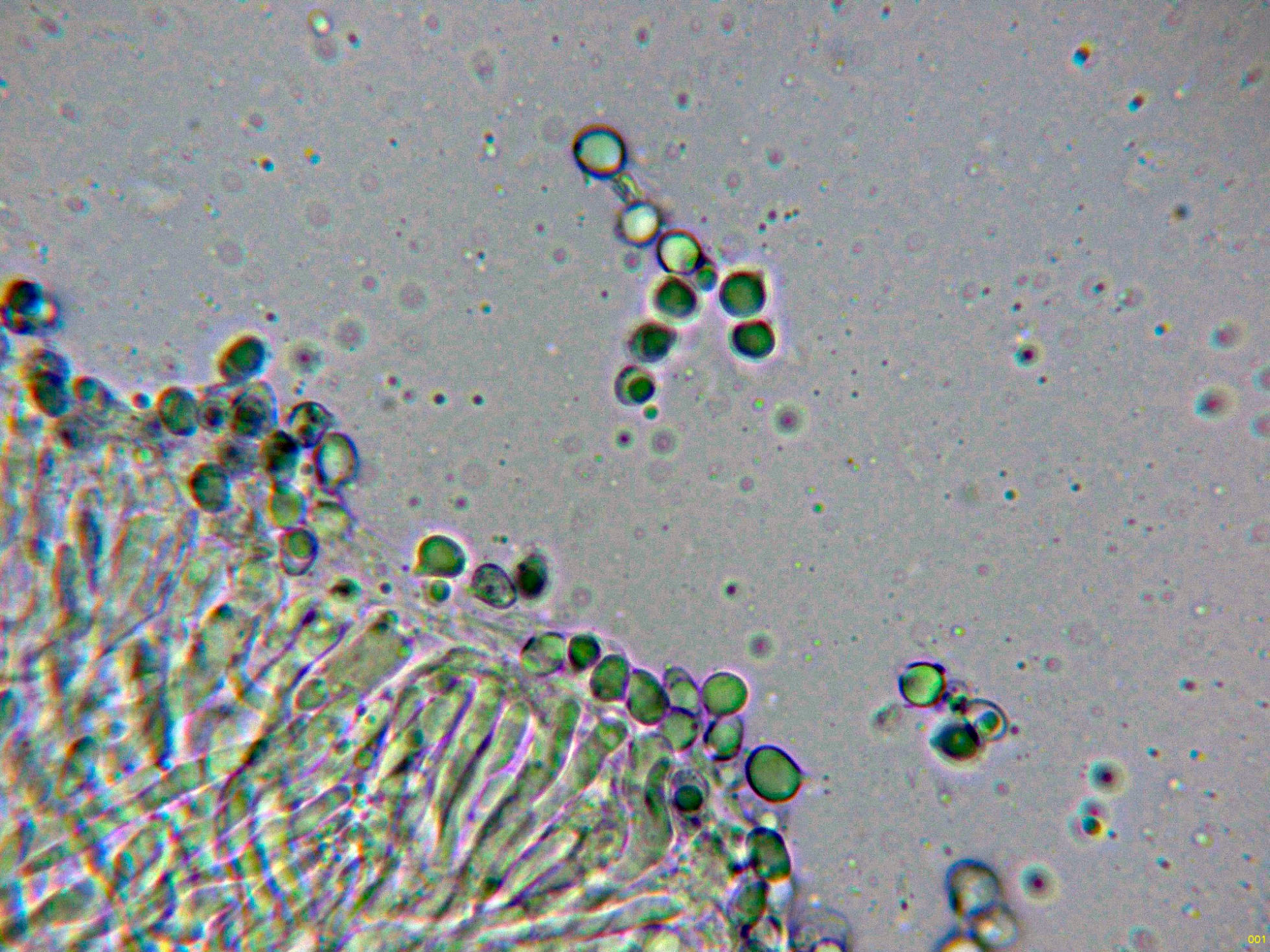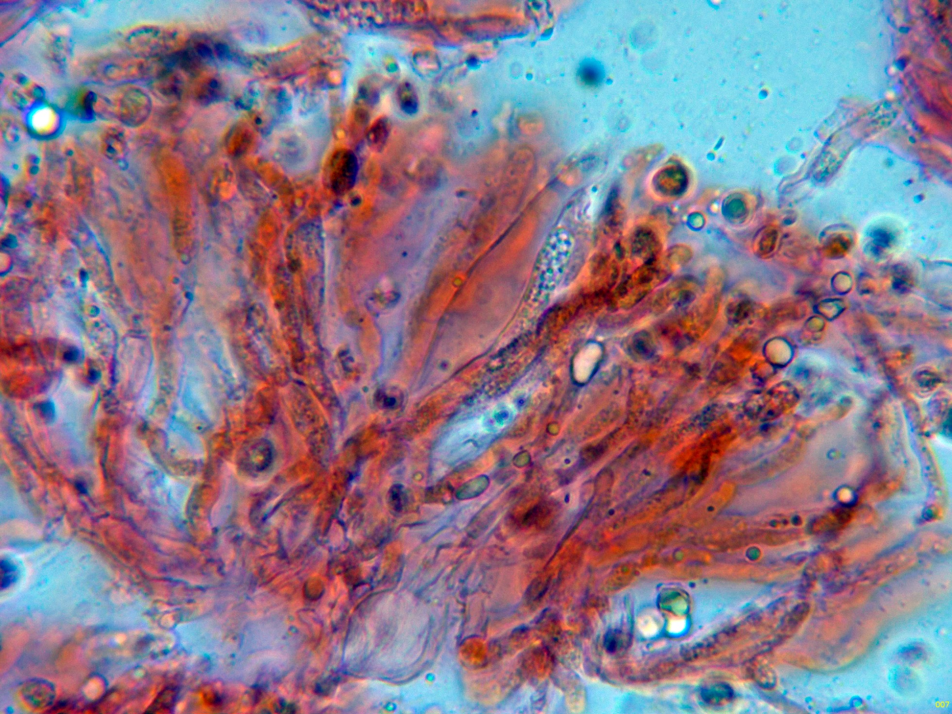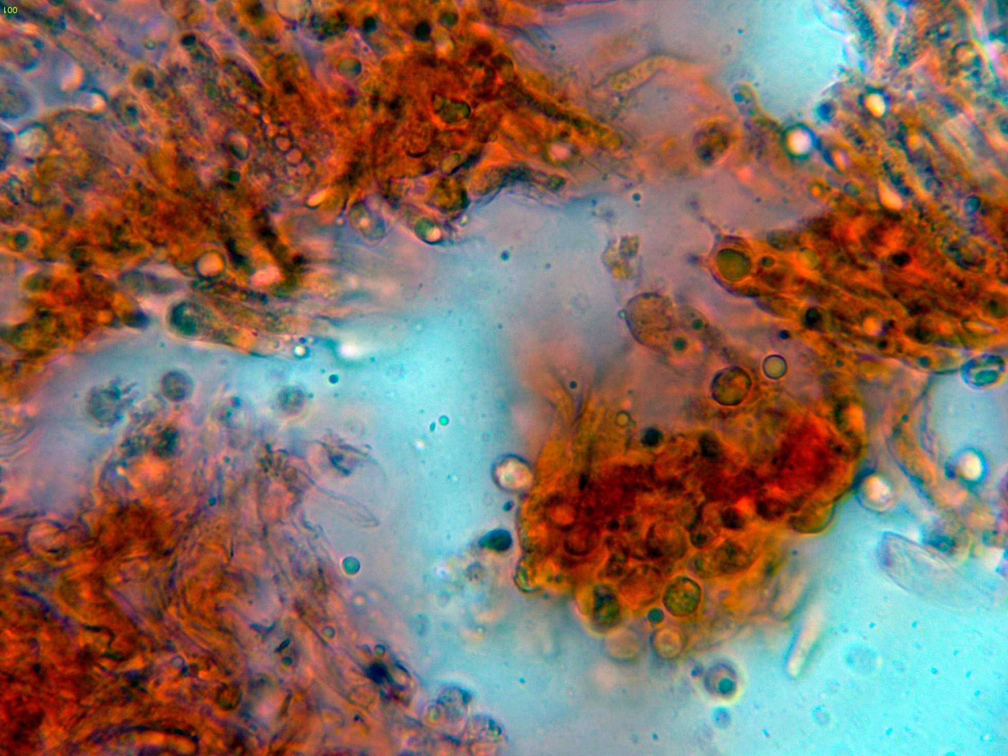 Gloeocistidios traslúcidos, fusiformes, algunos de ellos vesiculosos, muy ensanchados en la base.