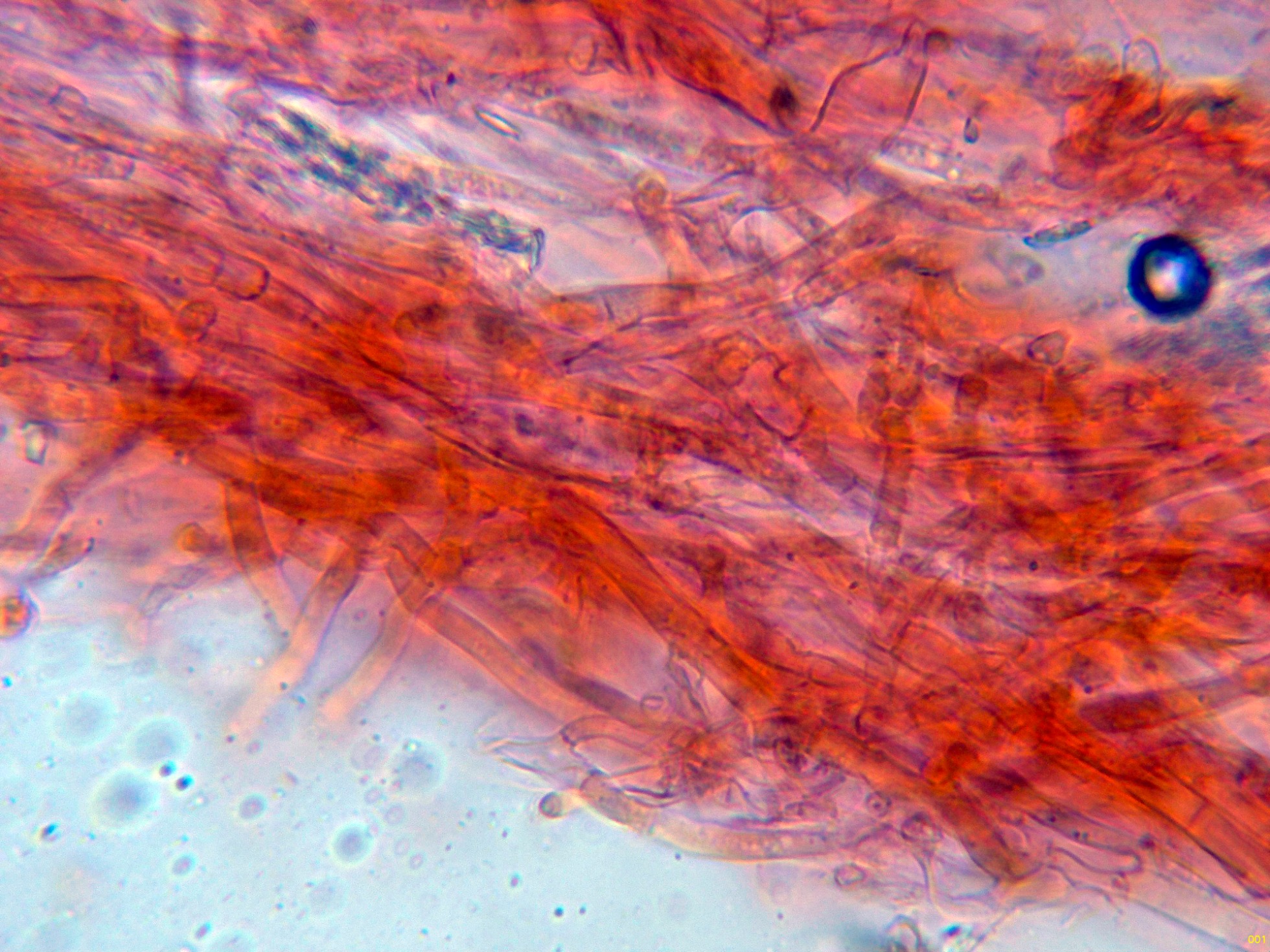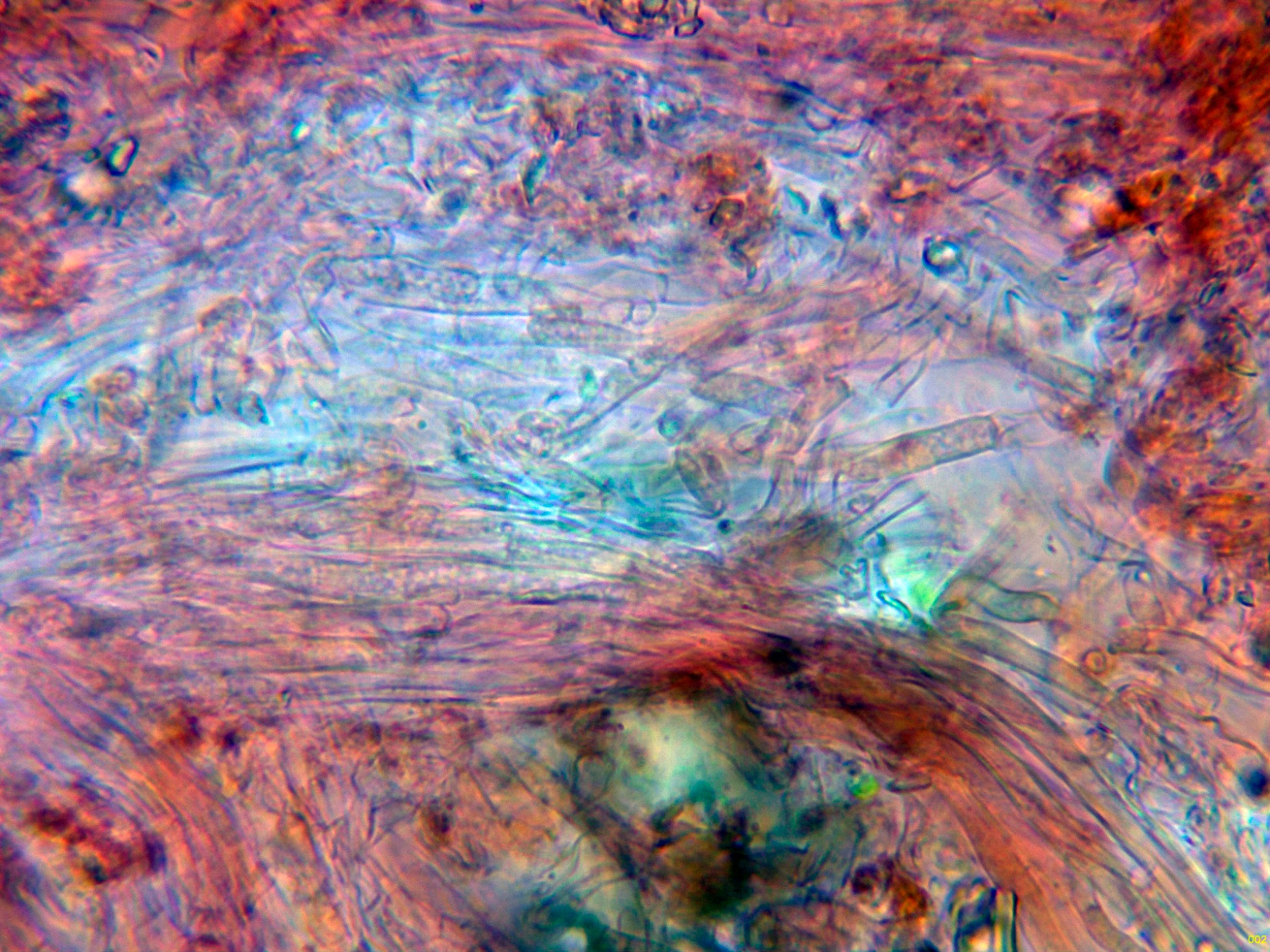 Las hifas subiculares que se corresponden a un sistema hifal monomítico con hifas estrechas, septadas y sin fíbulas.