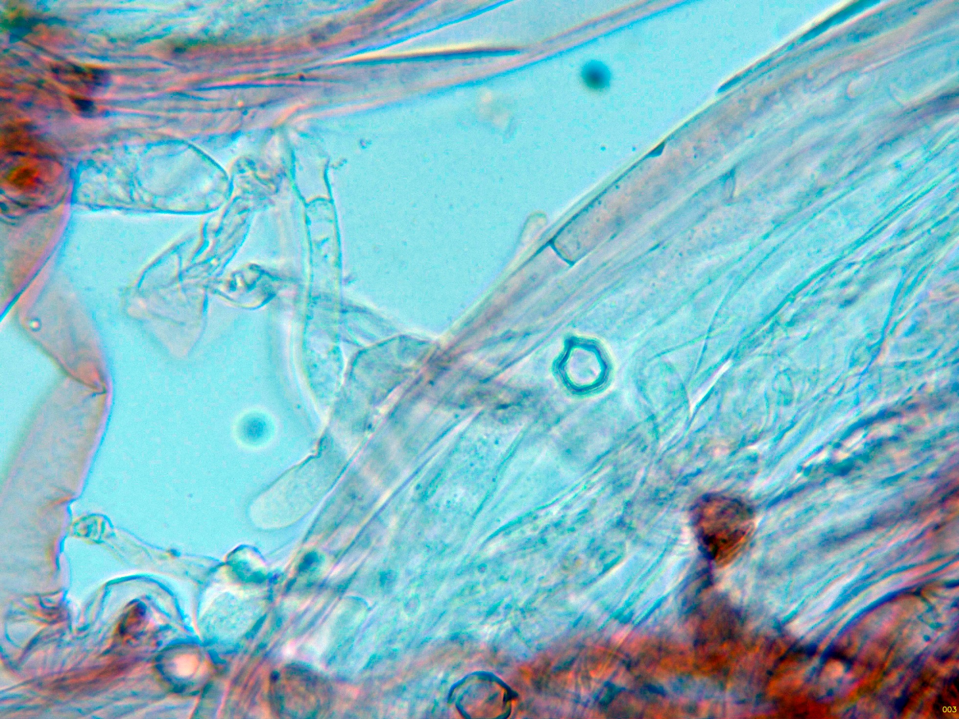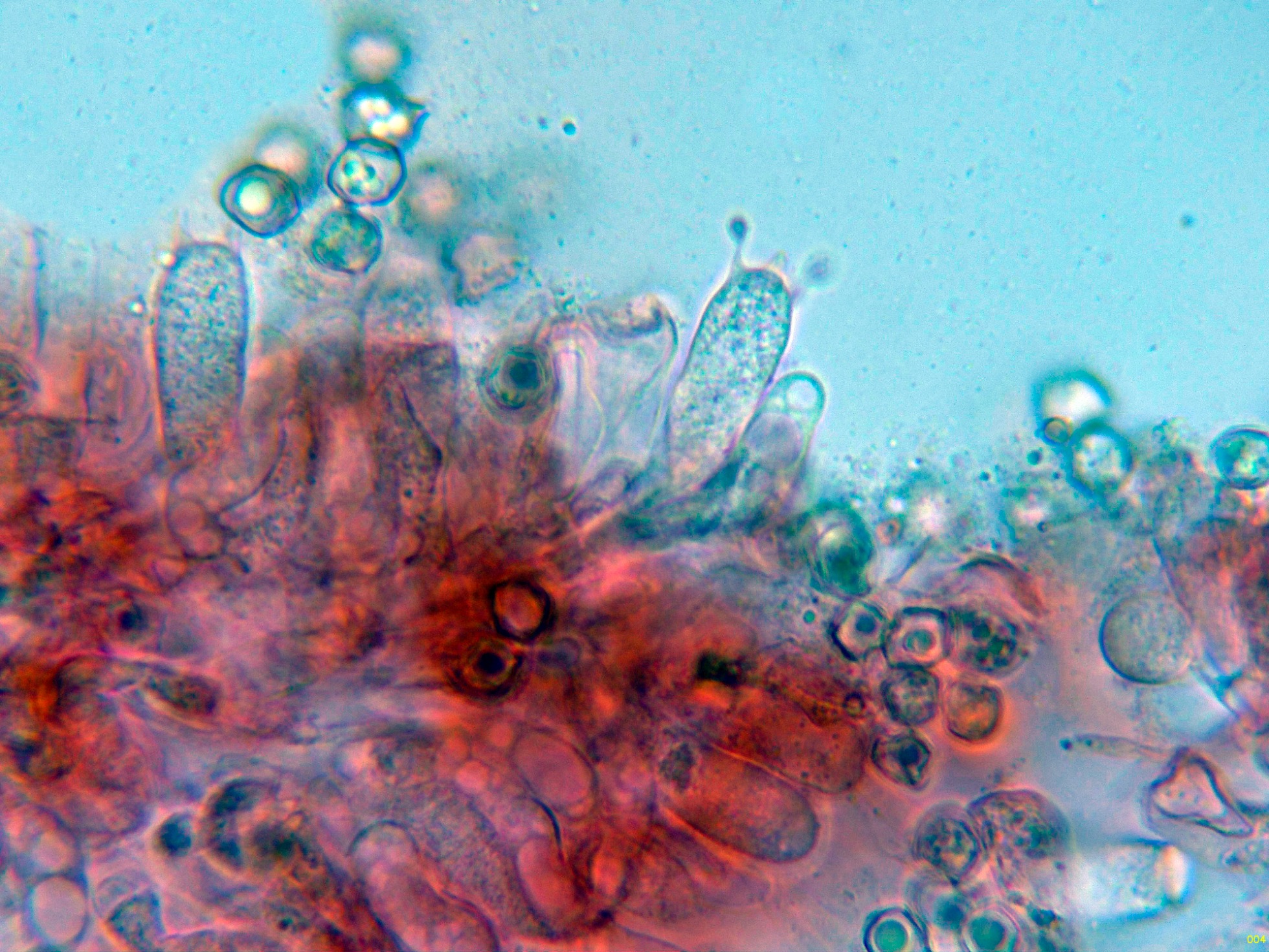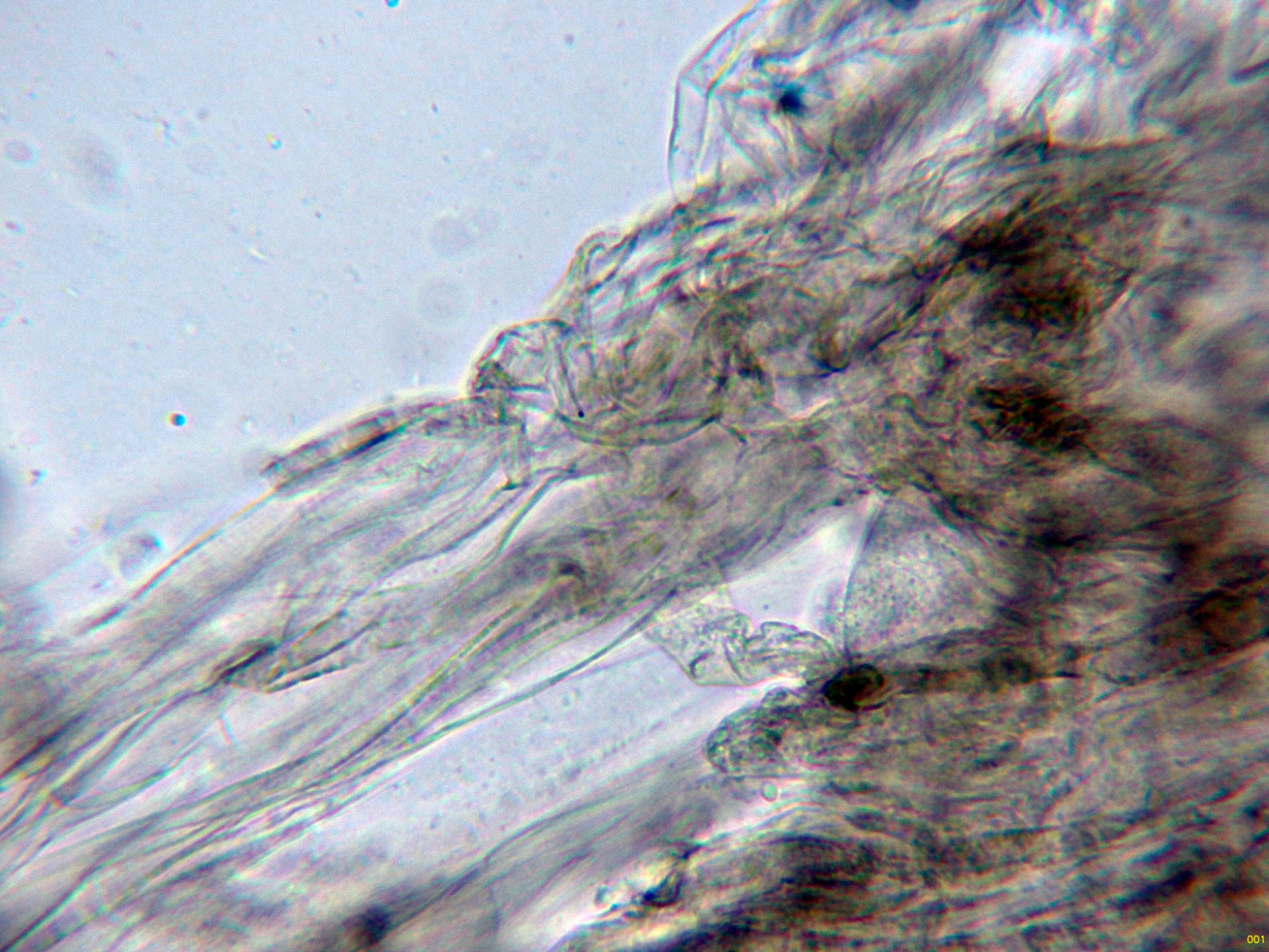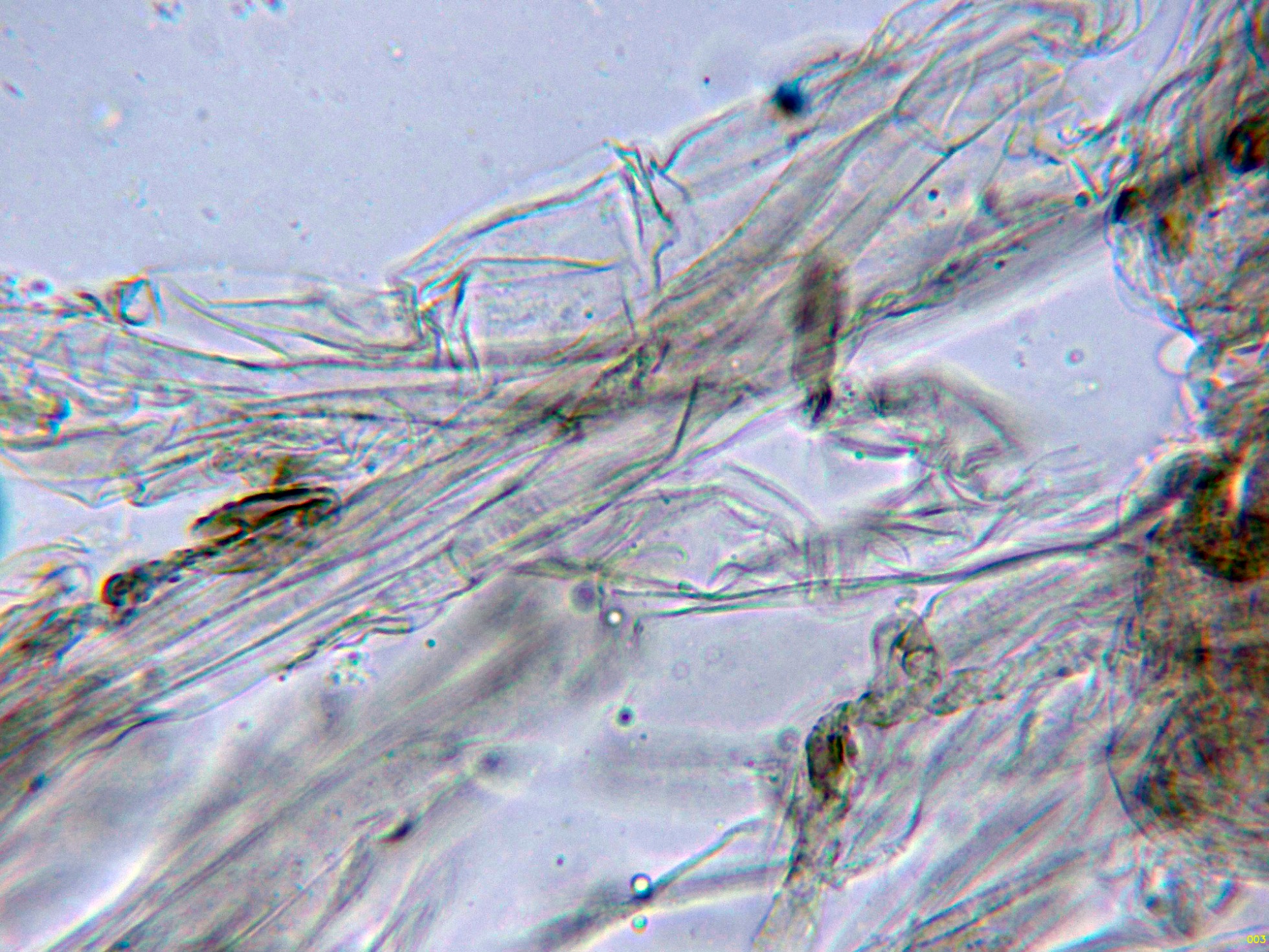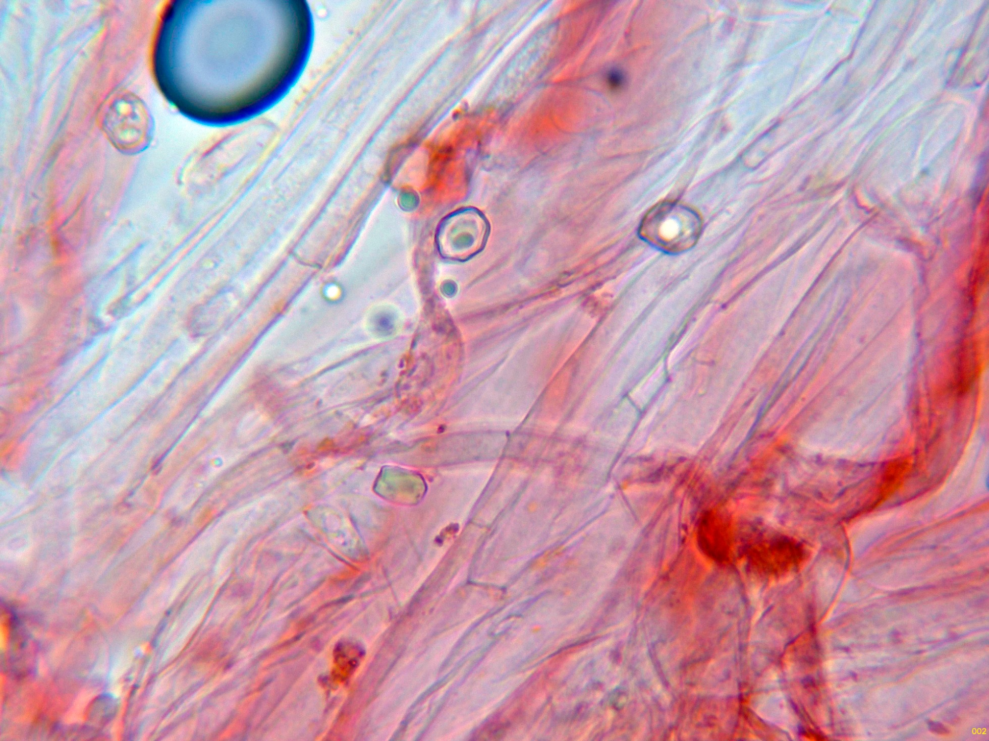 Las hifas de la estipitipellis en solución de Rojo Congo, sin ningún caulocistidio observado y sin fíbulas.
