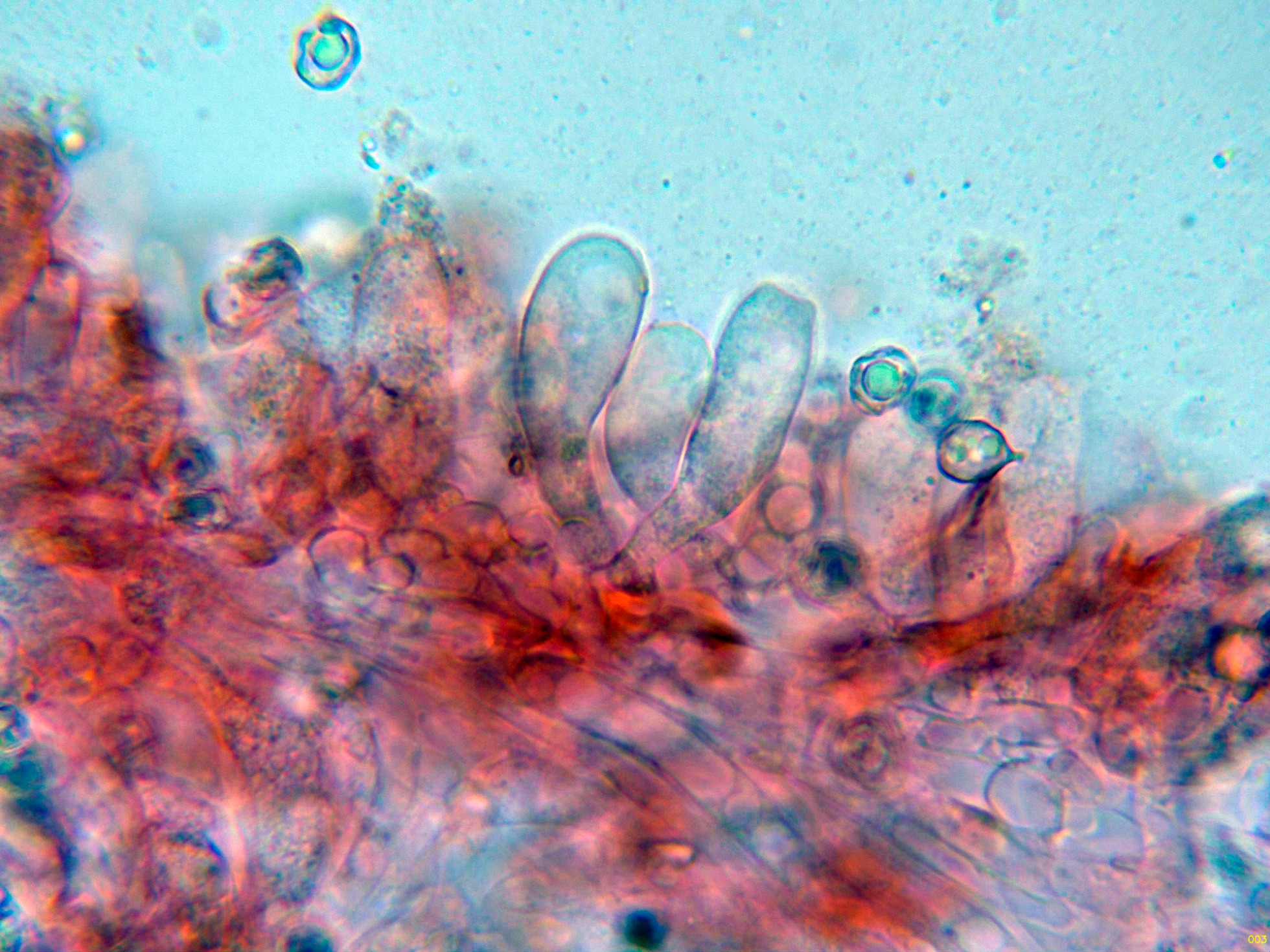 Los basidios de la cara laminar, estos basidios con unas medidas de (22.9) 24.6 - 37 (38.4) × (9.5) 9.8 - 12.1 (12.8) µm.