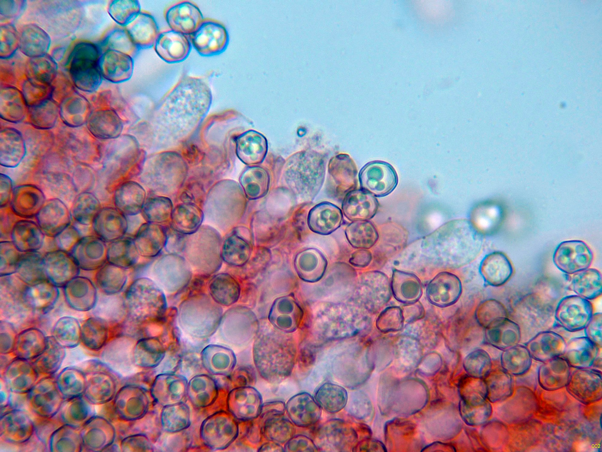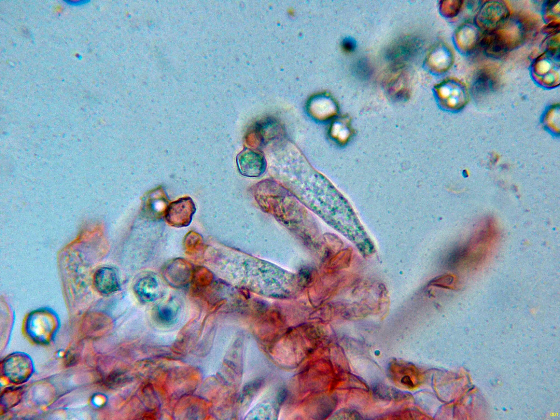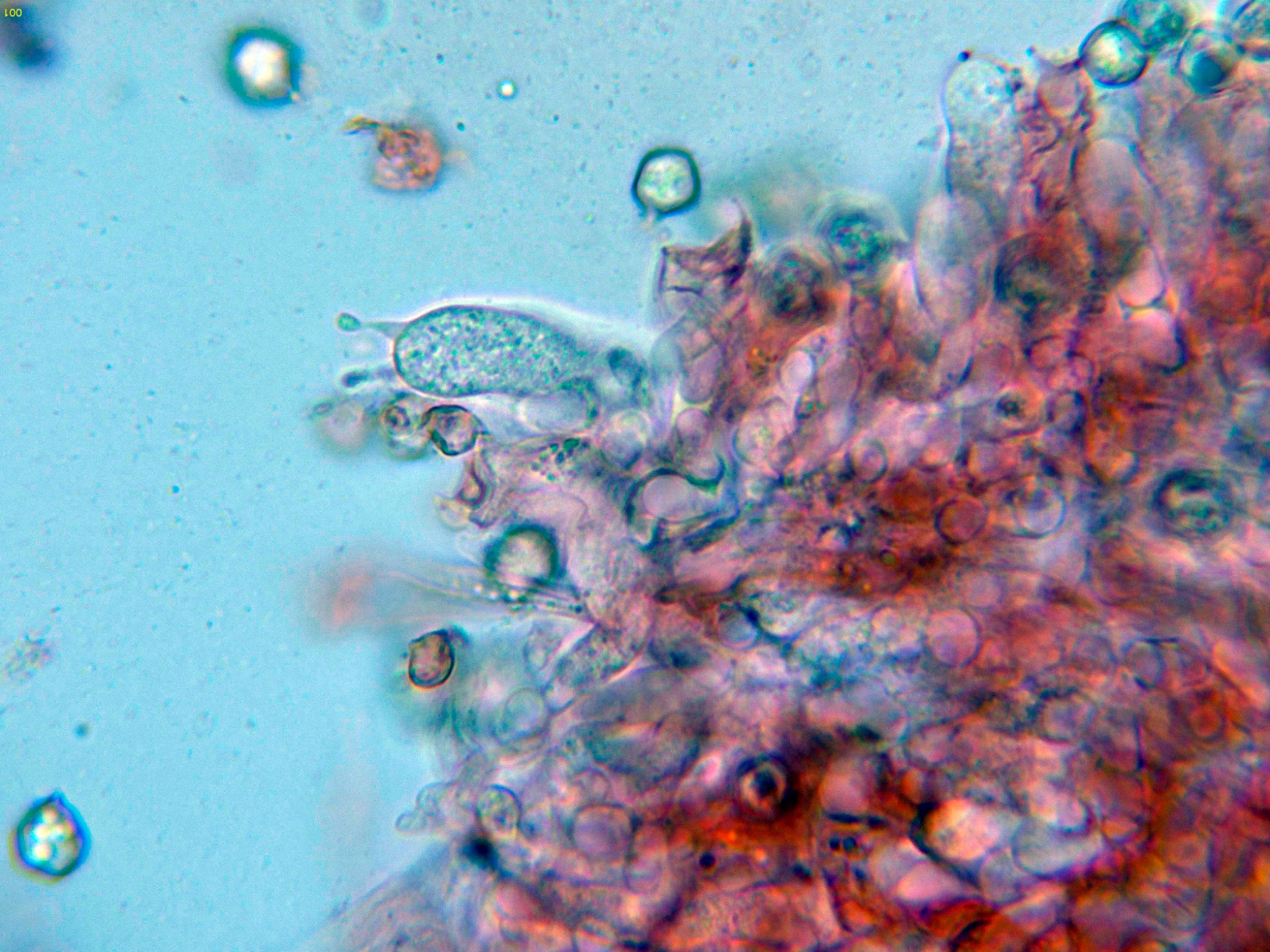 Detalle de la base de los basidios, mayoritariamente sin fíbulas: