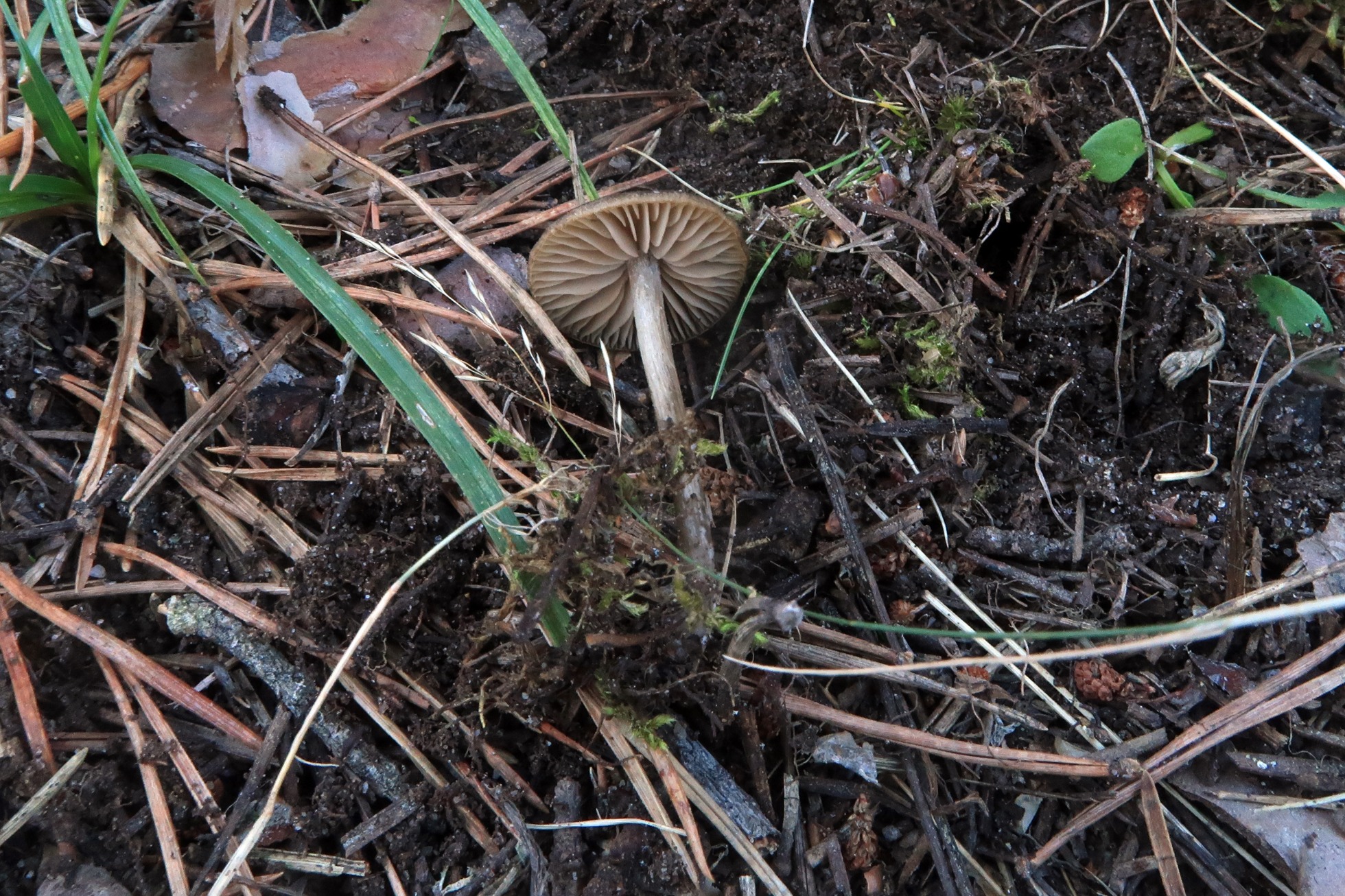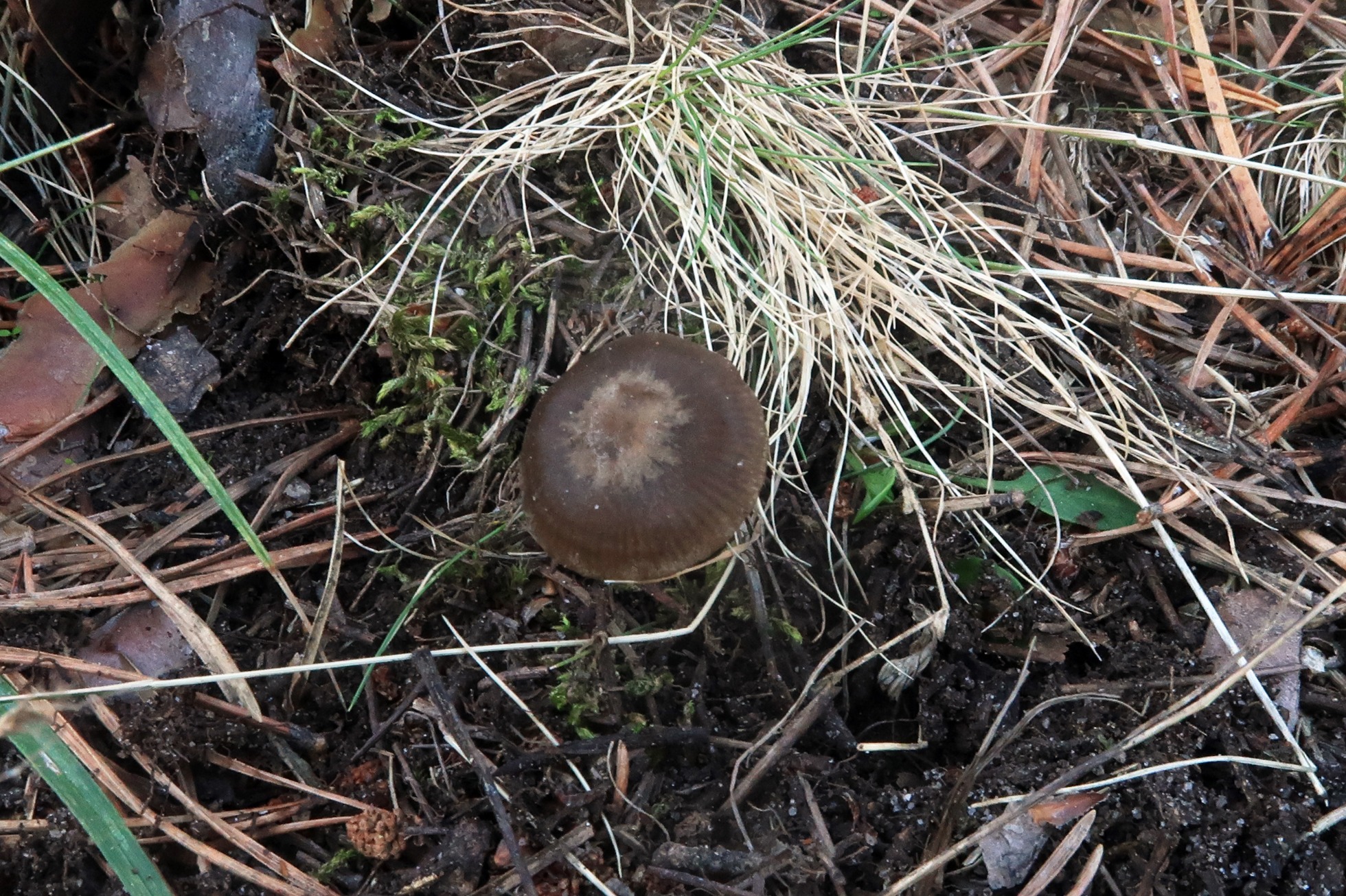Un Entoloma solitario de los de talla pequeña (poco más de 1,5 cm.), brotando entre la hierba y bajo Pinus sylvestris.
