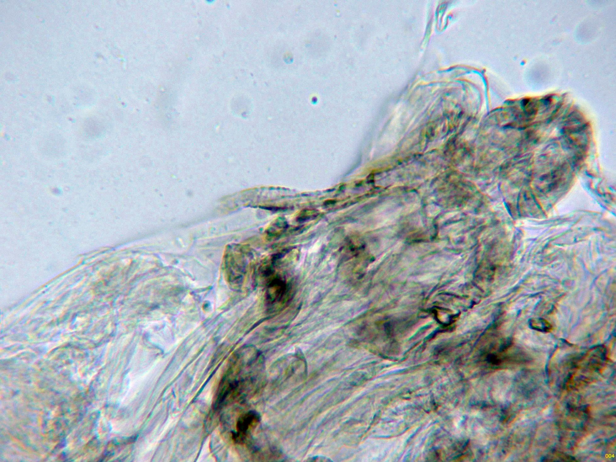 Las hifas de la suprapellis en agua, sin fíbulas y con pigmento intracelular marrón ocráceo.